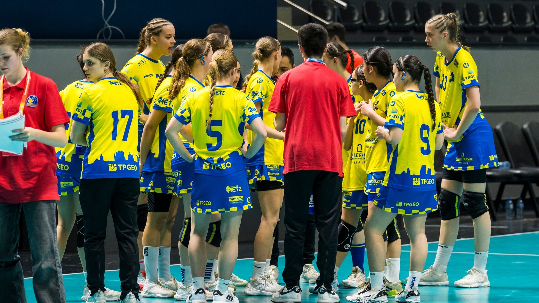 223 Les U17 de Metz Handball disputaient cette semaine la première édition de l’EHF Youth Club Trophy. Bilan de cette première expérience Européenne. C’est une expérience folle que viennent de vivre les jeunes U17 de Metz Handball à Ankara. Seules représentantes françaises pour la première édition de l’EHF Youth Club Trophy, elles ont pu découvrir l’intensité d’une compétition internationale que l’on pourrait qualifier de « Champions League juniors ». Jeudi, opposées à l’équipe Turque de Kepez pour leur premier match, les joueuses d’Edgar le Denn et Samuel Many ont longtemps mené bataille en tenant le +1 puis concédant un écart mince en première mi-temps. C’est en définitive lors de la deuxième période que tout s’est décidé. Rattrapées par l’enjeu et parfois malmenées physiquement, les jaune et bleu multipliaient les maladresses et voyaient l’écart croitre en leur défaveur. Symbole du stress ambiant, deux contre attaques en soliste consécutives qui n’ont pas trouvé les filets. Finalement, le score final ne rendait pas honneur aux capacités messines, dans un match qui ne semblait pas hors de portée, avec une victoire de Kepez 32 à 23. Un match de classement face à Odense pour clore l’aventure Habituées à jouer une fois par semaine et à s’entraîner tous les trois jours, les U17 de Metz Handball devaient rapidement se retourner pour disputer la rencontre de la troisième place face à l’équipe d’Odense, vendredi à la mi-journée. Avec un jeu plutôt convaincant en début de rencontre, les Françaises s’offraient un écart de deux buts avant de caler totalement. Tétanisées, elles retrouvaient leurs esprits à quatre minutes de la fin de la période avec neuf buts de retard pour conclure malgré tout sur une bonne séquence et un coup de canon signé Jeanne Hannen, meilleure buteuse messine, à longue distance. Malgré quelques coups d’éclat, le sursaut ne se prolongeait pas en deuxième mi-temps alors qu’Odense gérait savamment son avance. Dans un jeu parfois décousu de part et d’autre, la pièce retombait rarement du côté messin. Score final en faveur d’Odense 24 à 34. Et maintenant ? Globalement plus en manque de « QI Handball » et de rythme de compétition que de qualités intrinsèques au fil de ce tournoi, il est certain que les jeunes joueuses de Metz Handball auront le regret de ne pas avoir pu revenir d’Ankara avec au moins une victoire dans leurs bagages. Mais l’expérience sportive et humaine tirée de ce déplacement à l’étranger pour se mesurer à leurs homologues de grands clubs Européens devrait durer plus longtemps dans les mémoires que le simple goût de la défaite. Désormais, les U17 messines vont retrouver le championnat national avec un derby en déplacement à Yutz le 11 avril. Suivra un déplacement en Seine et Marne le 18 avril pour conclure avec un dernier match à domicile le 03 mai face à l’entente Sud 93. Les statistiques messines Voici les statistiques en cumulé des deux matchs pour la délégation messine à l’EHF Youth Club Trophy. Gardiennes Juline Hittinger : 8 parades sur 57 tirs Lise Thory : 4 parade sur 21 tirs Joueuses de champ Jeanne Hanen : 20 buts sur 30 tirs Mila Quentin : 5/9 Lina Soubeir : 4/5 Sohane Atmani : 4/5 Janelle Ludwig : 4/6 Zoé François : 3/5 Nila Anduse : 2/5 Caroline Gerard : 2/6 Nina Lenarsic : 1/4 Sofiia Denysova : 1/4 Juliette Losson 1/4 Léa Halter 0/1 Elisa Ghisu Malia Walczak Crédit photo : EHF