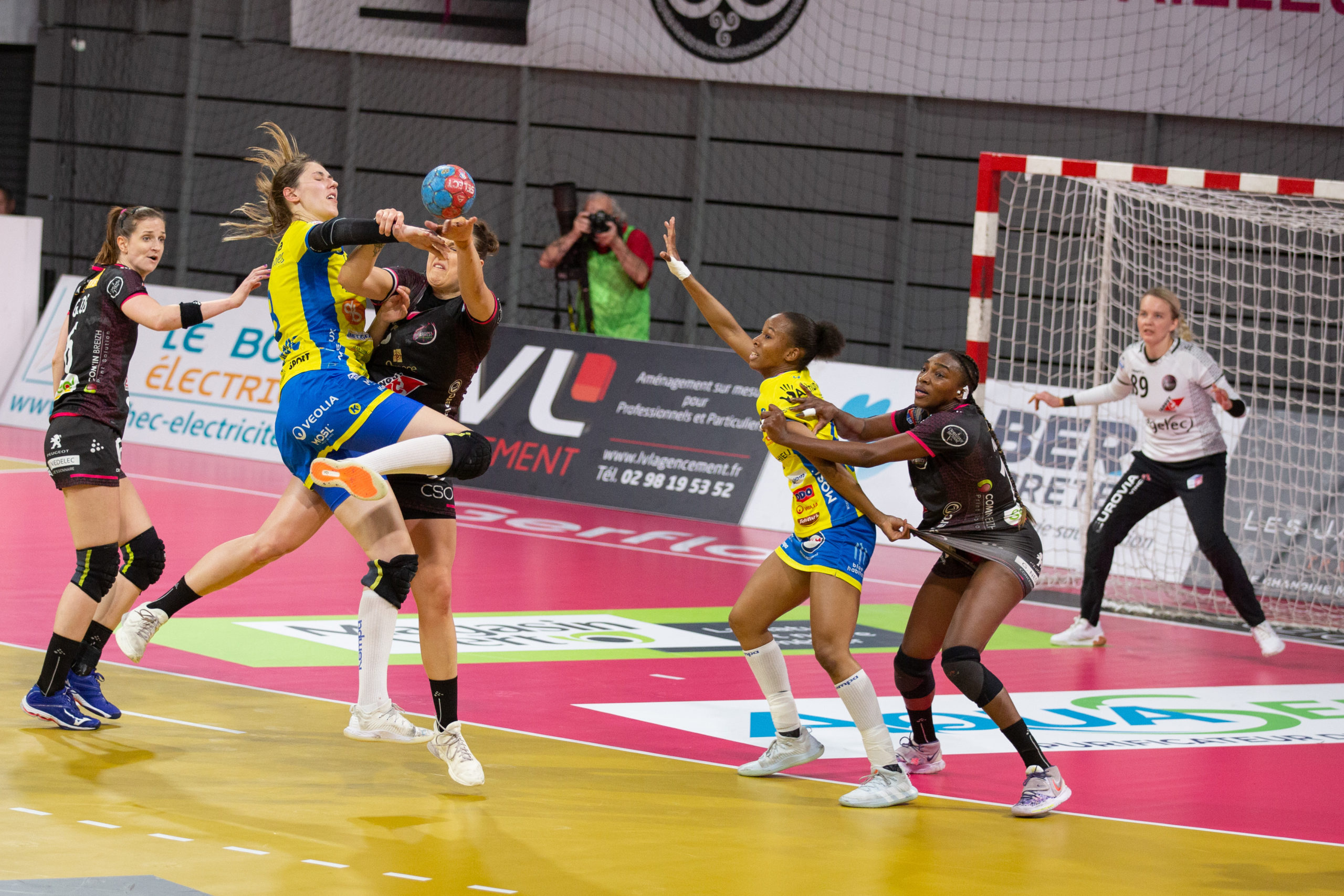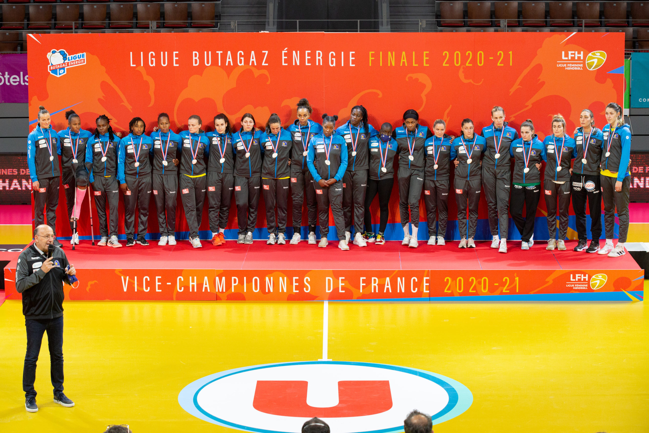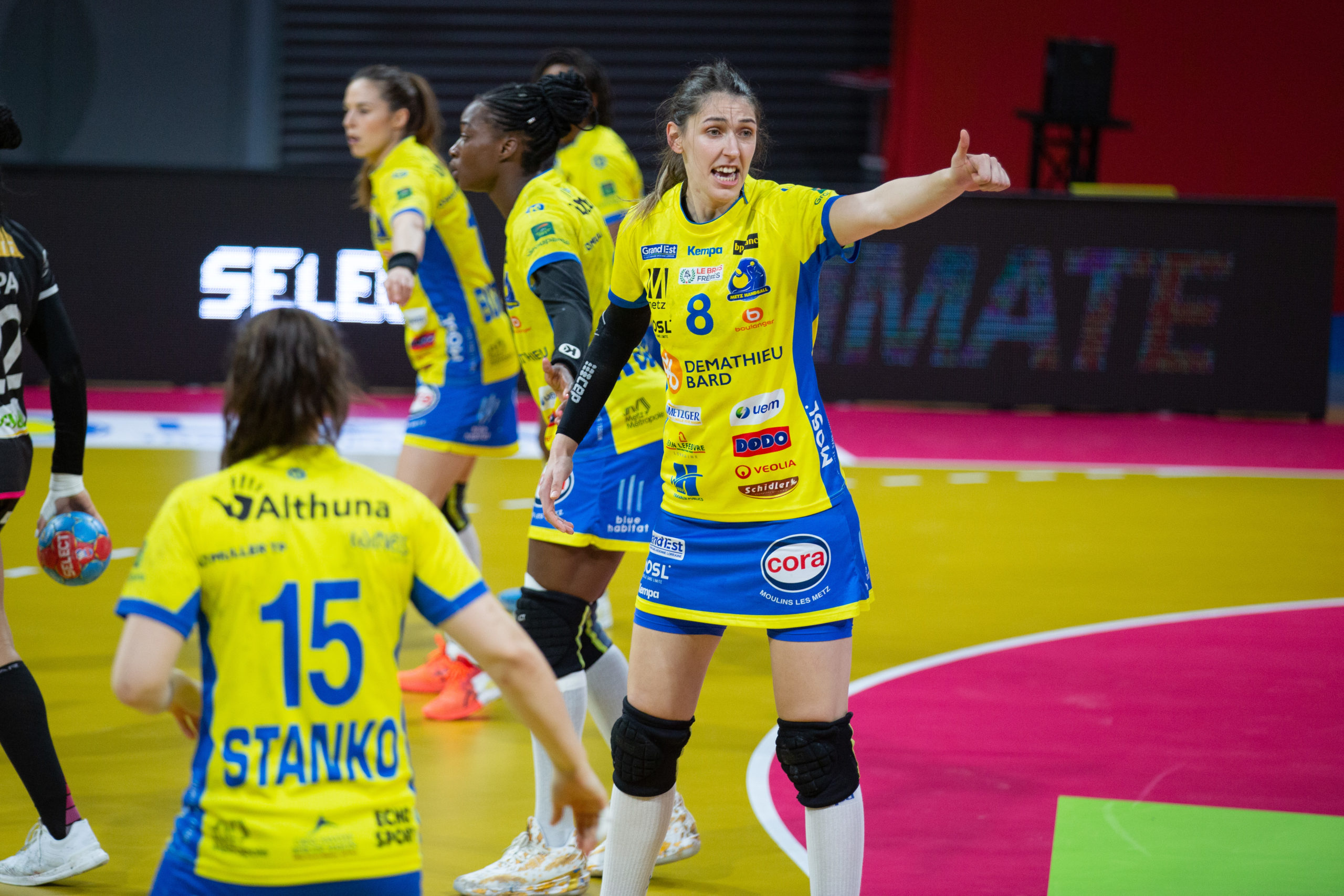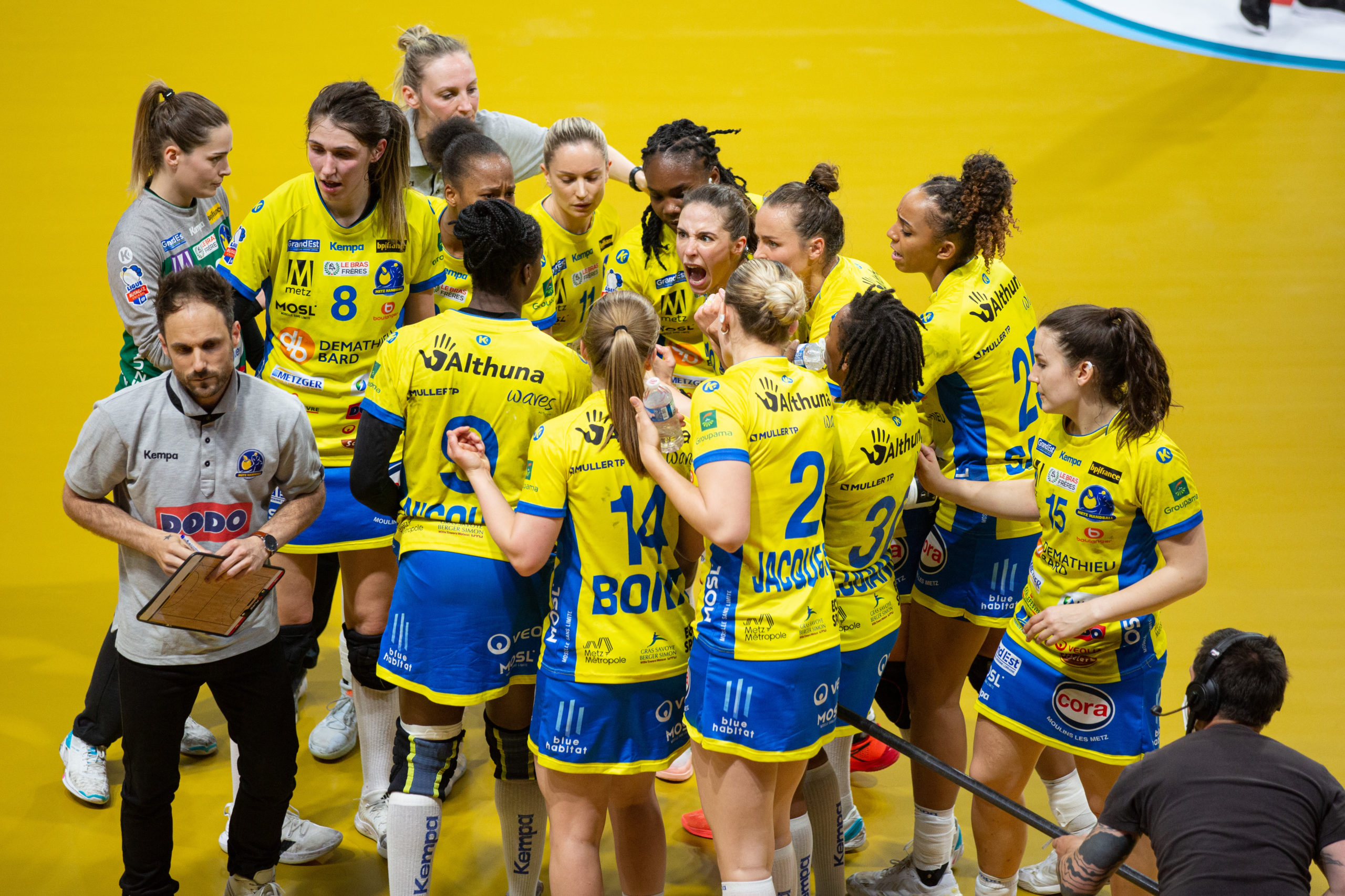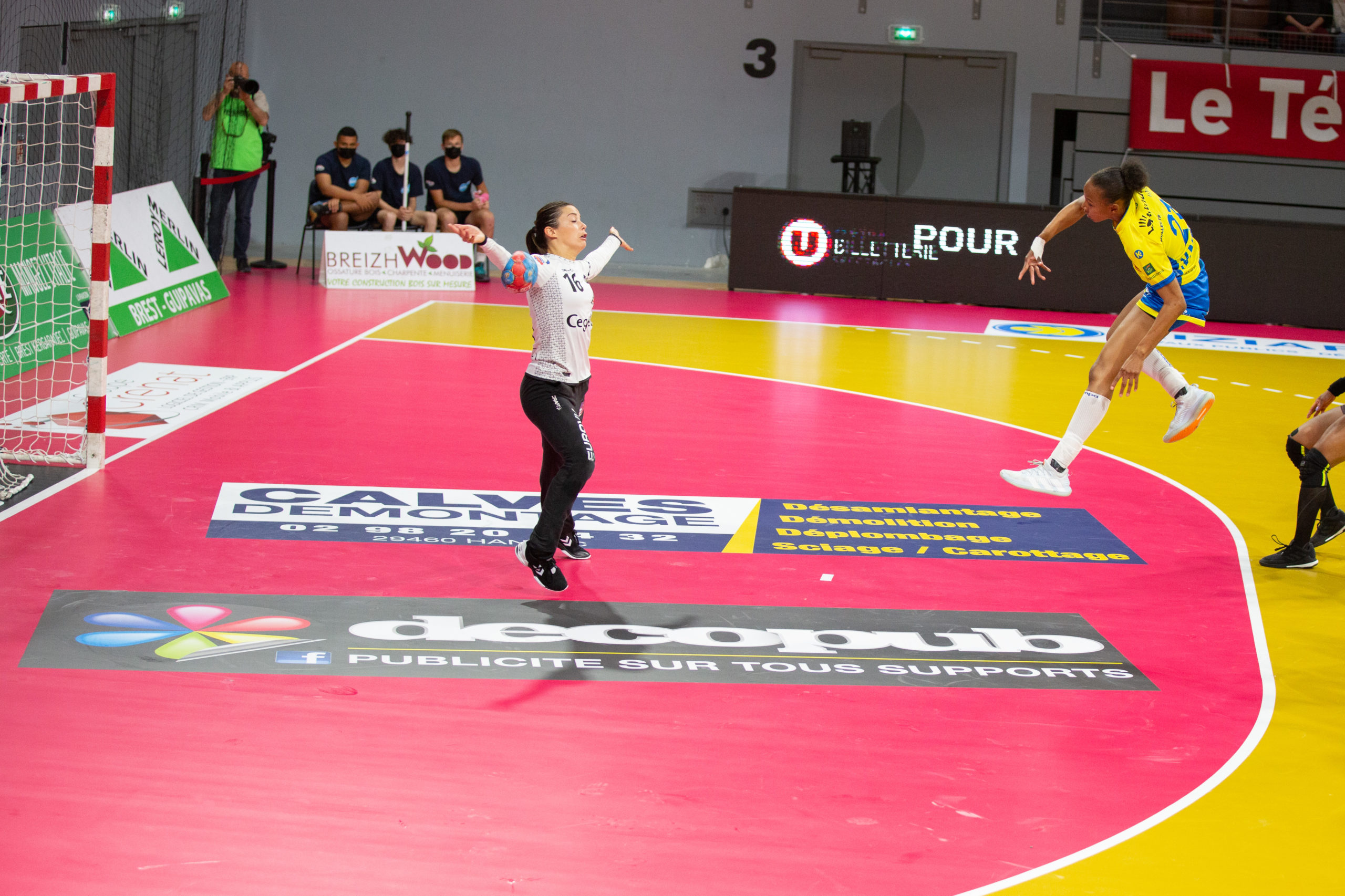 946 Après avoir renversé le rapport de force de la saison face au Brest Bretagne Handball lors du match aller de la finale du championnat, les Dragonnes abordaient ce dimanche le match décisif de 2020/2021 depuis la Brest Arena. Une rencontre remplie de surprises qui s’est close sur le couronnement des Armoricaines. C’est portées par l’énergie d’un succès salvateur de 7 buts face à une équipe qui leur avait pourtant fait défaut pendant 5 matchs de suite que les Dragonnes avaient pris le chemin du dernier match d’une saison mouvementée. Rarement bousculées en Ligue Butagaz Énergie si ce n’est par leur rival de l’ouest, cette finale revêtait un enjeu particulier : celui de ne pas inscrire une saison blanche au palmarès du club et de terminer un exercice marqué par le huis clos et l’emprunte du Covid avec une note victorieuse.A la conquête de la Bretagne, Emmanuel Mayonnade avait pris soin de ne rien laisser au hasard en mobilisant l’intégralité de l’effectif disponible. Pourtant à l’heure du match il a fallu se conformer aux limitations réglementaires et Olga Perederiy, Maud Eva Copy, Daphné Gautschi ainsi qu’Audrey Dembele ont rejoint les blessées Orlane Kanor, Hatadou Sako et Melvine Deba en tribune. Une première mi temps relativement maitrisée C’est malgré la pression de la Brest Arena que les Dragonnes démarraient leur match avec brio. Bien aidée par une entame solide de Dinah Eckerle qui signait un pastis autoritaire dès la 8eme minute. Pourtant alors que les sifflets faisaient appliquer leur première sanction quelques minutes plus tard, l’entrée d’Ivana Kapitanovic n’empêchait pas le premier jet de 7 mètres d’Ana Gros de rejoindre les filets (4-6, 11ème)Si le speaker annonçait par erreur quelques actions plus tard un but d’Ana Gros pour Metz, digne d’un voyage dans le temps, la maitrise était suffisamment jaune et bleue pour contraindre Laurent Bezeau à poser son premier temps mort avant que les choses ne dégénèrent pour les siennes. Camila Micijevic déjà très précieuse en défense contrait un nouveau tir Brestois mais cela n’empêchait pas un but opportuniste de Pauline Coatanea. Sur l’attaque suivante, Méline Nocandy finissait au sol entre deux brestoises et écopait d’une première suspension de deux minutes pour ne pas avoir su libérer le ballon au cœur de l’enchevêtrement de corps. Alors que Metz voyait sa domination s’estomper au gré d’une nouvelle suspension, pour Louise Burgaard cette fois, Emmanuel Mayonnade faisait le choix de sortir sa gardienne pour maintenir son attaque. Un choix qui ne payait pas bien au contraire, offrant aux locales une contre attaque facile et un but longue distance. L’équipe Messine menée pour la première fois de la partie devait alors recourir à un temps mort. (8-7, 20ème)C’est par Yvette Broch que le tableau de marque retrouvait son calme (9-9, 23ème), mais les siennes trop indisciplinées en défense concédaient rapidement de nouveaux jets de 7 mètres, permettant à Ana Gros d’atteindre la barre des 5 buts sans débauche d’efforts. Même si une erreur défensive de Pauletta Foppa l’envoyait sur le banc, les visiteuses ne capitalisaient pas, se heurtant plus souvent qu’à leur tour sur une Cléopatre Darleux bien dans son match. De son côté, Niakaté alourdissait la marque avec la manière et seul un stop autoritaire de Camila Micijevic sur Ana Gros venait sauver la fin de mi temps Messine.Mi temps : 13 à 12 Une longue perte de contrôle en deuxième période De retour de leur vestiaire, les Brestoises entamaient la deuxième mi temps le couteau entre les dents et permettaient à l’ambiance de l’Arena de grimper d’un cran. Sandra Toft, entrée en jeu signait son premier arrêt au meilleur moment avec l’aide d’une solidité défensive retrouvée mais Louise Burgaard passait par un trou de souris pour garder les siennes dans le match. Sur la phase défensive suivante, Méline Nocandy recevait un sévère coup au visage, non sanctionné mais l’obligeant à quitter le terrain en se plaignant d’un œil, véritable cerise sur le gâteau d’un début de période catastrophiques des joueuses d’Emmanuel Mayonnade qui posait alors un temps mort pour calmer le jeu. (18-14, 36ème)L’accalmie s’avérait de courte durée alors que Debbie Bont sortait pour 2 minutes et que les digues jaunes perdaient rapidement en étanchéité. Ana Gros passait alors à coté de la première occasion de passer le critique +7 et Méline Nocandy prenait les choses personnellement en inscrivant un but de soliste pour garder les siennes à flot, une opération mal récompensée puisqu’un mauvais retour en défense laissait le loisir à Coatanea de venir inscrire un nouveau but. (21-15)Alors que Camila Micijevic restait au sol après une nouvelle projection de Jaukovic non sanctionnée, Ailly Luciano prenait l’initiative avec son tir « spécial » bien négocié. A ce moment de la partie les Brestoises obtenaient un nombre conséquent de secondes chances alors que chaque arrêt de Dinah Eckerle se voyait sifflé pour une faute antérieure, privant les Messines d’air. Pourtant après une période compliquée les messines sortaient la tête de l’eau et réduisaient l’écart, poussant Laurent Bezeau à prendre une minute d’ajustement tactique (22-18, 45ème). Suite à cela, l’écart se stabilisait sensiblement mais chaque coup d’accélérateur Brestois se montrait payant, si bien que le but du +7 était à nouveau inscrit à la 51ème. Sur l’action suivante Jaukovic envoyait une nouvelle fois Micijevic au sol et écopait (enfin) de 2 minutes de suspension. Incapable de stopper l’hémorragie et au cœur d’un chaudron de plus en plus bruyant, les Messines concédaient le but critique du +8 par l’intermédiaire de Pauletta Foppa (28-20, 52ème), permettant à tout le camp Breton d’exulter au bout de l’effort. Malgré cel