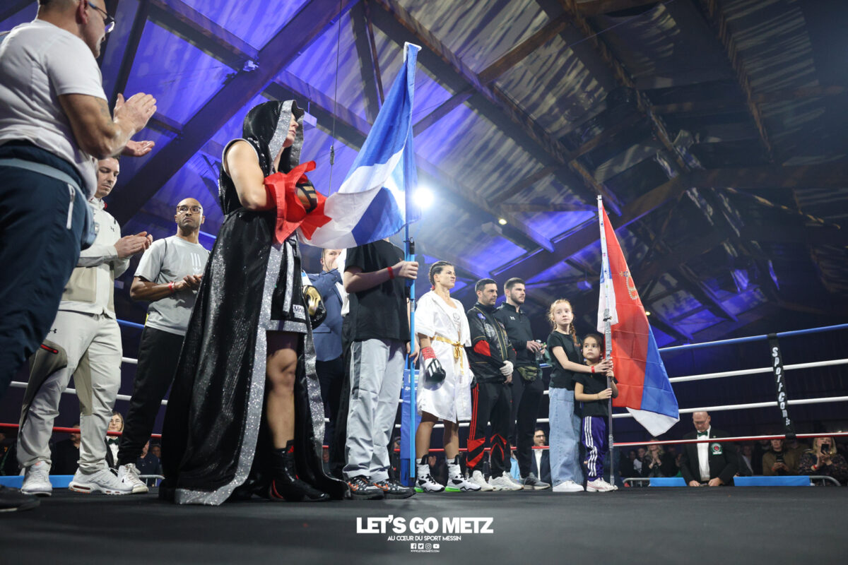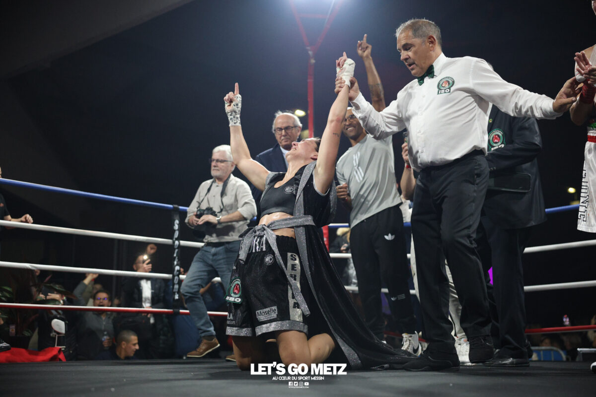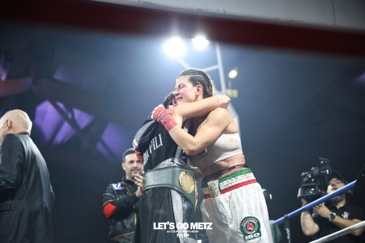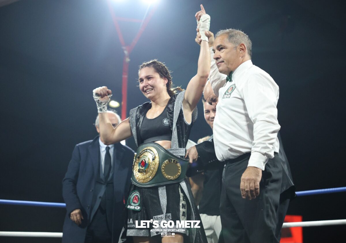 153 La boxeuse Flora Pili a remporté la ceinture mondiale IBO face à la Serbe Jelena Janicijevic ce vendredi soir à l’Agora de Saint-Avold. Il faut en faire l’expérience pour le comprendre pleinement. Flora Pili est une sportive à part. Ce vendredi à près de minuit elle était la dernière à descendre du ring de l’Agora à Saint-Avold après avoir pris inlassablement des centaines de photos avec ses proches, ses amis, supporters et parfois mêmes inconnus, ceinture de championne du monde IBO sur l’épaule. Aucune distinction, l’échange débute toujours de la même manière : « alors, tu as kiffé ? ». Ici, le « tu » est très important et le « je » vient beaucoup plus tard dans la conversation, même après avoir livré une bataille de dix rounds face à une Serbe particulièrement coriace. Une heure et demi plus tôt, la Naborienne faisait son entrée dans « sa » salle, celle qui l’a vue devenir championne de France en 2022, défendre une ceinture EBU en 2023 et gagner, puis défendre, une ceinture intercontinentale WBO en 2024 et 2025. Cachée encore quelques instants derrière le rideau des coulisses, une vidéo passe dans l’écran géant, Flora s’adresse là aussi à son public. Celui qui l’a toujours soutenue et portée jusqu’aux sommets. Il n’en fallait pas plus pour que la salle exulte et l’accueille de la plus belle des manières. Quelques mètres séparent la boxeuse du ring, elle les arpente alors d’un pas calme à l’image de la sobriété de sa tenue de combat : noire, simplement ornée de son nom et de celui de sa fille Serena. Une sobriété qui ne faisait que retarder le feu qui allait s’allumer sur le ring quelques instants plus tard. Jelena Janicijevic, l’adversaire du jour, n’est pas venue faire de figuration et ouvrait en effet les hostilités avec une énergie folle, forçant la locale à s’adapter. Véritable diesel, et entraînée comme telle, Flora Pili montait en intensité au fil des rounds, tout comme les encouragements du public, tandis que son adversaire perdait en constance, émoussée par les minutes de lutte mais aussi par les coups reçus. Adepte de l’esquive et du contre, la Française plaçait savamment ses offensives pour créer des dégâts de manière opportune jusqu’à la cloche finale. Si la décision des juges s’avérait plus serrée qu’à l’accoutumée, c’est bien une Mosellane qui remportait son premier sacre mondial à l’issue des débats. « Un rêve de petite fille » pour celle qui prenait le micro au centre du carré de combat pour remercier ceux qui l’ont guidée jusque là, marquant avec émotion le nom de son grand père, qui a initié la belle histoire familiale. Une nouvelle ceinture mondiale en ligne de mire Dans les coursives de l’Agora, une fois les grandes lumières éteintes et alors que la ceinture mondiale IBO passait de mains en mains comme pour partager la victoire avec tous, Flora Pili avouait volontiers ne pas encore réaliser pleinement sa réussite du jour. Pourtant au détour des conversations un prochain objectif se dégageait déjà : la conquête du titre IBF, une fédération encore plus prestigieuse. Katie Taylor en est la championne en titre mais a choisi de mettre sa carrière entre parenthèse et semble désormais plus intéressée par les combats lucratifs face à des célébrités que par la conquête du noble art, ce qui laisse la ceinture vacante. Encore une histoire de « je » et de « tu » probablement.Une chose est sure, peu importent les adversaires ou les échéances, le clan Pili, et Pietro le papa / coach en première ligne, ne va pas se reposer de si tôt. De l’aveu de Flora, 2026 pourrait être l’année la plus importante de sa carrière… À Saint-Avold où ailleurs, le peuple de la boxe mosellane sera derrière elle. La galerie du combat Crédit photo : Nicolas Martino / Let’s Go Metz