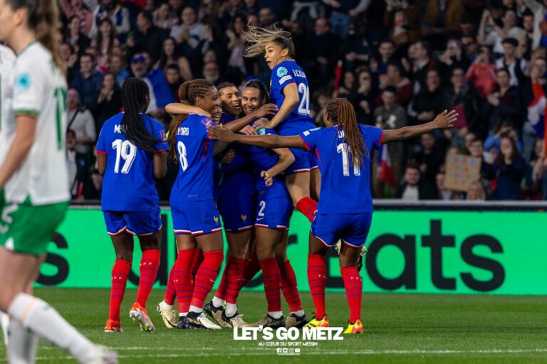 1,4K Ce vendredi 5 avril à Metz, l’Équipe de France féminine de football a fait le strict nécessaire contre l’Irlande. Victoire 1-0 des Bleues au stade Saint-Symphorien, dans le cadre du premier match des éliminatoires de l’Euro 2025. L’Équipe de France à Metz, c’est toujours un évènement. Près de 16 772 spectateurs, armés de Bleu, de Blanc et de Rouge, évidemment, sont venus soutenir les filles d’Hervé Renard, ce vendredi au stade Saint-Symphorien, profitant par la même occasion des diverses animations entourant la rencontre. Un net contraste avec la dernière venue des Bleues en Moselle, en pleine pandémie, dans un stade vide, à l’occasion d’une rencontre amicale contre la Suisse (2-0). Au-delà du symbole messin, la sélection nationale qui se déplace à travers le pays, c’est un vecteur important pour la promotion du football féminin. « C’est important, ce n’est pas la première fois que l’Equipe de France féminine joue à Metz. C’est l’un des endroits où on sait que l’on va faire une belle affluence. Saint-Symphorien est un très bon public. C’est bien de pouvoir véhiculer le football féminin à travers la France. On espère que toutes les villes seront derrière nous pour les Jeux Olympiques. Félicitations aux filles, elles avancent, il faut continuer dans cette trajectoire et attirer encore plus de monde pour avoir plus de visibilité et la reconnaissance qu’elles méritent », encourage le sélectionneur français. 🇫🇷🇮🇪 L’entrée de l’Équipe de France et de l’Irlande ! #FRAIRL pic.twitter.com/OqrUIGh7qk— Let's Go Меtz (@letsgomtz) April 5, 2024 La France fait le strict minimum Passé ce côté évènementiel, l’Équipe de France disputait un match important contre l’Irlande. Si la prestation des Bleues peut être jugée poussive, à l’égard de leur supériorité sur le papier, elles ont eu le mérite de lancer de la meilleure des manières leur campagne d’éliminatoires pour l’Euro 2025, avec trois points dans la besace. Les Tricolores se sont imposées 1-0 grâce à un but de Marie-Antoinette Katoto. L’ouverture du score très rapide (6’) de l’attaquante du PSG, opportuniste après une remise de Lakrar sur un coup franc de Dali, semblait pourtant lancer les Bleues sur une voie royale. Mais les protégées d’Hervé Renard ont peiné à se créer des occasions franches, malgré une possession de balle délirante (74 %). Pour preuve, Dali devait s’essayer de loin pour mettre à contribution Brosnan (33’). La gardienne irlandaise sortait le grand jeu avec une nouvelle claquette (65’), pour repousser une tête d’Eugénie Le Sommer, chaudement ovationnée à son entrée en jeu, comme ses coéquipières Wendy Renard et Amandine Henry. Une entrée qui a eu le mérite de dynamiser un match quelque peu ennuyeux, qui aurait même pu tourner au cauchemar si O’Sullivan n’avait pas complètement snobé sa partenaire, seule dans la surface face à Peyraud-Magnin (87’). Dans le temps additionnel, Becho était proche de marquer le but du 2-0 (90’+2), mais le score en restait là. Le déplacement des Bleues en Suède, mardi 9 avril à 19h, sera assurément une tout autre paire de manches. France 1-0 Irlande Mi-temps : 1-0. But pour la France : Katoto (6’). France : Peyraud-Magnin – Périsset (Renard 77’), Mbock, Lakrar, Karchaoui – Geyoro (cap), Toletti (Henry 77’), Dali – Diani (Baltimore 84’), Katoto (Le Sommer 62’), Cascarino (Becho 62’) Irlande : Brosnan – Murphy (Campbell 46’), Lo, Quinn, Hayes, Patten – O’Sullivan, Connolyy, Payne (Kiernan 64’) – McCabe (cap) – Mannion (Stapleton 90’), Carusa (Barrett 64’, puis Quinn 74’) Crédit photo : Julien Buret/LGM.