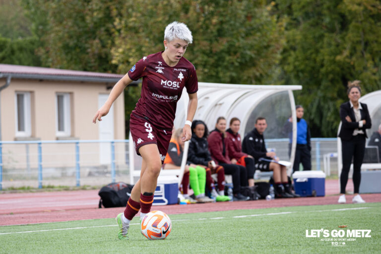 885 Lucie Calba a cartonné à la dernière coupe du monde U18 féminine en Inde avec l’Equipe de France. Un bilan très satisfaisant pour la messine mais très décevant pour les Bleuettes, qui repartent de cette compétition sans la moindre victoire. Lors du premier match, qui a eu lieu mercredi 12 octobre, les Françaises se sont fait accrocher par les canadiennes (1-1). Lucie Calba était titulaire lors de ce match, elle a même permis à son équipe de recoller au score à la 73ème minute, grâce à un beau but de la tête suite, à une passe de la Rémoise Shana Chossenotte. Un match fût d’une grande frustration pour les françaises, qui méritaient mieux qu’un match nul avec 22 tirs. La douche froide contre la Tanzanie La deuxième rencontre a eu lieu samedi 15 octobre et a vu la France s’incliner 2 à 1 face à la Tanzanie. Les Bleuettes ont eu beaucoup de mal à mettre en difficulté l’équipe adversaire, avec beaucoup de déchet technique et un manque de réussite dans la dernière passe. De nombreuses erreurs qui ont permis aux Tanzaniennes de mettre à l’amende les protégées de Cécile Locatelli. Menées 2 à 0 à la 60ème minute, les Françaises ont su réagir grâce à un nouveau but de la Messine Lucie Calba, sur penalty. Un match réussi pour l’attaquante grenat, sur le plan personnel, puisqu’elle venait inscrire son deuxième but en deux matchs. Insuffisant pour empêcher la défaite des siennes. Une élimination face au Japon Le dernier match a eu lieu ce mardi 18 octobre dernier, les filles de Cécile Locatelli ont perdu 2 à 0 face au leader de leur groupe, le Japon. Une défaite synonyme d’élimination pour les Bleuettes, qui n’auront remporté aucun match lors de cette coupe du monde. Il fallait un exploit mais de nouveau, les françaises n’ont pas été à la hauteur et ont été dominées tout le match par une sérieuse équipe japonaise. Ce qui sonnait malheureusement le glas de l’aventure en Inde pour Lucie Calba et l’Equipe de France, qui n’ont pas réussi à atteindre les quarts de finales.Lucie Calba aura joué l’intégralité des trois rencontres. Un bilan individuel très satisfaisant pour la buteuse messine qui a inscrit deux buts en trois rencontres, seule buteuse française de la compétition. Après avoir obtenu la troisième place au dernier euro, les féminines attaquaient cette coupe du monde avec de grandes ambitions qu’elles n’ont pas réussi à accomplir. Crédit Photo : Julien Buret / Let’s Go Metz