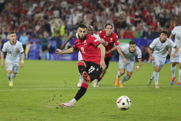 2,K Passeur décisif puis buteur face au Portugal, Georges Mikautadze a guidé la Géorgie jusqu’aux huitièmes de finale de l’Euro 2024. Avant le début de l’Euro 2024, rares sont ceux qui auraient misé leurs économies sur l’équipe nationale géorgienne. Rares sont même ceux qui auraient été capables de nommer plus de deux joueurs géorgiens… Et pourtant, Georges Mikautadze et ses coéquipiers viennent de placer la Géorgie en huitième de finale de la prestigieuse compétition européenne. Pourtant, pour le dernier match décisif de la phase de groupes c’est un monstre qui se présentait face aux « croisés » de Willy Sagnol : le Portugal. Déjà qualifiée pour le tour suivant, la Seleção s’était permis de faire tourner son effectif sans pour autant se délester d’une ossature solide guidée par Cristiano Ronaldo. Loin de ces considérations, Kvaratskhelia frappait dès la deuxième minute, bien servi par Georges Mikautadze, pour ouvrir le score.Le Messin, doublait quand à lui la mise sur penalty à la… 57ème minute, pour redevenir le meilleur buteur de la compétition avec trois réalisations en autant de matchs. Un score qui restait en définitive figé dans un match marqué par le manque d’inspiration général portuguais et surtout, l’incroyable énergie collective géorgienne. Grâce à cette victoire 2 à 0 la Géorgie pourra s’assoir à la table des grands dimanche à 21h dans le cadre d’un premier huitième de finale historique face à l’Espagne. Crédit photo : Icon Sport