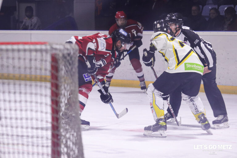 622 Les Graoullys de Metz Hockey Club continuent leur marche en avant, en s’imposant 5-1 contre l’équipe réserve de l’Etoile Noire de Strasbourg. Avec ce succès, les Messins enchainent une quatrième victoire de rang et pointent à la première place de la Poule C en D3. Les Messins devaient poursuivre leur série positive face à l’actuel dernier de la poule, Strasbourg. Et c’est chose faite ! Après un premier tiers-temps serré où Franck Stroppolo inscrivait le premier but de la rencontre pour les messins. Le Metz Hockey Club passait la seconde dans le deuxième tiers-temps et se détachait de son adversaire du jour. Les Mosellans pousseront encore la rondelle à 4 reprises dans les cages strasbourgeoises.Deux fois lors du deuxième tiers-temps, où Thomas Stablo et Yannick Hamri sont venus concrétiser la domination messine. Dans le dernier tiers-temps, les Graoullys enfonçaient le clou. Dès l’entame Nathan Casula aggravait le score. La réponse de l’Etoile Noire de Strasbourg arrivait en fin de rencontre par l’intermédiaire de Lambert-Jams. Directement après ce but encaissé, les Graoullys donnaient un dernier coup de collier et Thomas Dubourg inscrivait le dernier but de la rencontre. Score final 5-1. Metz Hockey Club 5-1 Strasbourg Tiers-temps : 1-0, 2-0, 2-1. Buts pour Metz : Stroppolo (12’58), Stablo (28’26), Hamri (34’19), Casula (40’13), Dubourg (56’45) ; pour Strasbourg : Lambert-Jams (55’59) Statistiques Stroppolo 2 points (1 but, 1 assist) Zeliska 2 points (2 assists) Leheron 1 point (1 assist) Maccioni 1 point (1 assist) Hamri 1 point (1 but) Benchabane 1 point (1 assist) Esipov 1 point (1 assist) Stablo 1 point (1 but) Casula 1 point (1 but) Dubourg 1 point (1but) Vorobyev 1 point (1 but) Classement de la poule C de D3. Crédit photo : Lilian Bordron / LGM