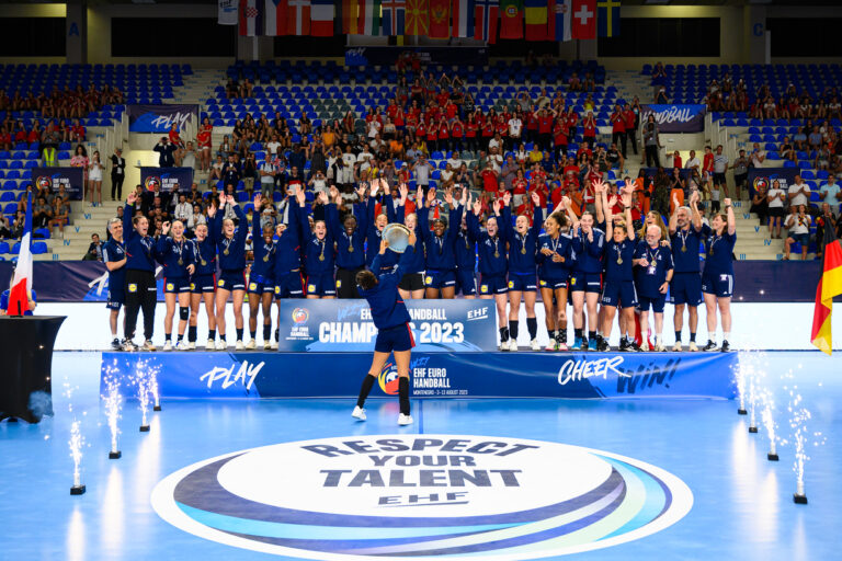 575 Sur le pont depuis le 1er juillet, l’équipe de France de Handball u17 a conclu son été par un titre européen face au Danemark (19 à 24). La génération 2006/2007 promet des jours heureux pour le Handball hexagonal. On ne l’arrête plus. Quinze jours après sa médaille d’or au Festival Olympique de la Jeunesse Européenne, l’équipe de France de Handball u17 repart à la maison avec une médaille d’or après une victoire face au Danemark. Quasiment invaincues au Monténégro, les nouvelles protégées d’Olivier de Lafuente ont dominé leur Championnat d’Europe. Une équipe confiante de ses forces Pourtant, l’entame de ce dernier ne s’est pas passé comme attendu. Plongées dans le grand bain face à la Hongrie, une grande force des catégories jeunes, les Bleues ont débuté la compétition avec un retard de cinq unités avant d’inverser la tendance en seconde période. Finalement, les jeunes françaises ont frappé un grand coup en s’imposant 28 à 33 devant une nation qui ne s’était plus inclinée depuis 18 août 2017, chez les moins de 17 ans. Dès lors, ce collectif pouvait construire son chemin avec confiance dans un groupe qui comportait également la Roumanie et la Macédoine. Mais affronter les Roumaines n’a pas été une sinécure puisqu’un schéma similaire s’est reproduit, le lendemain. Après 60 minutes de combat très physique, les Françaises ont poursuivi leur dynamique face à leurs homologues (victoire 27 à 23) avant de dicter leur loi à la Macédoine (31 à 15). En arrivant au tour principal avec le maximum de points, l’équipe de France était en pole position pour atteindre le carré final. Il fallait toutefois confirmer et bien négocier cette avance avec le premier match. Ce qu’ont allègrement proposé les Bleuettes en disposant largement des Pays-Bas (32 à 18) pour valider définitivement leur qualification en 1/2 finale avec le match nul des Danoises et des Hongroises. Ainsi, la France abordait la rencontre suivante sans pression. Ce qui n’était pas le cas du Danemark qui avait l’obligation de s’imposer pour éliminer la Hongrie. Comme une piqûre de rappel ou non, les Tricolores ont connu leur première défaite estivale face à des Danoises insatiables (25 à 20). Un carré final en apothéose et des Messines à la fête Sans grande conséquence, malgré la perte de la première place. En effet, deux jours plus tard, les u17 ne tombaient pas dans le piège d’une Allemagne invaincue. Si les Allemandes sont longtemps restées au contact, l’équipe de France de Handball u17 a accéléré le pas en seconde période pour gagner sa 1/2 finale et rallier la finale. Une première depuis 2007. Ici, elle retrouvait alors le Danemark, le seul bourreau de sa compétition. Mais durant les dernières 60 minutes de la compétition, les u17 ont montré un visage bien différent de la précédente confrontation. Avec de l’engagement, du collectif et une défense étouffante, la génération 2006/2007 a conquis l’Europe en maîtrisant les Danoises de bout en bout. Ainsi, Metz Handball voit de nouvelles pensionnaires avec une médaille autour du cou par la présence des très performantes Claire Koestner (15 buts en 28 tentatives, 37 passes décisives) et Léane Gonzalez (70 parades sur 152 tirs soit 46% de réussite). De quoi voir très loin pour le Handball français, si confirmation il y a. Crédit photo : Stefan Ivanovic/Match Lens
