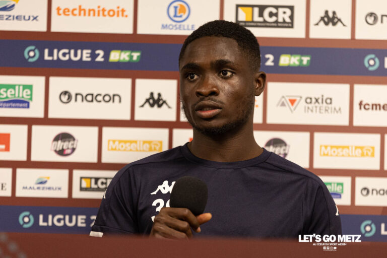 504 Après la victoire en amical face au SV Elversberg, Koffi Kouao s’est présenté face à la presse. L’occasion pour lui de revenir sur ce match et cette victoire à l’arrachée. Le latéral messin en a également profité pour évoquer les bienfaits du stage en Espagne, et dresser un état des lieux des troupes avant la reprise. Dans un premier temps, Kofffi Kouao s’est exprimé sur cette victoire difficile face à Elversberg lors du dernier match de préparation. S’il est conscient des difficultés de ce groupe, l’ivoirien s’est toutefois montré satisfait du travail réalisé. « Je pense que l’on a bien entamé la rencontre, mais que l’on n’a pas su finir les actions. », regrette le latéral droit messin. « Il fallait gagner de la confiance pour le match de reprise face à Niort. Ça a été dur, mais on a fini par gagner. », rassure Koffi Kouao. « C’était un match qui servait de préparation, mais il fallait aussi gagner pour se mettre dans les meilleures dispositions pour la réception de Niort lundi. » glisse le défenseur messin, conscient de l’enjeu de ce match. « Il reste encore beaucoup de choses à corriger évidemment, mais je pense que nous avons fait une bonne préparation. », se réjouit Kouao après une rencontre compliquée, mais au dénouement victorieux. « Physiquement dans un premier temps, puis avec le ballon, notamment cette semaine. Je pense que l’on sera prêts pour lundi. » Le joueur du club à la Croix de Lorraine a également reconnu l’impact du discours du coach à la mi-temps. « Le coach nous a dit a la mi-temps de mettre beaucoup d’impacts. Je pense que cela s’est vu en deuxième mi-temps. Ça a été la clé de la remontée. Les équipes allemandes jouent avec beaucoup de physique, et c’est ce qui nous a mis à mal en première mi-temps, et qu’on a réussi à corriger. » Koffi Kouao, arrivé en août, s’est progressivement fait sa place au sein du club à la croix de Lorraine. Koffi Kouao : « Après le match contre Guingamp, le groupe a beaucoup souffert » Après trois défaites en autant de matchs de préparation, les grenats se devaient de rebondir face à une solide équipe allemande. Cependant, Koffi Kouao ne semblait pas s’inquiéter de ces résultats pour autant. « Pendant ce stage, on était surtout sur un travail athlétique et les jambes étaient un peu dans le dur. Pour nous, c’était une semaine physique, contrairement aux deux autres équipes qui n’étaient pas au même stade de la préparation que nous. Ça n’a pas eu d’impact sur la confiance. On a fait des bons matchs malgré tout. Maintenant, il faut qu’on arrive à ne plus prendre autant de buts. On va essayer de corriger cela au mieux possible dès lundi » Par ailleurs, le natif d’Abidjan en a profité pour reconnaître les bienfaits de ce stage à Benidorm, en Espagne. « On a bien bossé en Espagne, c’était dur, mais c’était le but de ce stage. Ça se voit chez ceux qui ont fait plus de 45 minutes aujourd’hui. Mais c’était bien, ça a renforcé notre esprit d’équipe et insufflé un côté familial à tout cela. Après le match contre Guingamp, le match a beaucoup souffert. Et cette notion de famille nous a permis de remonter la pente. Le stage en Espagne a renforcé cela, nous a tous fait nous remettre en question. On s’est aussi tous remis au travail, de manière sérieuse et familiale. Désormais, il faut que ça continue. » Koffi Kouao lors du match contre l’AS Saint-Étienne. Enfin, le Messin a dressé l’état des lieux des ambitions des grenats à la reprise. À commencer par la réception de Niort à venir dès lundi. « On avait hâte après cette longue trêve. On s’est bien préparé pour, j’espère que l’on sera tous au rendez-vous et que l’on va continuer la série entamée avant la trêve. En tout cas, on fera tout pour. Il va falloir garder cette humilité en ayant toujours en tête que rien n’est fait, que l’on revient de loin, et que tout peut basculer à tout moment. Si l’on continue sur cette lancée et en se sacrifiant chacun pour l’équipe, je suis convaincu que l’on va pouvoir aller chercher de belles choses. » Crédit photo : Julien Buret et Lilian Bordron / Let’s Go Metz