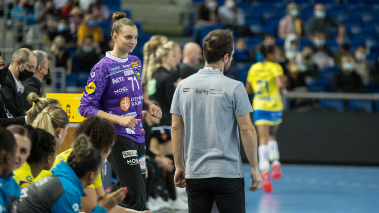 562 Face à Odense la solution est venue d’un secteur inatendu. Mélanie Halter a réalisé une entrée remarquable pour compenser l’absence d’Hatadou Sako et la méforme d’Ivana Kapitanovic. Parfois, les étoiles s’alignent autour d’un terrain de handball. Ce Samedi, Mélanie Halter en a profité. Pensionnaire du centre de formation, la gardienne de 18 ans ne pensait certainement pas être propulsée du jour au lendemain sur le terrain d’un match important de Ligue des Champions. Pourtant elle en a changé la trajectoire. Retour sur les évènements. La blessure d’Hatadou Sako Gardienne principale de Metz Handball cette saison, Hatadou Sako a vu son destin prendre un virage mercredi lors de la réception de Krim Mercator. Restée au sol dans sa zone après une offensive Slovène, l’ex internationale Sénégalaise quittait le terrain. Si les premiers signes laissaient espérer une blessure sans grande gravité au genou, des examens le lendemain ont révélé une rupture du ligament croisé, actant une fin abrupte à la deuxième saison en jaune et bleu d’Hatadou Sako. Un coup dur à encaisser, mais qui ne l’a pas empêchée d’être présente auprès des siennes pour la réception d’Odense. Honorée au centre du terrain par les supporters avant la rencontre, la joueuse numéro 99 n’a pas pu retenir quelques larmes avant de s’installer en tribune, non loin du banc messin. Un poste stratégique depuis lequel elle a pu vivre le match au maximum, alternant naturellement les émotions mais sans oublier de crier ses encouragements et ses précieux conseils. L’âme d’une leader en action. La méforme d’Ivana Kapitanovic Naturellement, tous les espoirs de cette rencontre importantes étaient incarnés par Ivana Kapitanovic. Metz Handball s’étant mis en quête d’un joker le plus vite possible, avec des cibles comme Amandine Leynaud, Laura Glauser ou encore Camille Depuiset, le délai était bien trop court pour doubler le poste de gardienne pour la troisième rencontre de la semaine. La Croate était donc destinée à disputer toute la rencontre face à Odense. Mais, apparaissant particulièrement en méforme, elle poussait Emmanuel Mayonnade et Katya Andryushina à envisager les choses différemment. Peu après la dixième minute de jeu de la deuxième mi temps, Ivana Kapitanovic qui était alors créditée d’un seul arrêt pour 26 tirs, cédait sa place. Le grand jeu Pendant tout ce temps, Mélanie Halter prenait son mal en patience. Concentrée en bout de banc et frémissant à chaque but des Dragonnes avec, on l’imagine, le mince espoir de participer à l’évènement de manière plus active. Il aura finalement suffi d’un signe d’Emmanuel Mayonnade pour lancer la machine. Ni une, ni deux, la jeune gardienne entamait son échauffement derrière le banc, les oreilles remplies des précieux conseils d’Alexandra Hector, entraineur des gardiennes. Un nouveau but encaissé envoyait Ivana Kapitanovic sur le banc et la protégée de Clément Alcacer s’élançait dans la cour des grandes. Cette situation, elle avait failli la connaître en Octobre 2021 face à Esbjerg alors qu’elle avait intégré le groupe après la blessure d’Ivana Kapitanovic, mais Hatadou Sako avait tenu la boutique. Cette fois, il fallait performer et la numéro 71 effleurait le premier tir sans pour autant l’empêcher de rejoindre les filets. Un évènement encourageant qui laissait place après peu de temps à un premier arrêt. Ovation. Le public des Arènes ne s’y trompait pas et acclamait la native de Schiltigheim, bien aidé par les joueuses de l’équipe de Nationale 1 largement présentes en tribune.Au bout du compte, 5 arrêts sur 11 tirs, dont un penalty. De quoi changer la trajectoire d’un match jusqu’alors trop disputé et démontrer qu’à défaut d’un joker de niveau international, la formation messine saura toujours sauver les meubles. Bravo. Crédit photo : Matthieu Henkinet