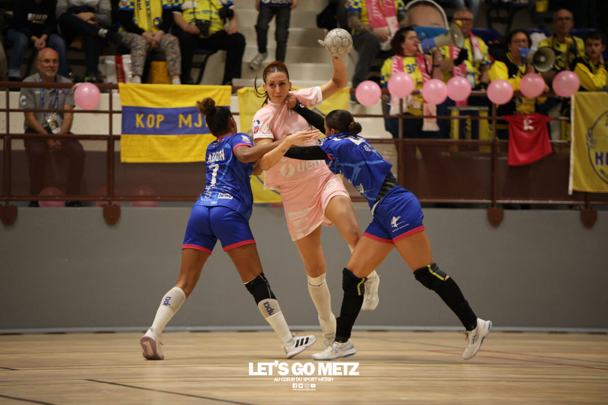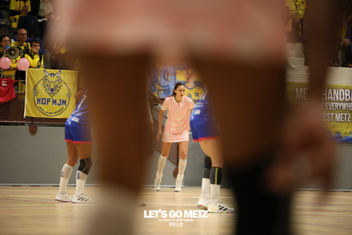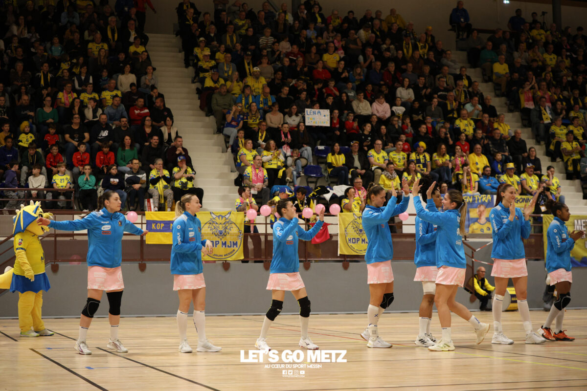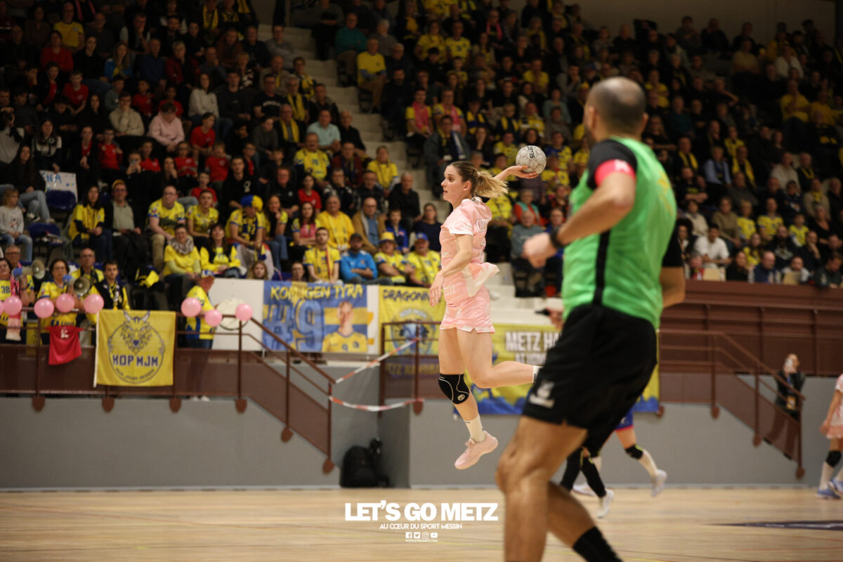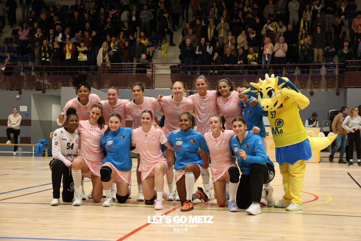 48 Metz Handball s’est imposé (39-13) face à Sambre Avesnois au terme d’une partie plaisante, mardi 28 octobre au complexe Saint-Symphorien. Une petite tradition dans la saison des Dragonnes quand le Moselle Open pointe le bout de son nez… Après sa victoire à Storhamar en Ligue des Champions et quatre jours avant le choc tant attendu à Györ, Metz Handball avait rendez-vous avec l’historique complexe Saint-Symphorien ce mardi 28 octobre, à l’occasion de la réception de Sambre Avesnois, pour le compte de la 7e journée de Ligue Butagaz Energie.Une rencontre remportée, comme on pouvait s’y attendre, assez aisément par les joueuses d’Emmanuel Mayonnade qui caracolent toujours en tête du classement. « J’ai trouvé ce match agréable, je l’ai dit aux filles. C’est agréable de proposer un match de qualité le mardi. On a déjà proposé des matchs moins agréables en semaine », estime l’entraîneur messin. Une partie bien gérée Après une dizaine de minutes de rodage (3-2, 9′), avec notamment plusieurs échecs de ses ailières, Metz Handball a su dérouler son jeu, porté par une défense tenace et une Sabrina Novotna inspirée dans ses buts. « Je crois beaucoup en elle, c’est une jeune gardienne. Je suis vraiment très content d’elle sur ce début de saison. Ce soir, elle n’encaisse que six buts en jouant une mi-temps et a fait preuve de beaucoup de stabilité », souligne Emmanuel Mayonnade. Tranquillement mais sûrement, le collectif jaune et bleu rentrait aux vestiaires avec une avance déjà décisive (16-6, 30′).Les visiteuses tentaient le tout pour le tout et optaient pour le jeu à 7 pour essayer de revenir dans la partie. En vain. Les Nordistes butaient à plusieurs reprises sur Catherine Gabriel, et Metz Handball s’offrait plusieurs buts faciles (21-7, 33′). Malgré la pugnacité de la gardienne Alix Tignon, les Dragonnes atteignaient la barre des vingt unités d’écart grâce à Anne-Emmanuelle Augustine (32-12, 50′). La pivot messine parachevait la belle victoire des siennes avec un chabala en guise de bouquet final (39-13, 59′). Une rencontre où toutes les joueuses de champ auront trouvé le chemin des filets, et fait le plein de confiance avant Györ. Metz Handball 39-13 Sambre Avesnois Mi-temps : 16-6.Metz HandballNovotna (6 arrêts/12 tirs), Gabriel (6/13)Bouktit (7 buts/8 tirs), Godard (2/3), Gros (1/1), Axner (2/5), Wajoka (5/8), Albek (2/4), Augustine (3/3), Smits (2/5), Granier (7/11), Grandveau (2/5), Vamos (2/4), Borg (4/6) Sambre AvesnoisToubissa Elbaco (5 arrêts/21 tirs), Tignon (7/28)Chalmandrier (0 but/1 tir), Adon (2/2), Kvasova (4/11), Tourigny (1/3), Kouaya (0/1), Ballureau (1/4), Ngongang (0/5), Lombindo (1/3), Sias (4/6), Vivant, Gary Crédit photo : Nicolas Martino / Let’s Go Metz