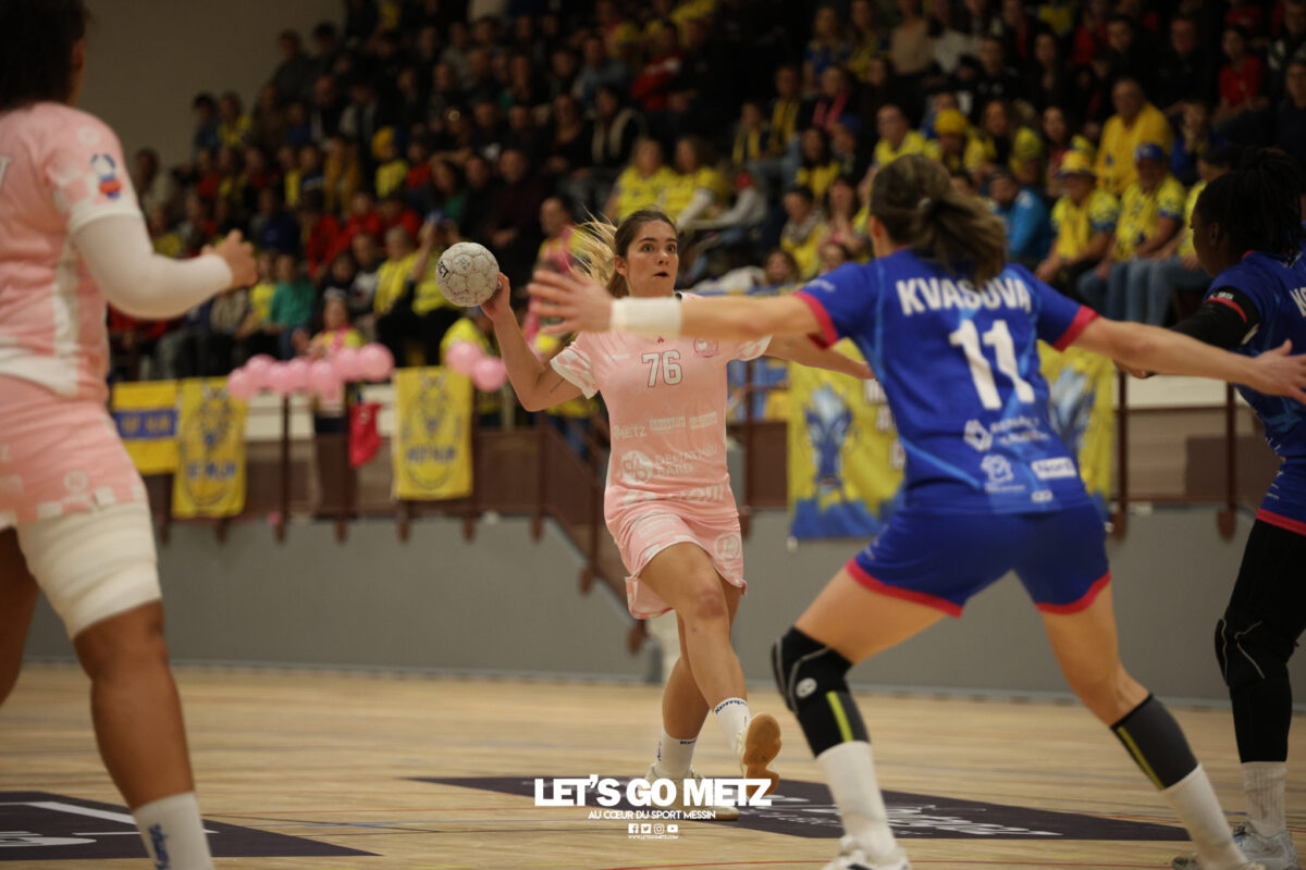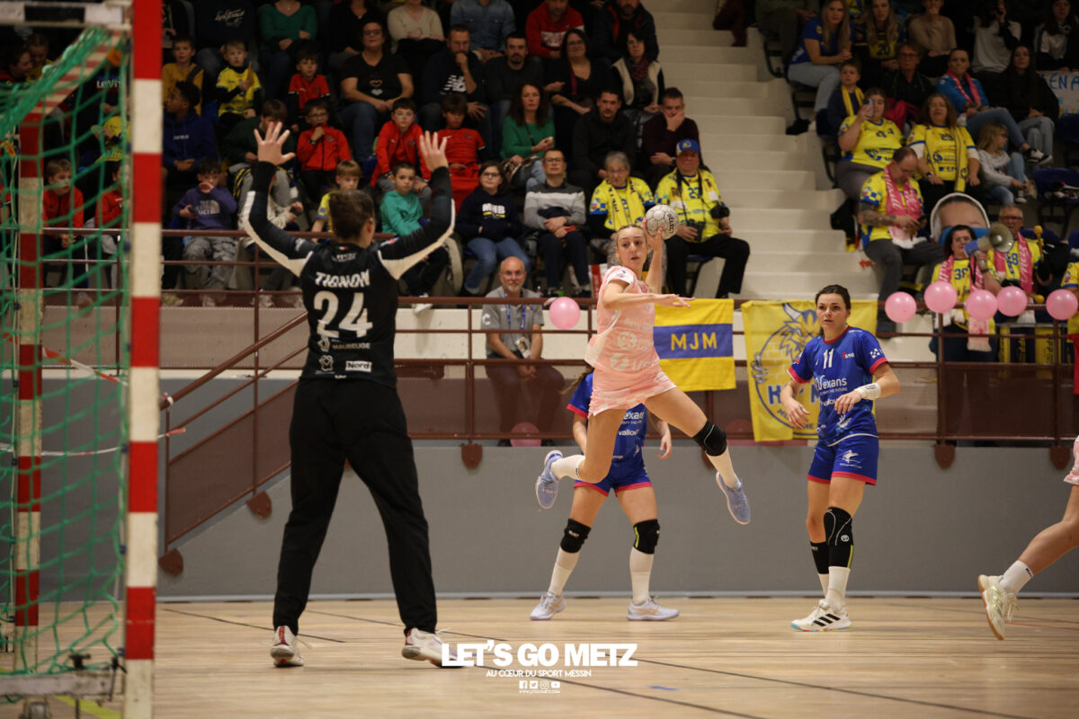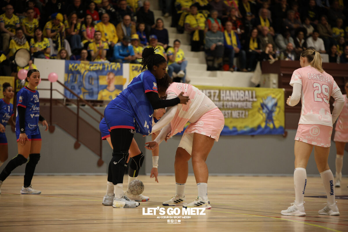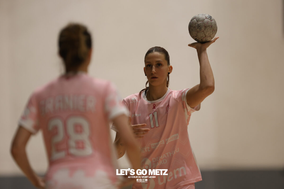 48 Metz Handball s’est imposé (39-13) face à Sambre Avesnois au terme d’une partie plaisante, mardi 28 octobre au complexe Saint-Symphorien. Une petite tradition dans la saison des Dragonnes quand le Moselle Open pointe le bout de son nez… Après sa victoire à Storhamar en Ligue des Champions et quatre jours avant le choc tant attendu à Györ, Metz Handball avait rendez-vous avec l’historique complexe Saint-Symphorien ce mardi 28 octobre, à l’occasion de la réception de Sambre Avesnois, pour le compte de la 7e journée de Ligue Butagaz Energie.Une rencontre remportée, comme on pouvait s’y attendre, assez aisément par les joueuses d’Emmanuel Mayonnade qui caracolent toujours en tête du classement. « J’ai trouvé ce match agréable, je l’ai dit aux filles. C’est agréable de proposer un match de qualité le mardi. On a déjà proposé des matchs moins agréables en semaine », estime l’entraîneur messin. Une partie bien gérée Après une dizaine de minutes de rodage (3-2, 9′), avec notamment plusieurs échecs de ses ailières, Metz Handball a su dérouler son jeu, porté par une défense tenace et une Sabrina Novotna inspirée dans ses buts. « Je crois beaucoup en elle, c’est une jeune gardienne. Je suis vraiment très content d’elle sur ce début de saison. Ce soir, elle n’encaisse que six buts en jouant une mi-temps et a fait preuve de beaucoup de stabilité », souligne Emmanuel Mayonnade. Tranquillement mais sûrement, le collectif jaune et bleu rentrait aux vestiaires avec une avance déjà décisive (16-6, 30′).Les visiteuses tentaient le tout pour le tout et optaient pour le jeu à 7 pour essayer de revenir dans la partie. En vain. Les Nordistes butaient à plusieurs reprises sur Catherine Gabriel, et Metz Handball s’offrait plusieurs buts faciles (21-7, 33′). Malgré la pugnacité de la gardienne Alix Tignon, les Dragonnes atteignaient la barre des vingt unités d’écart grâce à Anne-Emmanuelle Augustine (32-12, 50′). La pivot messine parachevait la belle victoire des siennes avec un chabala en guise de bouquet final (39-13, 59′). Une rencontre où toutes les joueuses de champ auront trouvé le chemin des filets, et fait le plein de confiance avant Györ. Metz Handball 39-13 Sambre Avesnois Mi-temps : 16-6.Metz HandballNovotna (6 arrêts/12 tirs), Gabriel (6/13)Bouktit (7 buts/8 tirs), Godard (2/3), Gros (1/1), Axner (2/5), Wajoka (5/8), Albek (2/4), Augustine (3/3), Smits (2/5), Granier (7/11), Grandveau (2/5), Vamos (2/4), Borg (4/6) Sambre AvesnoisToubissa Elbaco (5 arrêts/21 tirs), Tignon (7/28)Chalmandrier (0 but/1 tir), Adon (2/2), Kvasova (4/11), Tourigny (1/3), Kouaya (0/1), Ballureau (1/4), Ngongang (0/5), Lombindo (1/3), Sias (4/6), Vivant, Gary Crédit photo : Nicolas Martino / Let’s Go Metz