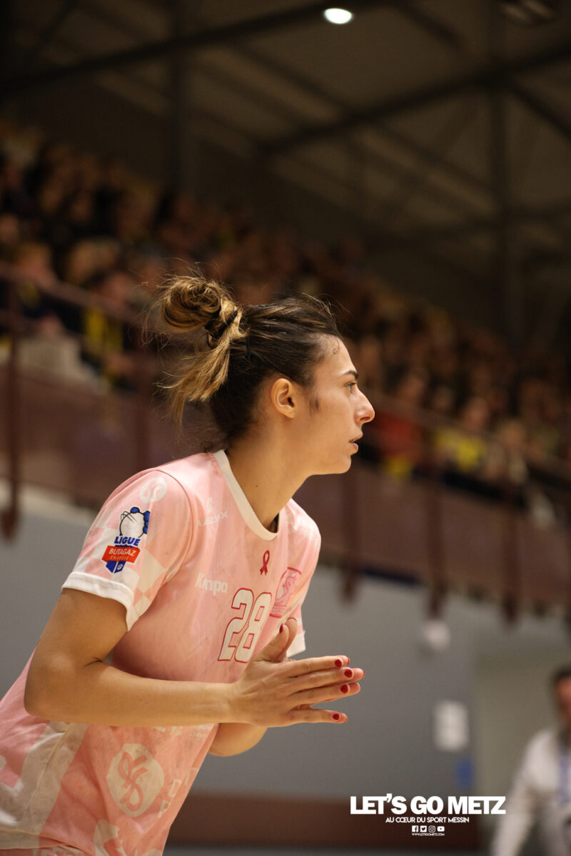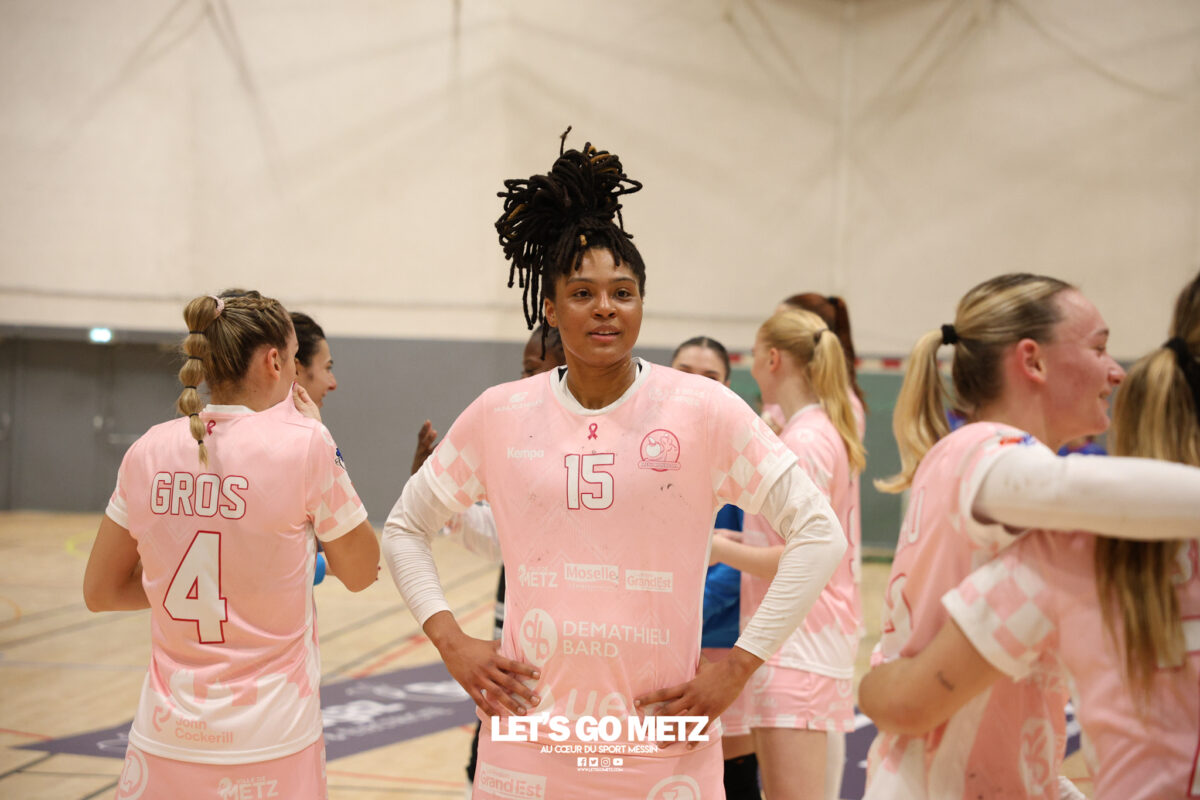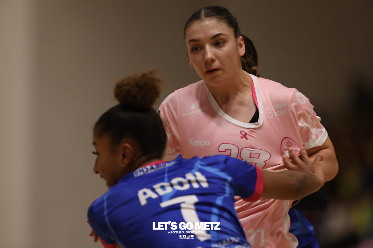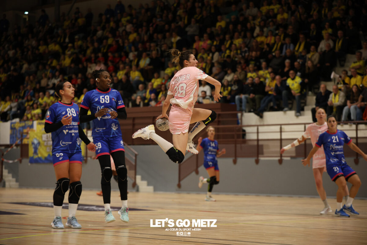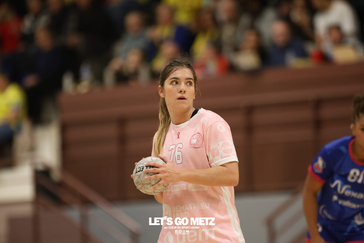 48 Metz Handball s’est imposé (39-13) face à Sambre Avesnois au terme d’une partie plaisante, mardi 28 octobre au complexe Saint-Symphorien. Une petite tradition dans la saison des Dragonnes quand le Moselle Open pointe le bout de son nez… Après sa victoire à Storhamar en Ligue des Champions et quatre jours avant le choc tant attendu à Györ, Metz Handball avait rendez-vous avec l’historique complexe Saint-Symphorien ce mardi 28 octobre, à l’occasion de la réception de Sambre Avesnois, pour le compte de la 7e journée de Ligue Butagaz Energie.Une rencontre remportée, comme on pouvait s’y attendre, assez aisément par les joueuses d’Emmanuel Mayonnade qui caracolent toujours en tête du classement. « J’ai trouvé ce match agréable, je l’ai dit aux filles. C’est agréable de proposer un match de qualité le mardi. On a déjà proposé des matchs moins agréables en semaine », estime l’entraîneur messin. Une partie bien gérée Après une dizaine de minutes de rodage (3-2, 9′), avec notamment plusieurs échecs de ses ailières, Metz Handball a su dérouler son jeu, porté par une défense tenace et une Sabrina Novotna inspirée dans ses buts. « Je crois beaucoup en elle, c’est une jeune gardienne. Je suis vraiment très content d’elle sur ce début de saison. Ce soir, elle n’encaisse que six buts en jouant une mi-temps et a fait preuve de beaucoup de stabilité », souligne Emmanuel Mayonnade. Tranquillement mais sûrement, le collectif jaune et bleu rentrait aux vestiaires avec une avance déjà décisive (16-6, 30′).Les visiteuses tentaient le tout pour le tout et optaient pour le jeu à 7 pour essayer de revenir dans la partie. En vain. Les Nordistes butaient à plusieurs reprises sur Catherine Gabriel, et Metz Handball s’offrait plusieurs buts faciles (21-7, 33′). Malgré la pugnacité de la gardienne Alix Tignon, les Dragonnes atteignaient la barre des vingt unités d’écart grâce à Anne-Emmanuelle Augustine (32-12, 50′). La pivot messine parachevait la belle victoire des siennes avec un chabala en guise de bouquet final (39-13, 59′). Une rencontre où toutes les joueuses de champ auront trouvé le chemin des filets, et fait le plein de confiance avant Györ. Metz Handball 39-13 Sambre Avesnois Mi-temps : 16-6.Metz HandballNovotna (6 arrêts/12 tirs), Gabriel (6/13)Bouktit (7 buts/8 tirs), Godard (2/3), Gros (1/1), Axner (2/5), Wajoka (5/8), Albek (2/4), Augustine (3/3), Smits (2/5), Granier (7/11), Grandveau (2/5), Vamos (2/4), Borg (4/6) Sambre AvesnoisToubissa Elbaco (5 arrêts/21 tirs), Tignon (7/28)Chalmandrier (0 but/1 tir), Adon (2/2), Kvasova (4/11), Tourigny (1/3), Kouaya (0/1), Ballureau (1/4), Ngongang (0/5), Lombindo (1/3), Sias (4/6), Vivant, Gary Crédit photo : Nicolas Martino / Let’s Go Metz