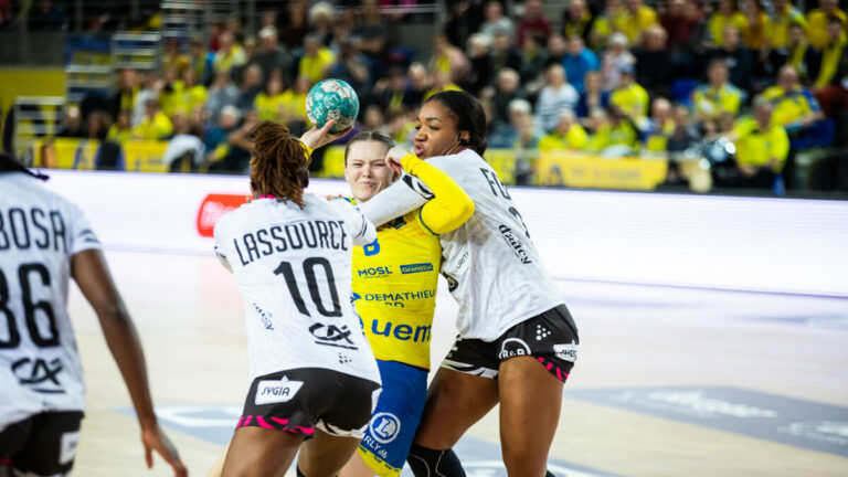 1,7K Metz Handball a chuté, ce mercredi face à Brest (22-23), pour le compte de la 13e journée de Ligue Butagaz Energie. Les Dragonnes devront sans doute réaliser un sans faute, jusqu’au match retour (4 mai) en Bretagne, si elles veulent conserver leur titre de championnes de France. Les Dragonnes ont grillé un joker, et pas des moindres, dans la course au titre de champion de France. Le Brest Bretagne Handball a mis fin à la très longue invincibilité messine, ce mercredi soir aux Arènes. Metz Handball démarrait pourtant ce Classico de Ligue Butagaz Energie sur les chapeaux de roue. Dans le sillage de Hansen, Valentini, Bouktit et Jorgensen, les Dragonnes infligeaient un 4-0 d’entrée à des Brestoises trop timorées. Lassource initiait le réveil breton (4-1, 5’) mais les joueuses d’Emmanuel Mayonnade appuyaient encore un peu plus sur la pédale d’accélérateur et prenaient jusqu’à six unités d’avance (13-7, 18’). Emmené par l’ancienne Messine Maslova, le BBH refaisait cependant son retard et regagnait les vestiaires, à hauteur de Metz Handball (15-15, 30’). Après la pause, les deux formations se livraient une âpre bataille. Lucie Granier marquait le premier but de ce second acte après pratiquement cinq minutes de jeu (16-15, 35’). La réponse brestoise fut immédiate. Pauletta Foppa permettait aux siennes de prendre l’avantage pour la première fois de la partie (18-19, 43’). Granier (19-19) et Valentini (21-21, 50’) maintenaient le navire messin à flot. Pas de quoi empêcher le BBH de réaliser un premier break (21-23, 53’). Camille Depuiset sortait alors le grand jeu, sur 7 mètres, pour empêcher les visiteuses de s’échapper (54’). Dénouement cruel Malgré une défense brestoise rugueuse, les Dragonnes recollaient à un tout petit but grâce à Jorgensen (22-23, 56’). Alina Grijseels pensait égaliser dans la foulée, mais les arbitres de la rencontre jugeaient que l’Allemande avait un pied en zone. Metz avait une nouvelle chance de recoller, mais perdait le ballon. Possession immédiatement regagnée par Lucie Granier. Alina Grijseels, encore malchanceuse, trouvait le poteau sur l’attaque suivante, à une minute du terme (22-23). Les Messines faisaient le job en défense, pour s’offrir une balle de match nul. Louise Vinter Burgaard allait alors arracher un ultime jet de 7 mètres. Le temps écoulé, Kristina Jorgensen butait malheureusement sur Foggea, dans un exercice qu’elle affectionne habituellement. Ce n’était pas la soirée de Metz Handball, qui fait son premier faux pas de la saison en championnat.Score final de ce Metz Handball – Brest : 22 – 23 La galerie du match Les stats de la rencontre Metz HandballSako (3 parades sur 17 tirs), Depuiset (7/16)Valentini (cap) (7 buts sur 10 tirs), Grijseels (0/2), Hansen (2/5), Jorgensen (4/10), Brkic, Vinter Burgaard (2/4), Mlamali, Jacques (1/2), Bouktit (3/6), Granier (3/5), Chambertin, Le Blévec. BrestFoggea (8 parades sur 31 tirs), Filter (1/3)Karlsson (cap) (1 but sur 3 tirs), Toublanc (3/3), Lassource (4/5), Faure (2/4), Kouyaté (1/4), Foppa (1/3), N’Diaye, Coatanea (1/1), Maslova (3/8), Jarrige, Dembele (1/4), Cabral Barbosa (6/9) Crédit photo : Matthieu Henkinet / Let’s Go Metz