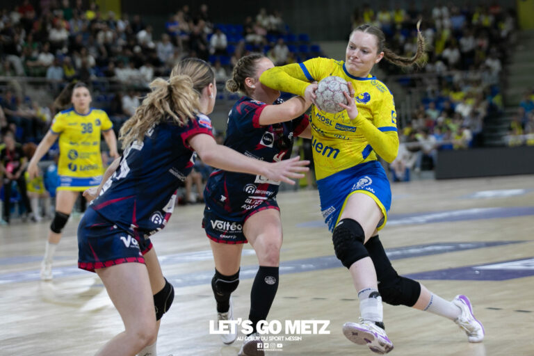 1,5K Metz Handball s’impose face à Mérignac ce mercredi (32-21) et porte sa série de victoires à 19 en Ligue Butagaz Energie. On le sait, passer de l’adrénaline que suscite un quart de finale de Champions League à un match de championnat trois jours plus tard n’est pas forcément une chose aisée. Tant physiquement que mentalement. Et ce d’autant que la courte victoire aux dépens de Brest ce dimanche (33-32) a été acquise au terme d’un intense combat physique. La laborieuse mise en action des Dragonnes ce mercredi soir n’en est que la suite logique. Mais comme toutes les équipes qui ambitionnent de remporter tous les trophées mis en jeu, Metz Handball a su se mobiliser et trouver les ressources pour prendre la mesure de son adversaire girondin. Un Metz Handball maladroit face à une formation de Mérignac accrocheuse Une victoire finalement de 11 buts (32-21) qui porte la série de succès à dix-neuf sur la scène nationale et à trente-six toutes compétitions confondues. Mais qu’elle fut longue à se dessiner! Mérignac a tenu en respect les championnes de France jusqu’au retour des vestiaires (12-13, 34e) après un but d’Enola Borg. Voir la formation jaune et bleue menée à l’entame du second acte n’est pas courant. Ce qui l’est encore moins est que Emmanuel Mayonnade se sente obligé de poser deux temps morts au cours des trente minutes initiales. Il faut dire qu’il n’est pas habitué à observer ses Dragonnes échouer autant au tir. Pour inverser la tendance, il a une nouvelle fois fallu une Anne-Mette des grands soirs. Comme ce fut déjà le cas dimanche, la Danoise a impulsé la dynamique mosellane (7/9). Ce faisant, les Mérignacaises, et notamment Lylou et Enola Borg ou encore Sabrina Abdellahi et surtout l’arrière gauche Phellys Kibuey ont ddavantage peiné à développer leur jeu. La première nommée, meilleure buteuse de LBE, est restée cantonnée à deux réalisations, quand sa sœur ne parvient qu’à trouver les filets que 40% du temps (4/10). Il faut dire que Szofi Szemerey, préférée à Cléopâtre Darleux, laissée au repos pour cette rencontre, a sorti le grand jeu. La gardienne magyare est la principale, voire seule, satisfaction des trente premières minutes (8 arrêts) et elle a permis à ses partenaires de se détacher en seconde période avec quatre nouvelles parades (22-16, 46e). Anne-Mette Hansen et Zsofi Szemerey en patronnes L’écart étant fait, les Dragonnes se sont enfin libérées et le technicien girondin a pu offrir du temps de jeu à son banc. Nadine Szollosi-Schatzl et Emma Jacques ont pu parfaire leurs statistiques et prendre une petite dose de confiance avant les prochaines grosses échéances. Et la belle histoire de la soirée est pour Yvana Atangana. La jeune arrière camerounaise a disputé ses premières minutes avec l’équipe professionnelle. Si elle a échoué sur sa première tentative, elle se souviendra sans doute longtemps de son but, le dernier des Jaune et Bleu, inscrit à deux minutes du terme (32-19, 58e). Score final de ce Metz Handball-Mérignac : 32-21 Les victoires s’enchaînent au même rythme que les matchs en cette période de la saison et les partenaires de Sarah Bouktit seront déjà sur le pont dès samedi. Elles se rendront à Besançon (19 h) pour disputer le match en retard de la vingtième journée de Ligue Butagaz Energie avant de retrouver les Arènes face à Sambre-Avesnois dès mercredi prochain (20 h). Crédit photos: Valentin Lachaux (Let’s Go Metz) La galerie photo de la rencontre Les stats de la rencontre Metz HandballCamille Depuiset (0 parade sur 6 tirs), Zsofi Szemerey (12/27), Allison Pineau (0 but en 1 tentative), Anne-Mette Hansen (7/9), Tyra Axnér (0/2), Yvana Atangana (1/2), Anne-Emmanuelle Augustine, Zaliata Mlamali (0/1), Emma Jacques (5/9), Sarah Bouktit (4/8), Léna Grandveau (4/7), Nadine Szollosi-Schatzl (3/3), Petra Vámos (3/3) Manon Errard (4/8).Exclusions: Manon Errard (29e) Mérignac Keran Berkrou Brega (7 parades sur 27 tirs), Léna Le Borgne (8/20). Léa Lignières (0/2), Mathilde Mélique, Phellys Kibuey (5/9), Lylou Borg (2/6), Nahia Malharin (2/4), Enola Borg (4/10), Sabrina Abdellahi (4/7), Julie Abadie, Anna Lacuey, Lina Colinot (0/1), Louane Texier (0/3), Lyson Samai (2/2).Exclusions: Lylou Borg (17e), Enola Borg (56e)