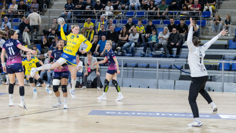 1,K Metz Handball a logiquement dominé Sambre Avesnois, ce mercredi 7 mai aux Arènes. Une victoire qui permet aux Dragonnes d’aborder le déplacement à Brest dans les meilleures dispositions. Metz Handball poursuit son sans-faute avant de se déplacer à Brest, dimanche 11 mai, dans ce qui ressemblera à une finale pour aller chercher le titre en Ligue Butagaz Energie. Le collectif jaune et bleu a continué sa marche impériale au sommet du championnat en venant à bout du promu Sambre Avesnois, auteur d’une saison plutôt honorable pour sa grande première dans l’élite du handball féminin. Les absences de Sarah Bouktit – parfaitement supplée dans le rôle de capitaine par Lucie Granier -, des futures mamans Chloé Valentini et Laura Flippes ou encore les mises au repos de Camille Depuiset, Djazz Chambertin et Petra Vámos n’auront pas impacté un groupe sûr de sa force, qui avait sans doute en tête la vilaine entame lors de la réception de Mérignac une semaine plus tôt. Les Dragonnes en maîtrise Malgré quelques échecs de Zaliata Mlamali en début de match, le Metz Handball prenait rapidement la mesure de son adversaire (8-4, 10′) et déployait son jeu rapide sur grand espace, avec une connexion Darleux – Granier toujours aussi redoutable (14-6, 15′). Une domination sans partage qui permettait à Emmanuel Mayonnade d’offrir ses premières minutes en Ligue Butagaz Energie à Claire Koestner, jeune demi-centre tout juste passée professionnelle qui sera prêtée à Saint-Amand pour les deux prochaines saisons, une semaine après les grands débuts d’une autre protégée de Nina Kanto, Yvana Atangana. Le moment également choisi par Nadine Szöllősi-Schatzl pour montrer qu’elle aimait elle aussi le jeu rapide de Metz Handball (17-10, 26′). De son côté, Anne-Emmanuelle Augustine profitait parfaitement de l’opportunité d’un gros temps de jeu pour être impactante au poste de pivot, avec cinq de ses huit buts en première mi-temps (19-13, 30′).Trente minutes inaugurales qui ont laissé place à une seconde période tout aussi souveraine, où Zsófi Szemerey a pris un peu de confiance au relai de Cléopâtre Darleux (23-15, 35′). Une confiance bienvenue aussi pour Emma Jacques, qui aura son mot à dire à droite sur cette fin de saison. Maladroite en première période, sa compère à gauche, Tyra Axnér, a également fait parler son bras de loin (28-21, 43′). A l’aile droite, Manon Errard, autre pépite issue du centre de formation messin, s’est elle aussi fait plaisir dans un second acte maîtrisé (31-23, 47′). L’écart définitif sera finalement de onze buts, loin d’être infamant pour une valeureuse équipe nordiste, jamais larguée au score. Insuffisant toutefois pour empêcher Metz Handball de signer un 21e succès en autant de matchs de championnat de France. Metz Handball 38-27 Sambre Avesnois Metz HandballDarleux (7 arrêts/20 tirs), Szemerey (6/20)Hansen (2 buts/3 tirs), Axnér (2/9), Atangana (0/1), Augustine (8/9), Koestner (0/1), Mlamali (2/7), Jacques (6/7), Granier (5/6), Grandveau (5/5), Szöllősi-Schatzl (4/4), Errard (4/5), Pineau Sambre AvesnoisIlic (4 arrêts/23 tirs), Toubissa Elbeco (4/23)Abdourahim (2 buts/4 tirs), Rutil (2/6), Adon (3/6), Kvasova (6/8), Touringny (1/2), Chalmandrier (1/4), Ballureau (6/11), Godet (1/1), Kipirijanovska (2/5), Sias (3/4), Diarrassouba Crédit photo : Matthieu Henkinet / Let’s Go Metz