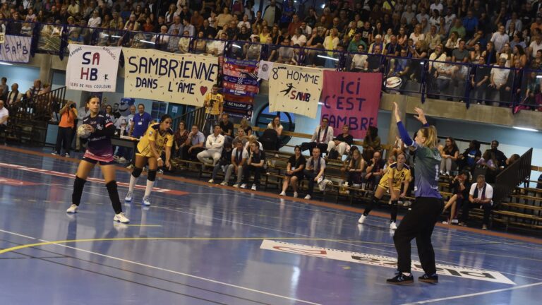 1,1K Pour sa première à domicile dans l’élite du handball français, Sambre Avesnois Handball s’impose de six unités (25-19) face à son voisin Saint-Amand Hainaut Handball dans une ambiance des grands soirs. Un derby du Nord en Ligue Butagaz Energie qui a concerné beaucoup de joueuses passées par Metz Handball. Ce samedi soir, c’était la fête du handball dans le Nord. Le calendrier de la Ligue Butagaz Energie offrait en effet ce derby entre Sambre Avesnois Handball et Saint-Amand Porte du Hainaut dès la deuxième journée. Et quoi de mieux qu’une rencontre dans une salle nommée Pierre de Coubertin pour débuter cette saison post olympique, et étrenner ses galons dans l’élite pour ce club titré champion de D2 en mai dernier. Elle aurait pu être encore plus belle si la ville de Maubeuge était parvenue à changer le revêtement de sol de la salle avant cette opposition entre voisins. En effet, pour fêter cette accession évènement et poursuivre le structuration du club, la ville de Maubeuge a fait l’acquisition du parquet qui a vu l’équipe de France féminine glaner une médaille d’argent le 10 août. Sambre-Avesnois a pris le dessus sur Saint-Amand Si tout n’est pas encore prêt dans les à-côtés, et si l’équipe dirigée par Julien Vasseur s’est inclinée dix jours auparavant à Nice (25-20), elle a montré ce samedi soir à son fervent public qu’elle pourraient leur procurer de belles émotions lors de cet exercice. Il est probable que l’évènement du derby combiné au premier match au plus haut échelon national a apporté ce surplus de motivation nécessaire aux grandes victoires. Mais les 600 spectateurs présents ont pu constater que leurs favorites avaient quelques armes pour rivaliser et espérer perdurer en LBE.A commencer par les anciennes Messines Léa Ballureau, Dounia Abdourahim, Julie Sias et Camille Aoustin. Si cette dernière dispute probablement sa dernière saison en tant que joueuse, elle a prouvé qu’elle pouvait encore apporter beaucoup à l’image de son lob victorieux au terme d’une combinaison au cours de laquelle elle a commencé l’action au poste de demi-centre et alors que Saint-Amand était revenu à trois longueurs (19-15, 48e). Léa Ballureau s’est elle illustrée à la mène et au jet de sept mètres au relais de Jovana Kaprijanovska. Léa Ballureau est passée par Metz Handball avant de s’épanouir à Sambre-Avesnois Et que dire de leur gardienne, Justicia Toubissia qui a écœuré les Louves par ses parades et qui est la grande artisane du succès des siennes et de l’avance prise dès la pause (14-7, 30e). Si l’écart s’est stabilisé lors du second acte, les Amandinoises le doivent en grande partie à son dernier rempart, entré à la place de la capitaine Roxane Frank, et formé à Metz Handball, Ophélie Tonds. L’ancienne Toulonnaise a multiplié les arrêts dès son arrivée sur le terrain à l’image de sa prestation d’il y a dix jours face à Dijon (défaite 27-30), entraînant sa défense dans son sillage.Malheureusement, sa prestation et les réveils de l’autre ancienne Dragonne, Stelvia Pascoal De Jesus et de Paola Ebanga n’ont pu masquer les trop grandes difficultés rencontrées dans le jeu d’attaque à l’image des ratés de Mélanie Jobard ou encore d’Emma Puleri. Le retour post convalescence de Julie Le Blevec ne pourra faire que le plus grand bien au collectif des Louves qui doit donc s’incliner dans ce derby. L’ancienne Dragonne Stelvia Pascoal sous les couleurs de Saint-Amand – Photo : Matthieu Henkinet / Let’s Go Metz Score Final: 25-19. Si Sambre Avesnois peut espérer poursuivre sur sa lancée en se déplaçant à la Stella Saint-Maur, repêchée de dernière minute, Saint-Amand aura fort à faire face à une formation brestoise à qui rien ne résiste depuis le début de la saison, pas même Team Esbjerg, ce samedi en Champions League. Crédit photo à la une : Nicolas Leclercq / Ville de Maubeuge