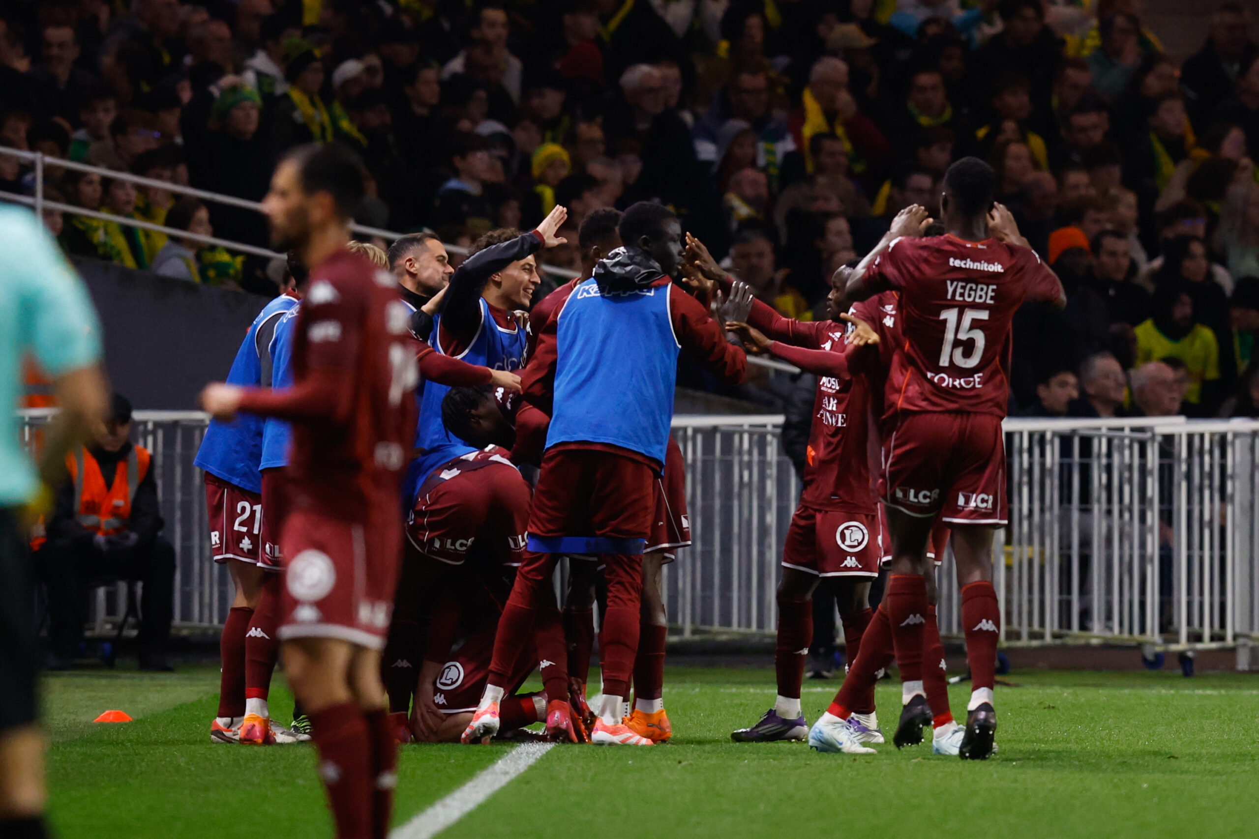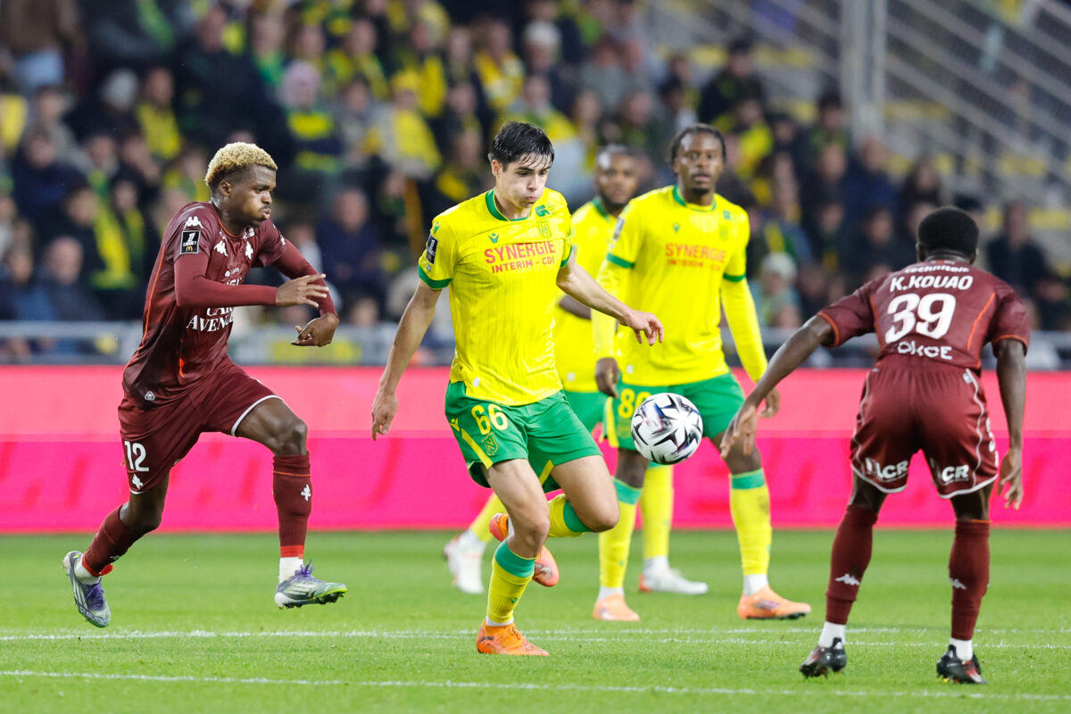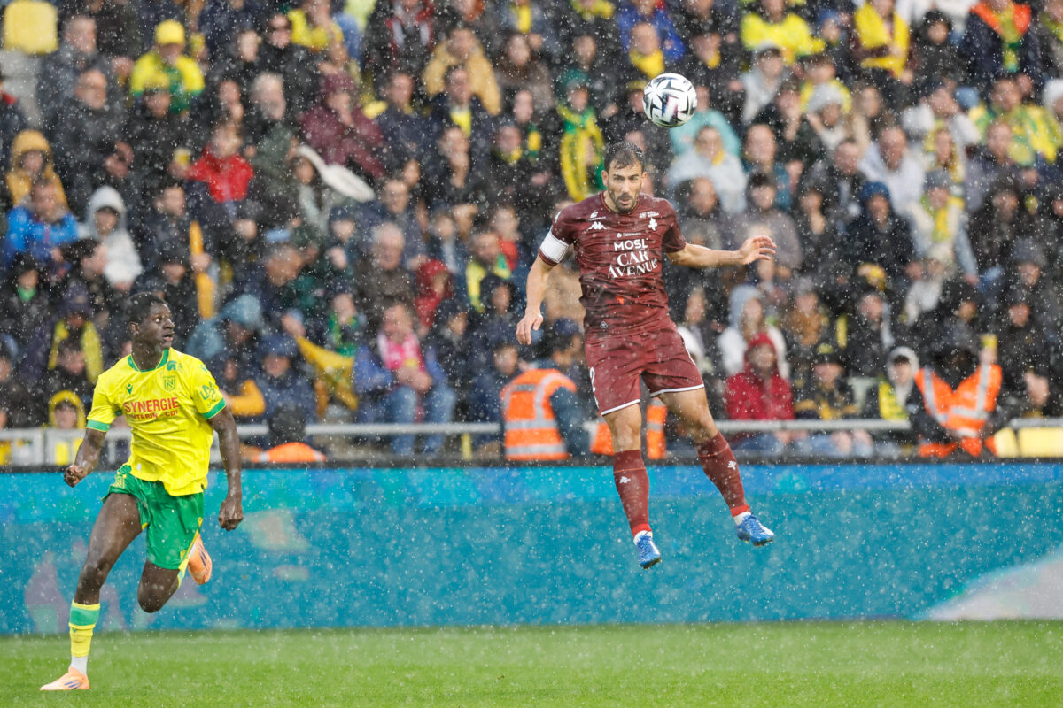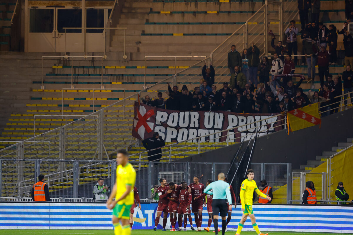 279 Et de deux pour le FC Metz face à Nantes ! Les Grenats ont disposé des Canaris en toute fin de match et quittent la place de lanterne rouge de la Ligue 1 (0-2). Cette fois-ci, la saison semble définitivement lancée. Que le football va vite. Il y a tout juste sept jours, les Mosellans touchaient le fond en allant se faire humilier dans le Nord, face au LOSC (6-1). Stéphane Le Mignan était plus que jamais sur la sellette, les joueurs eux-mêmes affirmaient ne pas avoir le niveau requis pour jouer en Ligue 1. La solution semblait introuvable, inatteignable. Une semaine plus tard, ce dimanche 2 novembre, les Grenats assomment le FC Nantes dans leur antre de la Beaujoire, quittent la 18è place synonyme de lanterne rouge et reviennent à un petit point du premier non relégable. « L’idée, c’était de réussir à faire le genre de match qu’on a fait contre Lens à l’extérieur, sachant qu’on était encore en difficulté depuis le début de saison, explique Stéphane Le Mignan après la rencontre. Et dans l’ensemble, on a réalisé ce qu’on espérait faire. » Photo : Loic Baratoux/FEP/Icon Sport Sur les mêmes bases que Lens Et avec la manière, façon FC Metz. Les Mosellans souffraient face aux percussions de Mathis Abline, qui manquait cependant cruellement de réalisme une fois devant la cage de Jonathan Fischer. Dans le jeu de possession, la partition messine était un ton en dessous en première mi-temps, avant de reprendre petit à petit le dessus. Mais, fidèles à leurs idées, les Grenats s’efforçaient de créer le danger par le jeu. Les passes verticales depuis la défense combinées aux longues chevauchées de Koffi Kouao mettaient à mal les adversaires. Mais le réalisme manquait, malgré les quelques occasions notamment obtenues par Habib Diallo. Menaçants mais pas franchement menacés par des Nantais sous la pression d’un public qui semblait très irrité, les Messins géraient les assauts adverses avec une certaine sérénité tout au long de la rencontre… avant d’exulter. Photo : Loic Baratoux/FEP/Icon Sport Une première fois, après un cadeau de la défense nantaise qui permettait à Giorgi Abuashvili de pousser le ballon dans le but vide (0-1, 82’). Et une seconde fois, sept minutes plus tard, après un bon travail défensif de Cheikh Tidiane Sabaly qui lançait Habib Diallo dans la profondeur et avait tout le temps d’ajuster Anthony Lopes (0-2, 89’). Sur le terrain, le banc ou en tribunes, chacun a laissé exploser sa joie, comme un exutoire après des semaines de souffrance. Des efforts enfin récompensés Comme face au RC Lens, l’abnégation a payé. Le coaching aussi : les entrants ont une nouvelle fois été décisifs. « On sera obligés à chaque fois de mettre ces ingrédients là pour gagner des matchs », prévient d’ores et déjà Jessy Deminguet. C’est effectivement le début d’une tendance de fond. Après l’exploit de mercredi, le FC Metz a su opposer une résistance digne de ce nom et élever son niveau de jeu face à une équipe de « son » championnat. « [On est] quand même soulagé de ne pas faire une saison hyper compliquée en ne gagnant pas un match, confie Stéphane Le Mignan. On a réussi à enchaîner, c’est vraiment une belle semaine pour nous. Maintenant, il faut préparer Nice et ne pas retomber. » Photo : Loic Baratoux/FEP/Icon Sport Certes, il reste de nombreux efforts à fournir et montrer que cette équipe saura faire preuve de régularité au fil des semaines. Mais après un tel début de saison avec son lot d’humiliations, les Grenats peuvent savourer d’avoir emprunté la voie d’une timide rémission. Il faut désormais maintenir le cap… au stade de la Beaujoire, à Nantes (Loire-Atlantique), Mehdi Abirez. FC Nantes 0 – 2 FC Metz FC Nantes : Lopes (Carlgren, 89′) – Amian (Cap.), Awaziem, Tati, Cozza (Rajkovic, 86′) – Mwanga, Leroux, Tabibou (Deuff, 79′) – Guirassy (Benhattab, 67′), El-Arabi (Mohamed, 79′), Abline. FC Metz : Fischer – Kouao, Gbamin, Yegbe, Colin (cap.) – Touré (Stambouli, 90+’), Deminguet (Traoré, 78′), Tsitaishvili (Bokele, 78′) – I. Sané (Abuashvili, 78′), Sabaly – Diallo (Asoro, 90+’). Buts : Abuashvili (82’), Diallo (89’). Avertissements : I. Sané (26′), Tabibou (65′), Kouao (90+’). Arbitre : Gaël Angoula.