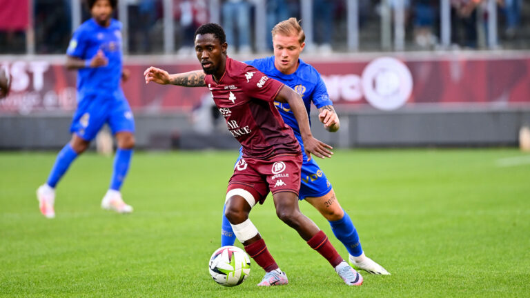 690 Le FC Metz a été en grande souffrance face à une équipe niçoise pourtant pas transcendante. L’OGC Nice est venue s’imposer 0-1 sur la pelouse du Stade Saint Symphorien grâce à une action collective rondement menée, la seule ou presque… On ne s’attendait pas à du grand football, pourtant nous sommes quand même déçus. Dès l’entame de la rencontre, Kephren Thuram alerte Alexandre Oukidja d’un centre tir qui vient heurter la barre transversale. Heureux, le portier grenat voit la balle heurter sa barre transversale. Une première alerte avant la punition. D’une superbe action collective, Thuram trouve Bard lancé dans le dos de la défense messine qui adresse un centre millimétré à Boudoui, qui n’a plus qu’à pousser la balle au fond des filets. (0-1, 14′)Un premier quart animé puis plus rien, si ce n’est cette touche ratée de Melvin Bard dans l’axe récupéré par Diallo. Estupinan dans la profondeur, laisse son altruisme dans les chaussettes et oublie complètement Udol, seul le côté gauche. L’attaquant colombien, déséquilibré, frappe du gauche directement dans les gants de Bulka. (30′) Un FC Metz avec le frein à main face à l’OGC Nice Les assauts se multiplient sur la cage d’Alexandre Oukidja. En début de seconde période, les Aiglons ont pris leur position devant le but messin. Mais pourtant, le manque de réalisme se fait aussi cruellement ressortir. Moffi a manqué d’aggraver le score à plusieurs reprises. Les entrées de Van den Kerkhof et Asoro ont apporté une certaine fraîcheur. Les deux entrants auront tenté de révolté le reste du collectif par des incursions et des sauvetages importants. Cependant, malgré une volonté indéniable, le manque de précision et de qualité dans le jeu messin se fait ressentir. À l’image de ce trois contre deux mal géré par Camara. Un des seuls éclairs messins de la fin d’après-midi : la frappe à plus de 30 mètres de Fali Candé qui oblige Bulka à se détendre dans le temps additionnel. (90+3) S’il était attendu que le FC Metz soit un cran, voire deux, en-dessous de l’OGC Nice sur le plan technique, les Grenats ont affiché d’autres lacunes, sur le plan mental, tout aussi inquiétantes. En première mi-temps, les joueurs de Laszlo Boloni se sont montrés bien trop attentistes pour mettre en danger les Aiglons. Malgré plus d’allant en deuxième période, le FC Metz a véritablement joué avec le frein à main ce samedi. Pire encore, les Mosellans ont parfois montré quelques signes de résignation. L’addition aurait pu être plus salée si l’OGC Nice ne s’était pas contentée de gérer son avance d’un but. L’équipe morte de faim, à 120% sur chaque ballon, entrevue en août dernier, est portée disparue depuis quelques matchs. La défaite contre Strasbourg a décidément été un énorme coup d’arrêt. Chirurgicaux, c’est le terme employé pour qualifier les joueurs niçois. Imprécis, irréguliers et avec un certain manque d’ambitions, les Messins pourront nourrir des regrets. En s’inclinant ce samedi, le FC Metz reste sur trois défaites consécutives, sans inscrire le moindre but… Compositions : FC Metz : Oukidja – Kouao (Van den Kerkhof 70) ; Traoré ; Candé ; Udol (c) – Jean-Jacques (Atta 78′) – N’Duquidi ; Camara – Diallo (Sabaly 64′) ; Jallow (Asoro 70′) ; Estupinan (Elisor 78′) OGC Nice : Bulka – Lotomba ; Todibo ; Dante ; Bard (Perraud 84′) – Ndayishimiye ; Thuram (Sanson 45′) ; Boudaoui – Boga (Claude-Maurice 90′) ; Laborde (Bouanani 84′) ; Moffi (Guessand 66′) Buteurs : Boudaoui (14′) Avertissements : Thuram (21′) Photos : IconSport