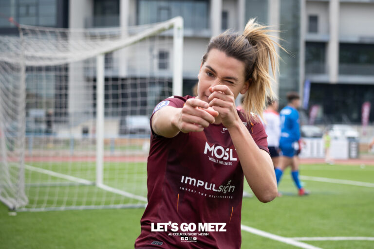 617 Les joueuses du FC Metz ont remporté leur duel face à l’ESOF La Roche-sur-Yon. Score final 2-0 et seconde victoire de la saison à domicile pour les protégées de Jessica Silva. Tous les ingrédients d’un match piège étaient réunis cet après-midi au Stade Dezavelle. Mais les filles du FC Metz n’ont pas tremblé face à la surprenante équipe de la l’ESOF La Roche-Sur-Yon. Les Vendéennes, tombeuses du FC Nantes la semaine passée, arrivaient en terre mosellane avec la ferme intention de renouveler l’exploit. La formation Ornaysienne, emmenée par les ex-Messines Joy Sarpong et Lauriane Roth, avait d’ailleurs battu le FC Metz lors de la dernière journée la saison passée sur le score de 3-2. De quoi promettre du spectacle à la centaine de spectateurs ayant fait le déplacement. Le onze grenat 1 Emmeline Mainguy3 Estelle Laurier6 Candice Gherbi7 Marjorie Castro Boilesen8 Marine Morel (C)10 Océane Picard12 Otti Grassetti17 Amélie Delabre18 Célia Rigaud27 Yakare Niakaté28 Salma Amani Un début de match tonitruant Le match démarrait tambour battant pour les Grenats. Agressives et généreuses, les joueuses du FC Metz allaient faire souffrir la défense vendéenne dès les premières minutes de jeu. Une grosse intensité physique, un pressing haut, les Messines asseyaient rapidement leur domination technique et tactique. Les combinaisons du quintet offensif grenat, Boilesen-Picard-Grassetti-Delabre-Amani, donnaient le tournis aux joueuses de La Roche Sur Yon. Et après vingt-trois minutes de jeu, Amélie Delabre délivrait ses coéquipières en renard des surfaces. Autrice d’un début de saison plus que convaincant, la numéro 17 du FC Metz a une nouvelle fois régalé sur son côté. Pour autant, les Vendéennes n’abdiquaient pas et tentaient de jouer en contre. Sans succès. Les visiteuses se contentaient de repousser les assauts adverses. Et malgré un pressing dur sur le porteur du ballon, les joueuses de L’ESOF allaient être incapables de développer leur jeu. Célia Rigaud Tout en gestion Au retour des vestiaires, les Vendéennes décidèrent d’appuyer sur l’accélérateur. Mieux en place tactiquement, les joueuses de Fabrice Bouyer imposaient rapidement un rythme plus soutenu. Il fallut une Emmeline Mainguy très concentrée pour empêcher une égalisation qui n’aurait pas été imméritée en début de seconde mi-temps. Mais le réveil de La Roche-Sur-Yon allait donner plus d’espace aux attaquantes grenats. Et sur un contre rondement mené, Océane Picard aggravait la marque et soulageait son équipe. Un nouveau but pour la numéro 10 du FC Metz, toujours aussi précieuse dans les trente derniers mètres. Le coup de grâce pour les visiteuses, qui malgré de beaux mouvements et une indéniable générosité, allaient s’incliner face à l’armada Messine. Léonie Richard Un collectif qui monte en puissance Plus efficaces dans les derniers gestes, plus solides mentalement, ce FC Metz 2022/2023 séduit une nouvelle fois à domicile. La charnière centrale new-look Morel-Niakaté fait montre d’une belle solidité bien entourée des latérales, Estelle Laurier et Célia Rigaud. Dans l’entrejeu, Candice Gherbi récupère toujours autant de ballons et les possibilités dans l’animation offensive sont multiples. Il y a de la maturité et beaucoup d’aisance dans la circulation de balle. Mention spéciale à Salma Amani qui incarne à merveille ce renouveau. L’internationale marocaine possède un volume de jeu impressionnant et son apport dans le collectif est la belle surprise de ce début de saison. Les réactions de Jessica Silva et Célia Rigaud Prochaine journée, dimanche 02 octobre. Les Messines, désormais troisièmes, iront défier le LOSC et tenteront de confirmer leur très bon début de saison. Crédit photo : Julien Buret/LGM – Montage vidéo : Xavier Douzenel/LGM – Interview : Gérald Russello/LGM