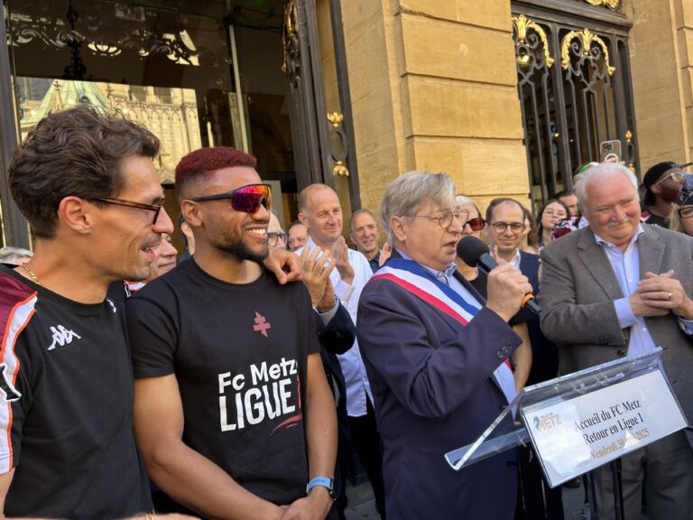2,5K Joueurs, dirigeants et staff du FC Metz ont été chaleureusement accueillis par des centaines de personnes sur la place d’Armes et dans l’enceinte de la mairie, ce vendredi 30 mai 2025, pour savourer ensemble ce retour en Ligue 1. Il y avait beaucoup de petits yeux sur les visages des personnes qui se rendaient devant l’Hôtel de Ville ce vendredi en fin de matinée. Le soir d’avant, plus de 10 000 personnes s’étaient rassemblées place de la République, en plein cœur de Metz, pour vivre tous ensemble ce barrage retour qui a vu les Grenats s’imposer au bout des prolongations contre le Stade de Reims. Et fêter, ensuite, une nouvelle remontée dans l’élite du football français. La plus belle, diront certains. Des centaines de personnes se sont rassemblées sur la place d’Armes afin d’accueillir les joueurs du FC Metz. Photo : Mehdi Abirez/LGM Arrivés dans le bus aux couleurs du club, les joueurs ont été accueillis dans une chaleureuse ambiance par des centaines de personnes. Les joueurs en ont profité pour faire selfies et autographes avant de se faire féliciter par le maire de Metz, François Grosdidier. Matthieu Udol et Benjamin Stambouli ont également pris la parole pour remercier le public de son soutien durant l’ensemble de la saison : le premier a loué « la joie [des supporters] qui procure beaucoup de bonheur », quand le second a confié que le « peuple grenat » a « régalé » les joueurs toute la saison. Les joueurs et dirigeants du FC Metz autour du maire, François Grosdidier, avec la présence de Carlo Molinari. Photo : Mehdi Abirez/LGM. L’ensemble des salariés du club ainsi que les proches présents ont ensuite été conviés dans les salons de l’Hôtel de Ville, où certains joueurs ont continué à haranguer la foule et s’amuser avec depuis les fenêtres. François Grosdidier a remis des céramiques arborant l’emblème de la ville de Metz et fabriqués par la Manufacture des Émaux de Longwy a chacun des membres de l’effectif. Place aux vacances, désormais, pour un grand nombre d’entre eux… sauf peut-être Frédéric Arpinon, qui doit déjà plancher sur le mercato de la saison 2025/2026. Photos : Mehdi Abirez/LGM.