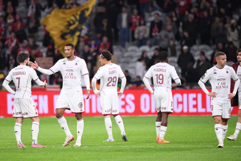 1,6K Nouvelle déroute pour le FC Metz face à Lille, dans un début de saison qui ne lui épargne décidément rien. Malgré une composition inédite, les Grenats ont pris une nouvelle sanction contre une équipe du LOSC qui s’est baladée sur sa pelouse (6-1). Il n’y a rien à faire. Les semaines se suivent et les dimanches se ressemblent. Il n’y avait, certes, sans doute pas grand chose à attendre de ce match contre l’un des cadors de la Ligue 1, le FC Metz ne boxant évidemment pas dans la même catégorie. Mais les plus optimistes pouvaient espérer prétendre à un scénario alternatif à ceux connus jusqu’à présent, avec une composition pour le moins audacieuse. Et pour cause, deux tauliers de l’effectif ont vu une grande partie de la rencontre depuis le banc : Pape Sy a été préféré à Jonathan Fischer et, surtout, Gauthier Hein, laissé au profit de Giorgi Abuashvili. Dans ce qui ressemblait à un baroud d’honneur, Stéphane Le Mignan tentait l’électrochoc pour réveiller l’équipe et, pourquoi pas, créer la surprise… « Même si Jonathan Fischer n’avait pas fait d’erreurs importantes, on voulait aussi provoquer quelque chose. » Quant au choix lié au capitaine, « c’était essentiellement par rapport au profil de joueur qu’on voulait mettre, plutôt de vitesse avec Abuashvili et Sabaly« . Photo : Philippe Lecoeur/FEP/Icon Sport. Une valise de plus Le coup était audacieux, mais il n’a malheureusement rien donné. Le FC Metz entamait le match en souffrance et il fallait des arrêts déterminants de Pape Sy pour garder les Grenats dans le coup (9′, 10′). En réaction à l’armada lilloise, Cheikh Tidiane Sabaly tentait de sonner la révolte par quelques incursions dans la surface, sans succès… Puis arrivait ce qui devait indéniablement arriver : le premier but de la partie, du pied d‘Hamza Igamane, qui ajustait le portier messin d’une frappe croisée dans son petit filet droit (1-0, 24′). S’il fallait bien admettre son impuissance sur ce coup, le peu de satisfaction obtenu par le gardien messin s’envolait quelques minutes plus tard, à peine. Pape Sy manquait sa relance et envoyait le ballon dans les pieds de Félix Correia. Le Nordiste ne se faisait pas prier pour le lober et alourdir la marque (2-0, 32′). L’arc électrique retournait à l’envoyeur… Photo : Philippe Lecoeur/FEP/Icon Sport. La physionomie du match était respectée. Et son épilogue par la suite – l’aboutissement d’un véritable festival côté nordiste, qui a régalé son public avec six buts inscrits – n’est qu’une suite logique des efforts employés face à l’insuffisance des Grenats, inférieurs dans tous les compartiments du jeu et sans inspiration. Quant à la rentrée de Jonathan Fischer en lieu et place de Pape Sy, sorti sur civière après un contact avec Osame Sahraoui (72′, lire ci-dessous), elle ne changeait pas le cours du match. « Je pense que ce n’est pas le même match qu’à Toulouse, où on avait failli gagner les premières minutes. Là, on a essayé de montrer des choses au début de match, d’essayer de tenir, mais l’adversaire était trop fort, simplement », concède Stéphane Le Mignan. Seule (très légère) satisfaction, le deuxième but en Ligue 1 du rentrant Ibou Sané, qui adressait un boulet de canon dans la lucarne du gardien lillois et sauvait le peu d’honneur qui restait à sauver pour le FC Metz (6-1, 90+5′). « Assister à tout ça en tant qu’acteur, c’est terrible » « On n’a pas le niveau pour la Ligue 1 », constatait Jessy Deminguet devant les journalistes après la rencontre. « On n’a pas les clés, pas les moyens de faire face à ce genre d’adversaire », abonde Gauthier Hein, qui confie qu’« assister à ça tout en étant acteur, c’est terrible… C’est très dur à accepter. » Après avoir enchaîné les déclarations affichant un optimisme « de façade » ces dernières semaines, l’heure n’est plus à se voiler la face pour les joueurs. Et pour cause : après neuf matchs, les Grenats n’ont pas réussi à gagner une seule rencontre, ont encaissé vingt-six buts (une moyenne de 2,88 par journée de championnat) pour seuls six marqués, et ne semblent absolument pas voir une éclaircie apparaître et qui permettrait de garder un brin d’optimisme. « On va continuer à se réfugier dans le travail », ne peut que dire le capitaine Gauthier Hein. Et de faire le dos rond lors du prochain match à domicile, contre le RC Lens de Matthieu Udol. En tout cas, essayer… Lille OSC 6 – 1 FC Metz LOSC : Özer – Meunier, Mbemba, Mandi (Ngoy, 68′), Perraud – André (Cap.), Bouaddi (Mukau, 45′) – Correia (Broholm, 83′), Haraldsson, Fernandez-Pardo (Bentaleb, 68′) – Igamane (Sahraoui, 68′). FC Metz : Sy (Fischer, 78′) – Kouao (Mélières, 61′), Gbamin, Yegbe, Touré (Hein, 61′) – Stambouli (Cap.), Deminguet (Guerti, 90′)- Tsitaishvili, Abuashvili (Bokele, 61′), Sabaly (I. Sané, 90′) – Diallo. Buts : Igamane (24′), Félix (32′, 53′), Perraud (65′), André (82′), Haraldsson (90+’), I. Sané (90+’). Avertissements : Mandi (21′), Le Mignan (25′), Bouaddi (36′), Deminguet (89′), Haraldsson (90+’). Arbitre : Benoît Millot. Des nouvelles rassurantes pour Pape Sy Les tribunes ont retenu leur souffle pendant de longues minutes après le contact entre le gardien messin et son vis-à-vis à la 71è minute. Le jeune portier sénégalais avait perdu connaissance et n’était plus en état de garder sa place dans les cages. Plus de peur que de mal, finalement : dimanche soir, Pape Sy était en observation à l’hôpital et le personnel médical se voulait rassurant sur son état de santé. Sa disponibilité pour les prochaines rencontres reste toutefois compromise. Photo : Philippe Lecoeur/FEP/Icon Sport. au stade Pierre-Mauroy, à Villeneuve-d’Ascq (Nord), Mehdi Abirez. Photos : Philippe Lecoeur/FEP/Icon Sport.