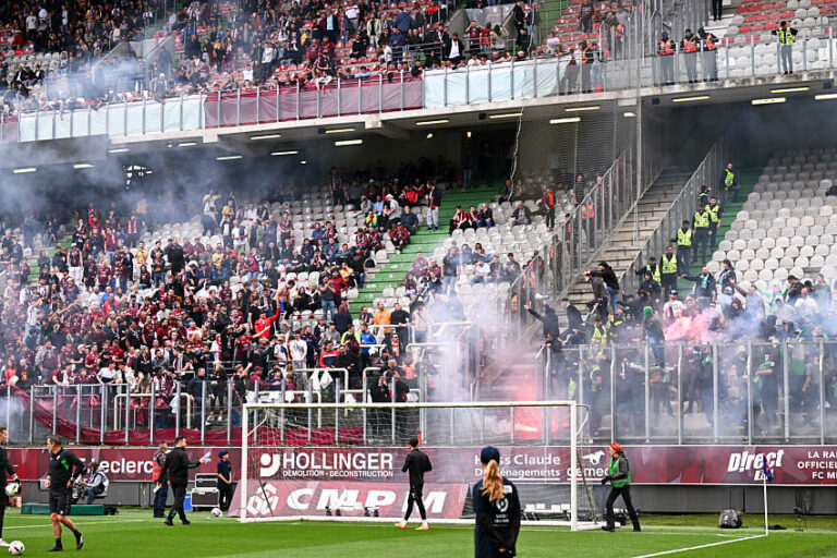 2,8K Réunie ce jeudi 20 juin, la Commission de Discipline de la LFP a pris des sanctions à l’égard du FC Metz suite aux incidents lors du barrage retour de Ligue 1 face à l’AS Saint-Etienne. Le FC Metz va être privé d’une partie de ses supporters pour le premier match à domicile de la saison 2024-2025 de Ligue 2 BKT. En effet, la Commission de Discipline de la LFP, réunie ce jeudi 20 juin, a décidé de sanctionner d’un match ferme la partie basse de la tribune Est du stade Saint-Symphorien. L’usage d’engins pyrotechniques, les jets d’objets et les insultes qui ont eu lieu lors du barrage retour entre le FC Metz et l’ASSE ont motivé la décision de la commission. De leur côté, les Stéphanois n’ont pas non plus été épargné. De retour en Ligue 1, le club du Forez sera lui aussi privé d’une partie de ses supporters pour son premier match à domicile de la saison. La Commission de Discipline sanctionne l’ASSE suite à l’usage d’engins pyrotechniques qui avait retardé le coup d’envoi du match aller des barrages de Ligue 1. La Commission de Discipline sanctionne un joueur du FC Metz Exclu dès la cinquième minute du barrage retour de Ligue 1, Papa Amadou Diallo a écopé d’un match de suspension ferme, plus un avec sursis. Le Sénégalais manquera par conséquent le premier match de la saison 2024-2025. Crédit photo : Icon Sport