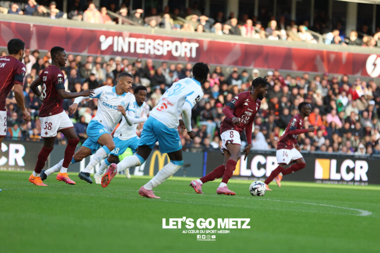 1,K La première victoire attendra encore. Devant un stade Saint-Symphorien à guichets fermés, le FC Metz a vu l’Olympique de Marseille dérouler, sans pouvoir rivaliser (0-3). Le temps presse mais ils n’y arrivent toujours pas. Les joueurs du FC Metz et leurs supporters n’ont pu que constater la différence abyssale de niveau qui les sépare de l’Olympique de Marseille, désormais leader provisoire de ce championnat. Et quel leader ! Dans l’utilisation du ballon, la finesse des passes ou pour sentir les bons coups, la copie marseillaise promettait d’être solide, elle a été impeccable. Les Messins étaient aux premières loges pour le constater. La décision s’était faite en tout début de deuxième période, lorsque Igor Paixao et Robinho Vaz combinaient dans la surface avant que le premier trompe Jonathan Fischer d’une frappe détournée par le malheureux Sadibou Sané (0-1, 54′). « Ce but vient vite, trop vite évidemment, avec en plus une situation qui n’est pas en urgence », déplore Stéphane Le Mignan. Le mal est fait. Et les Marseillais n’allaient plus jamais laisser une once d’espoir à des Messins qui avaient visiblement compris qu’ils étaient un ton au-dessus. Profitant du marquage bien léger de la défense, l’OM doublait la mise grâce au travail de l’entrant Amine Gouiri qui servait Matthew O’Riley tout seul dans l’axe, à l’entrée de la surface, pour ensuite trouver le petit filet gauche du gardien messin (0-2, 69′). Gouiri et O’Riley, encore eux, échangeaient les rôles quelques minutes plus tard dans la surface et, entre trois joueurs, utilisaient l’espace, minuscule mais suffisant, pour se passer la balle et la mettre une troisième fois dans le but du FC Metz (0-3, 76′). Un score qui s’est alourdi « trop facilement » pour le coach messin. Difficile d’exister Il n’y avait malheureusement pas que les buts qui s’inscrivaient trop facilement sur la pelouse de Saint-Symphorien. Les Marseillais jouaient un football où tout leur semblait simple, instinctif. Que ce soit au milieu de terrain ou dans la surface, l’OM confisquait le ballon aux Grenats. Et le score aurait pu être bien plus lourd si les montants n’avaient pas sauvé Jonathan Fischer à deux reprises avant l’ouverture du score (30′, 50′). En face, les Messins tentaient simplement d’exister et la fin de la première période laissait effectivement paraître un semblant de mieux, avec quelques incursions dans la surface : « Le sentiment à la mi-temps est positif, les joueurs sont bien, même si on défend beaucoup, explique Stéphane Le Mignan. On le faisait plutôt bien, on était contents de cela. » Photo : Julien Buret/LGM. Quand bien même, la bonne volonté des joueurs – un peu mieux exprimée après la copie indigente rendue contre Le Havre – s’est heurtée au mur de la réalité et aux carences techniques de l’équipe. Les centres trouvaient rarement preneurs et lorsque les Olympiens partaient à la faute, les joueurs du FC Metz n’arrivaient pas à en profiter. À l’image de cette occasion de Cheikh Sabaly qui ne remportait pas son duel seul face à Geronimo Rulli, suite à une boulette de Nayef Aguerd. Urgent de ne plus attendre « Je pense que je n’ai pas grand-chose à reprocher aux joueurs dans l’engagement », affirme le coach. Sur le plan technique en revanche, « on doit être capables de faire beaucoup mieux, assume-t-il. Tout est lié au jeu. L’idée, c’est d’avoir des capacités à garder le ballon aussi, pour éviter de courir et de défendre, notamment contre des adversaires qui sont redoutables. » Des capacités à développer et un constat sans équivoque alors qu’il est désormais urgent de lancer sa saison et que le public commence à tomber dans une forme d’impatience face au jeu proposé. Fait inédit de mémoire de jeune supporter, les groupes ultras ont quitté les gradins avant le coup de sifflet final. « Je les comprends », confie Jessy Deminguet. « À nous de nous se mettre au travail », ajoute le milieu de terrain qui assure qu’il « n’y a personne qui triche ». Sans victoire au compteur et alors qu’une trêve internationale démarre, les Grenats n’ont alors plus d’autre choix que de s’en remettre à de jours meilleurs. Et au charbon, aussi… au stade Saint-Symphorien. FC Metz 0 – 3 OM FC Metz : Fischer – Kouao, Gbamin (Colin, 21′), Sané, Yegbe, Ballo-Touré (Tsitaishvili, 78′) – Deminguet (Touré, 78′), Traoré, Hein – (cap.), Sabaly, Diallo (Madjo, 78′). Olympique de Marseille : Rulli – Weah (Murillo, 80′), Pavard, Aguerd, Emerson Gomes (63′) – Hojbjerg (cap), O’Riley (Vermeeren, 85′), Gomes, Greenwood – Vaz (Gouiri, 63′), Paixao (Nadir, 80′). Buts : Paixao (54′, 0-1), O’Riley (69′, 0-2), Gouiri (76′, 0-3). Avertissements : Aucun. Arbitre : Clément Turpin. Affluence : Environ 28 300 personnes. Photo : Julien Buret/LGM.