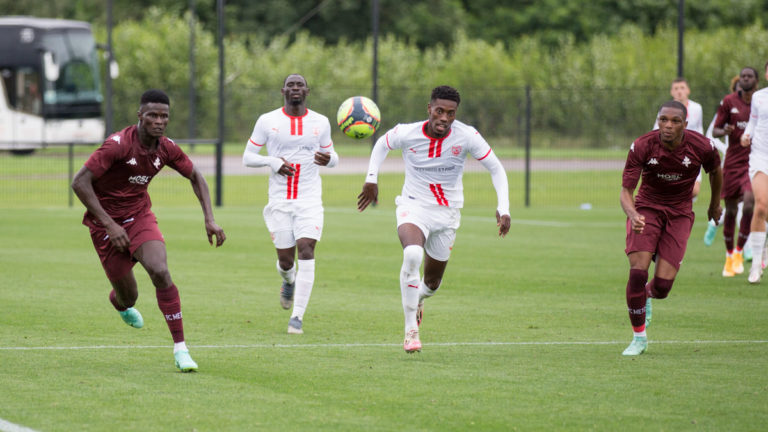 555 C’était la rentrée pour le FC Metz ce mardi ! Au programme pour les Grenats, la réception de l’ASNL dans le cadre de la première rencontre amicale de l’été. Le club à la Croix de Lorraine s’est imposé 3-2 face à son rival nancéien grâce à un but de Georges Mikautadze et un doublé de Lenny Joseph. Privé de bon nombre de ses internationaux africains (Bronn, Boulaya, Oukidja, Kouyaté, Fofana) revenus de vacances plus tard que les autres, ainsi que de Thierry Ambrose (douleur musculaire), Youssef Maziz, Vincent Pajot et Opa Nguette (reprise), le FC Metz abordait ce premier match de préparation face à l’ASNL avec l’ambition de faire le plein de confiance et de commencer à monter en régime. Face à des nancéiens qui ont déjà disputé quatre matchs amicaux, Frédéric Antonetti a opéré une large revue d’effectif. L’ASNL tient les grenats en échec… La compo de la 1ère mi-temps : Caillard – Centonze, N’Doram, Udol (C), Delaine – Maïga, Sarr, Bassi – Gueye, Niane, MikautadzeMalgré une grosse pression des visiteurs sur l’arrière-garde messine, la première occasion de la rencontre était à mettre au crédit des Grenats et de George Mikautadze, qui écrasait sa frappe du gauche après une belle ouverture d’Amine Bassi. (4′)Dominateurs dans la possession, les messins se sont malgré tout fait surprendre par un contre nancéien et une action confuse, conclue par Lefebvre. (0-1, 8′)La réponse mosellane a failli être immédiate, mais Amine Bassi, retenu dans la surface, manquait sa reprise sur une passe de Lamine Gueye devant le gardien. L’arbitre n’a pas bronché. (10′)Après un début de partie rythmé, une domination physique nancéienne commençait à se faire sentir. Les rouges et blancs ont en effet déjà disputé 4 matchs amicaux et sont en avance dans leur préparation. Sur une énorme frappe d’Akichi, Marc-Aurèle Caillard devait s’employer et réaliser une superbe parade. (21′)Malgré ce coup de moins bien, les Grenats allaient égaliser. Sur un amour de centre de Thomas Delaine, Georges Mikautadze n’avait plus qu’à conclure de la tête. Premier but de la saison pour l’ancien sérésien ! (1-1, 30°)Après une première période intéressante, teintée cependant d’une entame compliquée, le FC Metz est tenu en échec par l’ASNL à la pause. Mi-temps : 1-1. … avant que le FC Metz ne se rebiffe La compo de la 2ème mi-temps : Ba – Mikelbrencis, Lacroix, Mbengué, Boahene – Raillot, Traoré (C), Sabaly – Yade, Joseph, VagnerRevue d’effectif totale pour les Grenats à la pause, Frédéric Antonetti procédait à onze changements. Ce qui n’allait pas empêcher le néo-messin Lenny Joseph de doucher d’entrée les visiteurs et de placer les Grenats en tête ! (2-1, 49°)La réponse de l’ASNL fut malheureusement immédiate. Trop court dans sa sortie, Ousmane Ba était contraint de s’incliner devant Bertrand. (2-2, 53°)Le jeune gardien issu de Génération Foot se faisait pardonner quelques instants plus tard, grâce à une superbe parade en un contre un, face au même Bertrand. (65°)Une aubaine pour le FC Metz ! Sur un superbe débordement de Pape Ndiaga Yade, le très remuant Lenny Joseph convertissait l’offrande du sénégalais pour s’offrir un doublé ! (3-2, 80°)Suffisant pour le FC Metz qui s’impose 3-2 face à l’ASNL au terme d’une partie décousue, grâce à un but de Georges Mikautadze et un doublé de Lenny Joseph. S’il est bien sûr trop tôt pour tirer des conclusions, plusieurs Grenats se sont montrés particulièrement à leur aise au cours de cette partie. Les tops de la rencontre Buteur en première période, Georges Mikautadze a livré une prestation très intéressante. A l’aise dans les petits espaces, il a permis au jeu grenat de s’accélérer à plusieurs reprises. Bien qu’aligné sur le côté, son sens du but l’a porté dans l’axe pour conclure une offrande de Thomas Delaine.Ce même Thomas Delaine a lui, comme à son habitude, été omniprésent dans son couloir, aussi bien dans le travail défensif qu’offensif. Du grand classique pour l’ancien joueur du Paris FC.Amine Bassi s’est lui montré particulièrement habile dans l’entrejeu messin. Positionné en numéro 10, en soutien d’Ibrahima Niane, l’ancien nancéien a distillé plusieurs bons ballons face à ses anciens coéquipiers. Une partie positive pour le franco-marocain.Auteur d’un doublé en seconde période, Lenny Joseph a été incontournable cet après-midi. S’il n’avait plus qu’à conclure l’offrande de Pape Ndiaga Yade sur son second but, il ne doit en revanche rien à personne sur son premier but. Impressionnant par sa pointe de vitesse, il a déposé la défense nancéienne pour aller conclure face à un Baptiste Valette impuissant. Une belle surprise à confirmer lors des prochains matchs. Crédit photo : Matthieu Henkinet