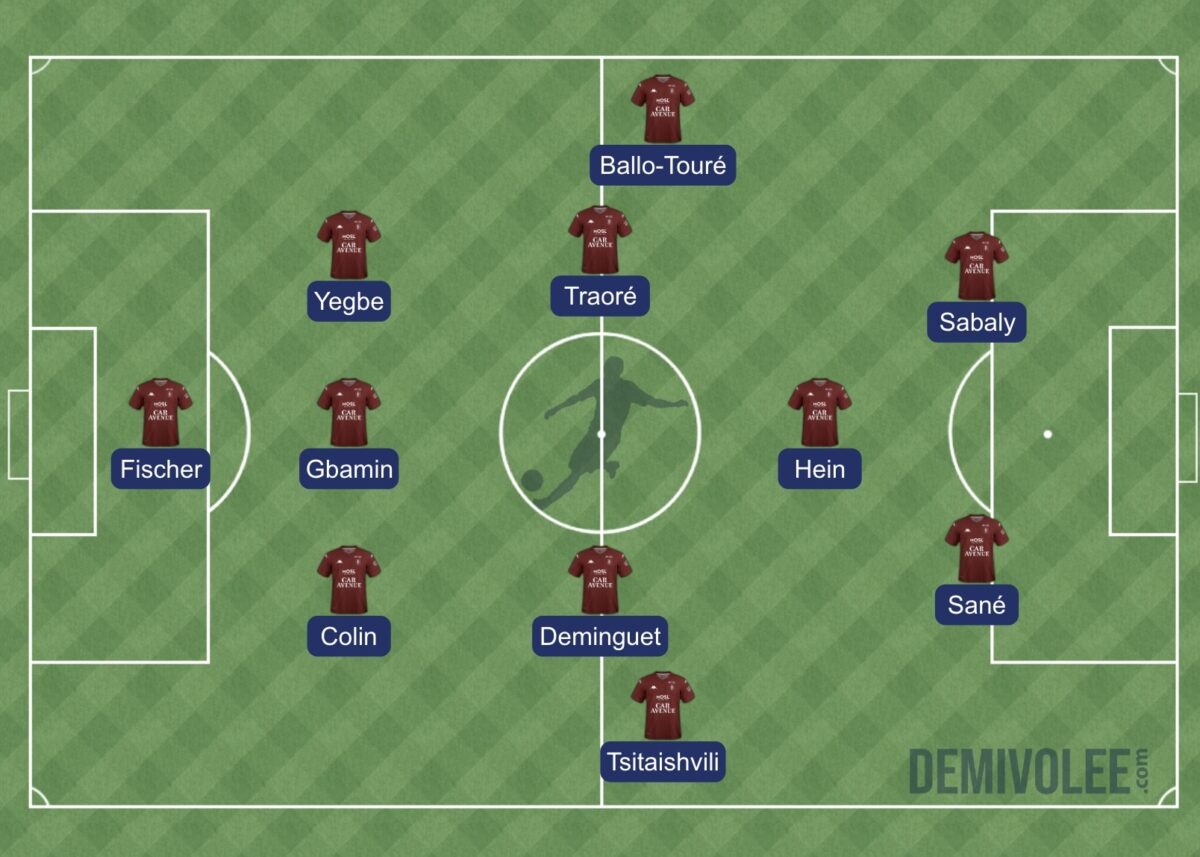 FC Metz : Fischer – Ballo-Touré (Mbaye, 76e), Gbamin, Yegbe, Colin, Deminguet (Touré, 75e), Traoré (Abuashvili, 88e), Hein, Tsitaishvili, Ibou Sané (Bokele, 76e), Sabaly (Asoro, 19e)
