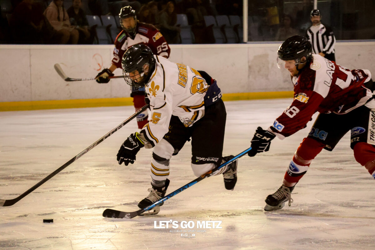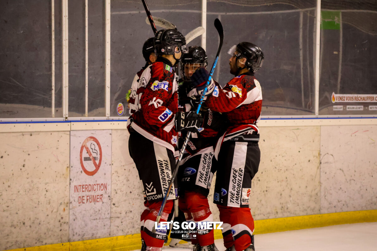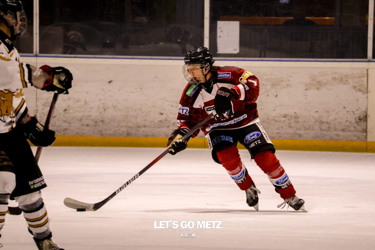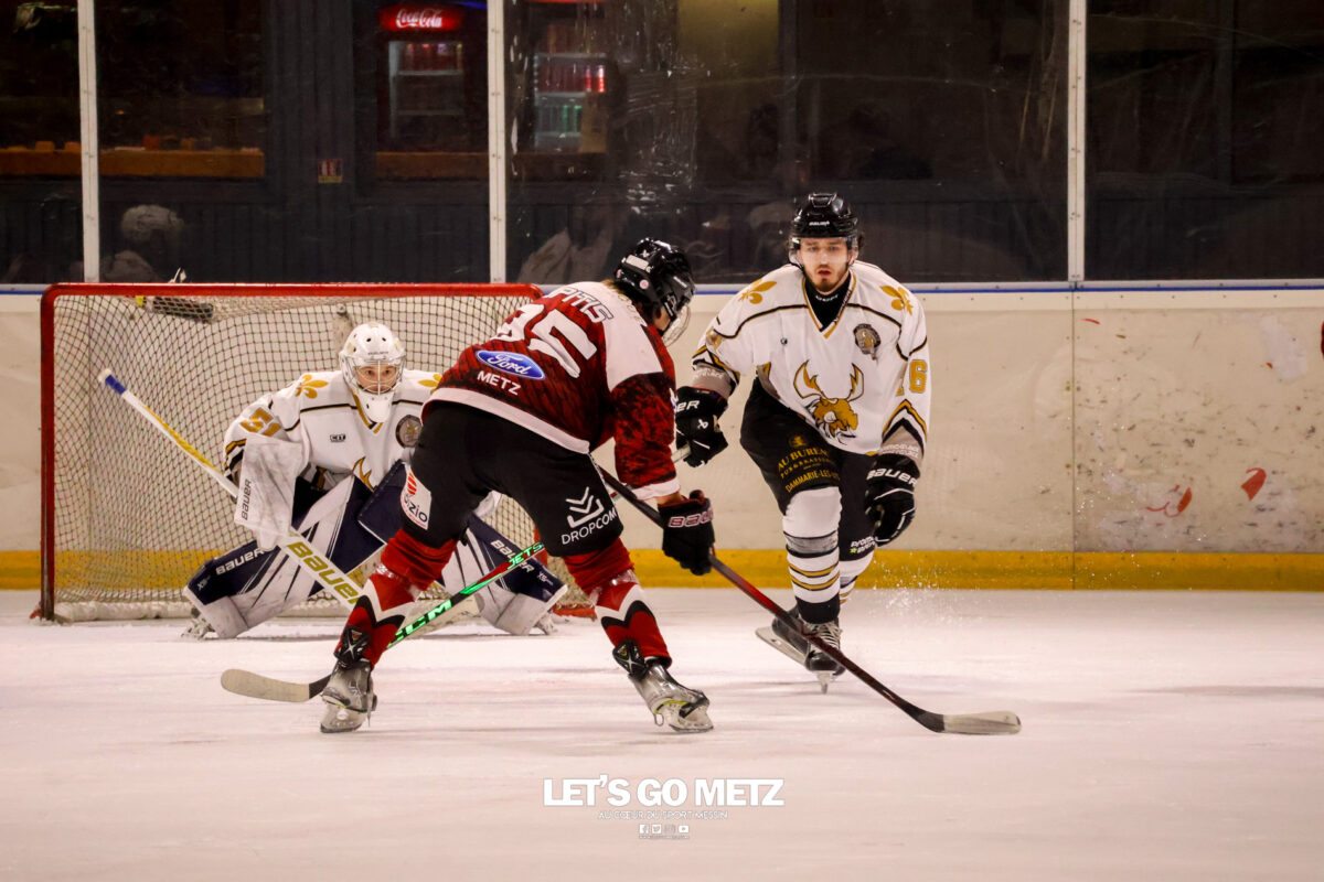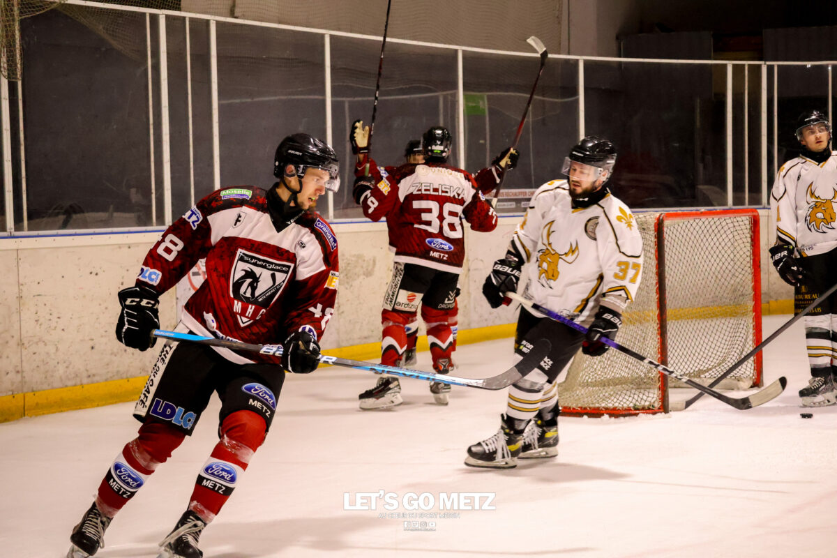 255 Le Metz Hockey Club a décroché sa première victoire de la saison en D3 ce samedi contre Dammarie. Un succès précieux acquis dans les derniers instants de la rencontre. Elle est là, la première victoire du Metz Hockey Club cette saison ! Après une élimination contre Dijon (D2) en Coupe de France et une défaite à Wasquehal en championnat, les Graoullys ont reversé Dammarie-les-Lys (5-3) samedi 11 octobre. C’est dans les derniers instants de la rencontre que s’est faite la décision, grâce à l’inévitable entraîneur-joueur Lukas Zeliska qui est venu délivrer les siens (4-3, 59’03) avant un ultime but du Letton Juris Upitis (5-3, 59’52).Un succès qui récompense les efforts des Messins qui avaient « à cœur de réagir » dans le sillage de leur recrue Jake Daprocida, auteur de deux assists samedi. Mais c’est Maxime Preud’Homme, un autre défenseur, qui avait parfaitement lancé le MHC dans la rencontre (1-0, 1’19). Pas suffisant pour mettre à distance les Caribous (1-1, 26’39).Les expérimentés Lukas Zeliska et Kevin Benchabane pensaient enfoncer leur adversaire (3-1, 44’26) mais les Seine-et-Marnais s’accrochaient et revenaient encore au score (3-3, 50’13), avant donc ce final heureux pour les Grenats. Metz Hockey Club 5-3 Dammarie Tiers-temps : 1-0, 1-1, 3-2. Buts pour le Metz Hockey Club : Preud’Homme (1’19), Zeliska (39’07, 59’03), Benchabane (44’26), Upitis (59’52) ; pour Dammarie : Marouillat (26’39), Bourgeois (47’55), Danton (50’13). Statistiques des Graoullys Zeliska : 2 points (2 buts) Upitis : 2 points (1 but, 1 assist) Daprocida : 2 points (2 assists) Benchabane : 1 point (1 but) Preud’Homme : 1 point (1 but) Stablo : 1 point (1 assist) Casula : 1 point (1 assist) Classement de D3 Crédit photo : Zoé Keller / Let’s Go Metz