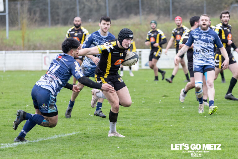 1,7K À l’occasion de la 16ème journée de la poule 3 de Fédérale 3, le RC Metz affrontait l’Olympique de Besançon Rugby. Les Messins ont remporté largement (42-14) cette rencontre qui pourrait être le tournant de la saison en vue d’une qualification en phases finales du championnat. Deux semaines après un succès difficile à domicile face à Colmar, le RC Metz avait l’obligation de gagner à nouveau à la maison, face à l’Olympique de Besançon Rugby, pour se rapprocher de la phase finale de Fédérale 3. En raison de certaines absences, l’entraîneur Géraud Gas devait refaire confiance à son adjoint Alexandre Bonjean au poste de demi d’ouverture. Une nette domination du RC Metz Crédit Photo : Matthieu Henkinet/Let’s Go Metz Le RC Metz commençait les hostilités après cinq minutes de jeu en inscrivant un essai grâce à Bastien Walter. Il était ensuite transformé par Alexandre Fabre (7-0, 5′). Le réalisme des Messins frappait à nouveau les joueurs de Besançon avec un deuxième essai, marqué cette fois-ci par Alexandre Bonjean et toujours transformé par Fabre (14-0, 9′). Le demi de mêlée Valentin Grandemenge participait également à la fête en mettant un troisième essai, deux minutes plus tard (21-0, 11′). La puissance physique des hommes de Géraud Gas transperçait une défense bisontine à la dérive. Le troisième ligne Quentin Agnès en profitait pour mettre un quatrième essai, toujours avec Alexandre Fabre à la transformation (28-0, 28′). Toutefois, Besançon finissait par se relancer avec un essai transformé en toute fin de première période (28-7, 40′). Largement dominateur, le RC Metz rentrait aux vestiaires avec une avance confortable et une victoire quasiment acquise. Score à la mi-temps : RC Metz 28-7 Olympique de Besançon Rugby Une victoire avec la manière Moins de dix minutes après la reprise de la rencontre, l’Olympique de Besançon Rugby marquait un second essai transformé par le duo Bergerot–Rischmann (28-14, 49′). Cependant, le RCMM répondait parfaitement quelques instants plus tard avec un essai de Stanislas Vaisioa, transformé par l’incontournable Fabre (35-14, 51′). La machine se remettait alors en route côté messin et le deuxième centre Arnaud Strentz mettait le sixième et dernier coup de poignard à une équipe visiteuse dépassée (42-14, 56′). Malgré des incursions dans les derniers mètres mosellans, les joueurs de l’OB ne réussissaient pas à réduire l’écart. Ainsi, le RC Metz s’imposait sans trop de difficultés face à l’Olympique de Besançon Rugby (42-14). De plus, le club a obtenu un point de bonus offensif, qui pourrait avoir des conséquences en fin de saison. Score final : RC Metz 42-14 Olympique de Besançon Rugby Cette neuvième victoire rapproche les Messins d’une place de barragiste. Ils ont désormais six points d’avance sur Colmar, à deux journées du terme de cette saison régulière de Fédérale 3. Ainsi, avec un nouveau succès, le RC Metz serait sans doute qualifié pour les phases finales du championnat. Une mission qui sera à accomplir dimanche prochain face à Genlis, au Stade de la Grange aux Bois. Crédit Photo : Matthieu Henkinet/Let’s Go Metz