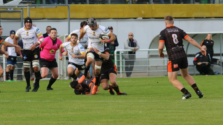 829 Le RC Metz rencontrait l’équipe d’Orsay ce dimanche dans le cadre de la quatrième journée de Fédérale 2. Un match de première partie de tableau qui a tenu ses promesses. La Grange au Bois s’attendait à un choc entre le RC Metz, 6ème de la poule 2 et Orsay, 4ème. Les deux équipes sont proches au classement mais ont un parcours bien différent. En effet, le RC Metz est néophyte en Fédérale 2 et continue de s’y adapter avec un groupe très jeune tandis qu’Orsay est stable dans la compétition depuis 2010 et a même failli s’en extirper par le haut en 2020.Respectivement détenteurs de 9 et 10 points au classement avant la rencontre, les deux équipes pouvaient se prendre à rêver vers le haut de tableau en cas de victoire, une situation somme toute enviable dans un début de saison relevé. En ouverture, les équipes B se quittaient sur un score de 57 à 8 en faveur des locaux. Malgré tout il ne fallait absolument pas faire de ce score fleuve une garantie pour le « main event ». Tôt dans le match, l’attaque Orcéenne ouvrait le score par un essai transformé et mettait le RC Metz dans une position qu’il ne connaît que trop bien : celle du poursuivant. Malgré tout, peu après le quart d’heure de jeu Eliott Albert remettait les pendules à l’heure avec un essai, non transformé, pour revenir à 5 – 7. Un score symbolique, mais évidemment insuffisant, que Fabre faisait fructifier sur deux pénalités dix minutes plus tard. Les visiteurs, bien gourmands, répondaient par des essais à la 33ème et la 39ème ainsi que par une pénalité et le retour au vestiaire s’effectuait sur le score de 11 à 22. Le tournant du match : trois essais en 15 minutes En deuxième mi temps, les joueurs d’Orsay étaient une nouvelle fois les premiers à dégainer avec un nouvel essai transformé. Comme souvent, le RC Metz agissait en réaction et aplatissait à son tour un ballon dans l’en-but par l’intermédiaire de Paul Anton Rouyer et Scott Browne, fraichement entré en jeu, assurait les précieux points de la transformation. Le match semblait alors s’emballer avec deux essais en 10 minutes. Les Orcéens manifestement peu enclins à laisser filer leur avance allumaient un peu plus la mèche en allant aplatir leur cinquième essai quatre minutes plus tard. Un sursaut des locaux, conclu dans l’en-but par Hugo Perrin, permettait aux Messins de croire encore à un éventuel bonus défensif, mais Orsay clôturait les débats avec une sixième réalisation à quelques minutes de la fin de la rencontre. Les hommes de Ludovic Mercier s’inclinaient donc en encaissant plus de 40 points, il n’y aura pas de renversements comme au Creusot chaque semaine. Score final : 25 – 43 Avec un bilan partagé de deux victoires pour deux défaites, le RC Metz reste accroché à une sixième place centrale dans le classement de Fédérale 2.Le prochain match pour les rugbymen Messins se disputera à l’extérieur, sur le terrain d’Orléans le 17 Octobre, avant un retour à domicile le 24 Octobre face à Ris Orangis. Deux équipes pour le moment mieux classées avec chacune trois victoires pour une défaite. Crédit photo : Daniel Capra