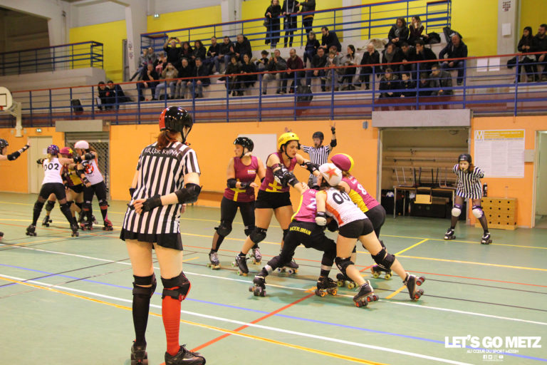 565 Ce dimanche, le Roller Derby Metz Club fait sa rentrée et organise une session de découverte au Gymnase André Malraux. Au programme, présentation du club, explication des règles, patinage et match de démonstration. Glisse, contact, stratégie, équipe : Il est temps de tester un sport insolite, le Roller Derby ! Le roller derby c’est un sport de contact qui rappelons-le, se pratique sur quads (patins à roulettes) en équipe sur une piste ovale. Deux équipes s’y affrontent pour que son attaquante (qu’on appelle la « jammeuse« ) dépasse le plus de fois possible les défenseuses (qu’on appelle les « bloqueuses« ) de l’autre équipe. Pour cela, les contacts sont autorisés, mais tous les coups ne sont pas permis ! Nous vous faisions découvrir cette pratique haute en couleur à Noël dernier lors du Jammin’ Around The Christmas Tree contest, peu de temps avant qu’un certain virus ne vienne mettre un coup d’arrêt à toute pratique sportive et collective. Mais cette fois, ça y est, le Roller Derby Metz Club fait son grand retour et organise une session de découverte. Au programme, présentation du club, explication des règles, patinage (pour celles qui le souhaitent) et match de démonstration. Le Roller Derby Metz Club fête d’ailleurs ses 10 ans cette année ! Une quarantaine de licenciés, deux équipes (compétition et loisir) qui font vivre le club et surtout, l’équipe A, la All Star, qui est actuellement engagée dans le championnat de France – Nationale 1. Pour devenir membre, pas besoin de savoir patiner, l’école de patinage accueille les grandes débutantes pour leur apprendre les rudiments : patiner en avant / en arrière, freiner, savoir tomber, patiner en groupe… Alors rendez-vous dimanche au gymnase André Malraux dès 16h00 !Toutes les infos sont dispos ici Rédaction : merci à Marion Chevillotte / Crédit photos : Julien Buret et Gérald Russello