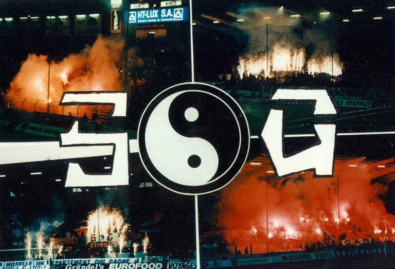 718 07 août 2019, à l’heure où j’vous écris, il est 21h30, l’orage gronde sur la campagne lorraine, on est à quelques jours de la reprise du championnat chez les cigognes, et je viens de terminer une discussion d’un peu plus d’une heure avec Raf… D’ailleurs à chaque fois qu’on s’appelle ça dure rarement moins d’une heure. Que ce soit pour la musique et le partenariat qu’on a commencé récemment à distance, ou l’évocation d’un passé commun en tribune, il nous est difficile de raccrocher, tant nous avons à partager. C’est dingue comme la nostalgie d’une époque, d’un mouvement, d’un groupe… d’une famille, peut raviver des émotions et inviter à la réflexion. Craquage « côté autoroute » Quelques jours plus tôt, par mail : Raf : Hey Gérald, je suis en retard, crois m’en désolé. Je me suis d’ailleurs fait souffler dans les bronches par des anciens. Seb m’a précisé que lors de notre (premier) départ en seconde (dont je parlais dans l’épisode précédent) nous étions 28 et pas 37. Ninou m’a fait savoir que la suite de la « croisade orange » se faisait attendre… Ces deux premiers opus m’ont aussi permis de reprendre contact avec Mike. Comme à l’époque, ce partage nous rassemble au-delà des villes, des pays et du temps qui passe. Pour rappel, les épisodes 1 et 2 sont disponibles ici : https://letsgometz.com/le-soleil-se-leve-a-lest-episode-1-la-prehistoire/ https://letsgometz.com/le-soleil-se-leve-a-lest-episode-2-laube-de-la-section-graoully/ Bon pour les brèves, je viens de déménager, suis encore dans les cartons (et tout aussi en retard pour les paroles que je t’ai promises pour ton morceau « picking »). Qui plus est, il est délicat de se souvenir de tout, et de manière parfaitement chronologique. Une telle présentation serait quoi qu’il en soit inadéquat s’agissant d’aborder ce troisième épisode. La Graoullymania est une maladie contagieuse qui propage le kaos partout où ses dépositaires se regroupent. Montage carte postale de l’époque J’évoquais le territoire que se doit d’avoir un groupe ultra. Pour nous il était là où nous étions : tribunes seconde, première, stades de France ou d’Europe, sur la route, dans les bars, les raves, les salles de concert,…. Mais revenons à fin septembre 1992 (saison 92/93) … Retour en première 1992-93 L’ambiance en première est largement retombée : depuis notre départ, le kop a perdu sa voix. La majorité de ses membres nous demande instamment de revenir. Tout le monde trouve finalement un intérêt à ce regroupement : le kop, pour stopper l’hémorragie, et la SG laquelle peut alors rejoindre, ce qui reste tout de même « à cette époque », la tribune historique où se retrouvent ceux qui chantent. La seconde génération prend ses responsabilités, les fondateurs restent présents et actifs, le groupe peut donc grandir. Carte membre 1994 La tache orange repositionnée en bas du kop, bâche sur le balcon. Nous allons rapidement prendre l’ascendant : chants et tifos vont progressivement gagner en qualité, nous séduisons, sans vraiment le vouloir. Nous réalisons (enfin) par ailleurs du matériel original et de bonne facture. Il faut bien comprendre, que nous étions déjà une famille et que nous nous foutions royalement de l’image que nous pouvions renvoyer. Mais cette expansion, manifestée par la prise d’assaut du grillage lors de buts, est bien réelle. C’est bien évidemment lors des déplacements où nous la mesurons : nous sommes de plus en plus attendus au tournant. Quelques exemples méritent d’être évoqués dans un joyeux désordre chronologique. Déplacement à Strasbourg : Les ultras nonante (qui, à l’époque, se croyaient encore en quarante) déploient une banderole « bienvenue à la section Grassouille – les casimirs de la D1 ». Trois semaines après, nous sortons une écharpe « anti-strasbourgeois » avec en son centre un casimir hilare, sodomisant une cigogne. Déferlante orange à la Meinau Je passe sur les affrontements à chaque derby de l’est à la Meinau, toujours plaisants, notamment lorsque nous sommes tombés nez à nez en coursive avec une joyeuse bande de hools du KSC, majoritairement affublés de moustaches pendantes, lesquels resterons dans l’histoire comme « les gitans de Karlsruhe », titre d’une banderole géante déployée au match retour. C’était l’époque des meinau boys/elsass korps, néonazis notoires qui tendaient le bras dans une indifférence difficile à imaginer aujourd’hui, et que nous étions seuls à rompre en les traitant allègrement et en restant présents au contact… Public, police, club, ou ultras nonante, le peuple strasbourgeois s’en accommodait apparemment. Une autre époque. Metz Strasbourg 94.95 Quelques années après la disparition du groupe, un tifo des UB nonante, visiblement nostalgiques, lors d’un derby, reprendra d’ailleurs le casimir… Déplacement à Lille : Nous sommes moins de quarante, et sommes placés en virage à l’opposé de leur kop. A l’époque, les DVE (Dog Virage Est) étaient adeptes du hooliganisme et de la croix celtique, alors on les traite allègrement. Petite aparté : nous traitions tout le monde, pas seulement les skins hein, les joueurs adverses, nos joueurs, les supporters adverses, tout le monde en prenait pour son grade. Lille – Metz 1993-94 Nous savions qu’ils étaient nombreux, affutés à la fight et plus âgés que nous. Toute personne sensée aurait évité de les provoquer. Du coup, ils viennent au contact, entre 100 et 150 dans mon souvenir, nous sommes uniquement séparés par un grillage. Trois policiers se cachent en haut de notre parcage en nous prédisant le pire. Ils tentent de passer la grille pour prendre la bâche, on les repousse, puis on les gaze. Nous passons le reste du match à nous prendre des pierres et autres objets sur la face. Ils chargeront le bus à la fin, san