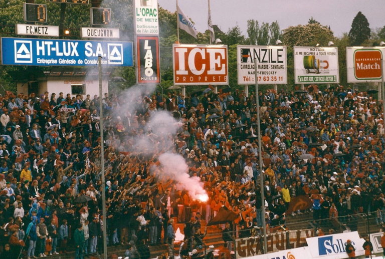 1,1K 27 août 2019 : Raph : Hey fils, tu as vu ce tifo des UB nonante lors du match du 11 août dernier ? [Le soleil se lève à l’Est, mais ne brille que sur Strasbourg] Ils ont (baissé la tête et) plagié notre titre avec une goujaterie toute alsachienne. Gérald : En plus ces lâches sont venus taguer les abords du stade comme des pleutres pendant la nuit, la veille du match… bref. On est parti pour le 4ème épisode ? R : Avant toute chose, j’ai eu quelques retours d’Isham à la suite du dernier épisode, et dois à la vérité de préciser que la bâche de la butte paillade avait été dérobée « à la régulière » juste après la fin de la SG par un groupuscule éphémère (Indépendants Tribune Autoroute) constitué par des ex Graoully. Elle a été effectivement rendue par… le Taureau, si bien que les motivations de ce geste restent inexpliquées (lapalissade). Qui plus est, l’épisode de la Horde sauvage a bien eu lieu la même année que la charge contre les sochariens. Pour le reste, nous pouvons continuer… Ici commence la geste du crépuscule de la SG. L’apocalypse ne signifie pas (seulement) la fin du monde. Étymologiquement, apó (« hors de ») en grec ancien est un préfixe marquant l’idée de mettre dehors, éloigner, repousser, s’opposer, et kalupto signifie cacher, envelopper ; mot à mot, dé-ca-cher. Autrement dit, révéler. Une autre illustration de la mécanique de l’alchimie, précédemment exposée. G : Je tiens quand même à préciser que ma version de Word (tout comme moi) ne connaissait pas le féminin de « geste » et son sens tout approprié, et l’a surligné. Je tenais à le dire… voilà, tu peux continuer. Parlons du crépuscule… R : Le crépuscule des Graoully, loin d’être une fin, va s’avérer être une révélation. Mais revenons à une tentative de récit chronologique. Nous embarquons donc pour revenir en Tribune Seconde, dorénavant et jusqu’à désormais, « ici, chante la jeunesse messine ». Plus qu’une banderole déployée lors du premier match (suivi d’incidents avec une ou deux bâches que nous n’avons pu éviter de voir balancées dans le canal), cette affirmation allait traduire une véritable explosion du groupe. Mes souvenirs s’embrouillent un peu, mais je partage l’expression utilisée par Olivier : « nous marchions sur l’eau ». G : A l’inverse, c’est la période dont je me rappelle le plus, même si je participais déjà côté autoroute depuis quelques temps, c’est là véritablement que j’ai adhéré au projet, sur le tard malheureusement, mais je ne manque pourtant pas de souvenirs et d’images qui resteront gravées à vie… l’ambiance était exceptionnelle et… visuellement… bordel on était bon ! R : Absolument… Tifos, chants, nombre de sympathisants, nous grandissions comme un champignon hallucinogène sous l’arbre humide. Nous allions devenir le véritable moteur de Saint-Symphorien, préfigurant sa configuration actuelle. En face, le kop va disparaître rapidement. Enfin, évoquons plutôt sa transformation vers une image plus ultra, avec la création de génération grenat. Une image, car au fond, les fondamentaux, comment dire, patriotes, restent bon an mal an les mêmes, avec leur cortège de comportements intolérables, qui sont le fait, précisons-le, d’une minorité, mais que la majorité semble néanmoins tolérer. Passons. Ou plutôt non, nous y reviendrons en fin d’épisode. G : On peut effectivement en parler, sans attiser de haine et souffler sur des braises encore chaudes, après tout c’est notre histoire, certains incidents l’ont façonnée. R : Les incidents n’ont jamais cessé. J’ai souvenir d’un déplacement à la Meinau (l’année où je lance « vous vous asseyez » et que le groupe reprend à l’attention des cigognes médusées et aphones, « vous vous taisez !!! ») où les strass viennent au contact mais se trouvent dépités car nos deux blocs s’affrontent avec allégresse. Du coup, nous sommes séparés lors des déplacements (rien de bien nouveau donc…). Seules les photos de l’époque peuvent fidèlement illustrer cette période enivrante pendant laquelle le kaos est en ébullition continue. Mais Gérald, tu as certainement des souvenirs à partager par rapport à ça ? G : Oh je sais très bien où tu veux en venir mon cher Raph… Alors oui. C’est vrai, je n’ai jamais réellement participé à ces fights. J’étais jeune, 16 ans en 95 pour être exact, et ma priorité, outre le FC Metz, c’était la musique et les nanas. J’n’ai jamais été très bagarreur, pour moi la SG ça reste avant tout une expérience sociale et un sentiment d’appartenance, très fort, une meute avec ses différents acteurs, des gueules cassées, des types incroyables avec des personnalités fortes. Des détails qui me restent, comme le taureau et son gruyère (Il achetait toujours un gruyère entier avant le match, c’était son repas) c’est con mais ça m’est resté, certains de ces mecs m’impressionnaient beaucoup, et me retrouver au milieu d’une troupe aussi déjantée mais qui nous acceptait, nous jeunes loups encore innocents que nous étions, c’était fort. Octobre 95 « Les grenats en tête du championnat. » J’aimais nos rassemblements d’avant match, sur le parking du Lidl, nous étions, mes potes et moi des jeunes recrues, volontaires pour les chants, drapeaux, les tifos, mais quand il fallait se frotter aux éventuels groupes adverses, nous étions tout de suite moins fiers. Je pourrais évoquer par exemple la charge contre Bordeaux, c’est une anecdote assez représentative de l’époque. 17h30/18h distribution de bâtons, de torches, devant le Lidl… mes potes et moi écoutons attentivement un discours à la Braveheart (Je ne dirais pas de qui ça émanait…) « Quand vous chargez, regardez droit devant vous et n’ayez pas peur même s’ils sont plus nombreux, vous frappez direct la pre