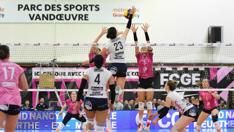 370 Le TFOC est éliminé des play-offs après sa deuxième défaite en trois matchs contre Vandoeuvre-Nancy. Bien lancé, puis vite mis en difficulté, notamment par Pimpichaya Kokram, Terville Florange a réussi à égaliser avant de décliner dans les troisième et quatrième sets. La saison se termine sur une cruelle défaite. Un match dans lequel le TFOC a lutté jusqu’au bout pour tenter de se qualifier face à Vandoeuvre-Nancy. Mais les Mosellanes ont échoué lors de cette ultime confrontation. Avec cette troisième rencontre en moins d’une semaine, elles ont manqué d’énergie pour refaire le coup du retour. « Le premier mot qui me vient, c’est la déception parce qu’on avait les armes. On n’a pas réussi à se libérer », a réagi Romain Pitou après l’élimination de Terville Florange des play-offs. La réaction du TFOC Le TFOC était pourtant tout de suite dans le match. Un ace de Julia Haggerty, suivi d’un contre de Tatiana Kulikova, donnait le ton (3-6). Côté Vandoeuvre-Nancy, la réponse venait de Pimpichaya Kokram. En difficulté lors de la dernière rencontre, la Thaïlandaise retrouvait son bras. Et tout changeait pour le VNVB. Ajla Paradzik signait deux services gagnants (15-12). La salle prenait feu. Très vite, les Mosellanes retombaient dans leurs travers, avec une réception moins solide et un service moins tranchant. Elles subissaient les frappes incessantes de Kokram (25-19). La dynamique nancéienne ne s’arrêtait pas. Les joueuses de Nicola Vettori maintenaient une pression constante (10-5). Malgré un bon début de partie, la rencontre commençait à échapper à Terville Florange. Mais une improbable remontée allait tout inverser. Menées 13-16, les Bleues enchaînaient une série de six points d’affilée. Entrée au même moment à la place de Winderlys Medina, Grace Chillingworth participait à la fête (16-19). Tout n’était pas fini pour autant. C’était au tour de Vandoeuvre-Nancy de remonter au score en s’offrant même une balle de seconde manche. Insuffisant pour déstabiliser le TFOC (25-27). Tatiana Kulikova et Dayana Segovia lors du deuxième match face à Vandoeuvre-Nancy. © Mikaël Frank – Let’s Go Metz Les Bleues ont lâché Piqué au vif, le VNVB réagissait immédiatement (6-0). Un véritable récital. Les Mosellanes stoppaient difficilement l’hémorragie. Une fois résorbée, elles reprenaient des couleurs. Mais Leïa Ratahiry maintenait un écart confortable entre les deux équipes (14-9). Malgré plusieurs tentatives de retour, les joueuses de Romain Pitou concédaient le set (25-21). Le début de la fin pour elles. Encore dans le coup à l’entame de la quatrième manche, le TFOC lâchait peu à peu. Les Tervillo-Florangeoises ne trouvaient plus les réponses. Ajla Paradzik mettait un terme aux espoirs mosellans (25-15). Vandoeuvre – Nancy 3 – 1 TFOC Sets : 25-19, 25-27, 25-21, 25-15. Composition Vandoeuvre-Nancy : Karakasi, Wolowicz, Robinson, Kokram, Paradzik, Ratahiry et Agnese (L). Entrées en jeu : Popete, Lehto, Bennour. Composition TFOC : Strand, Haggerty, Medina, Segovia, Kulikova, Hendrickson et Coulet (L). Entrées en jeu : Chillingworth, Erman, Noble. Crédit photo : Mikaël Frank – Let’s Go Metz (archive).