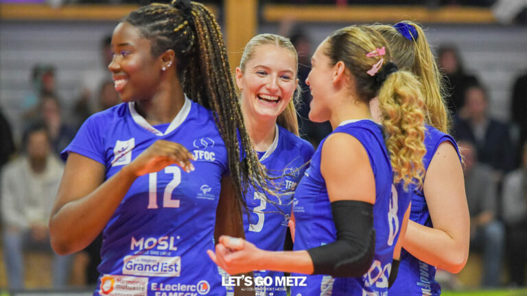 879 Le TFOC a écrasé France Avenir 2024, en trois sets, samedi soir. Devant leur public, les Bleues ont signé une quatrième victoire consécutive. Le TFOC s’est débarrassé de France Avenir 2024, en trois sets, samedi soir. Après les trois points à Chamalières, Terville Florange signe une quatrième victoire consécutive devant son public. Les Mosellanes continuent sur leur dynamique avec dix-sept points au classement désormais. Face à la jeunesse française, les coéquipières d’Alba Sanchez n’ont eu aucune difficulté à disposer de leur adversaire. La pression au service Au coup d’envoi, les deux équipes commettaient quelques erreurs. Une fois les fautes gommées, le TFOC dominait France Avenir 2024 (13-6). Tatiana Kulikova aggravait l’avantage au score par ses attaques tranchantes. Avec la libéro comme cible au service, les Bleues remportaient la première manche (25-13). Rentrée en fin de set, Aminata Dia prenait la place de Mariam Sidibé dans le six de départ. La centrale française signait l’un des blocs de la soirée en un contre un (10-4). Malgré un léger rapproché, Terville Florange remettait un coup d’accélérateur. Romain Pitou en profitait pour ouvrir son banc. Elissa Baklouti, Manon Louessard et Paulina Perez Rosas foulaient le terrain (25-15). Dès l’entame de la troisième manche, France Avenir 2024 comprenait sa défaite (9-3). La qualité au service du club mosellan rendait la rencontre encore plus facile. Avec ses premiers pas devant ses supporters, Dariana Hollingsworth-Santana contribuait au succès logique du TFOC (25-15). Deux semaines sans match Sans surprise, les Tervillo-Florangeoises ont pris les trois points. Toutes les joueuses ont livré une performance solide face à France Avenir 2024. Avec les entrées d’Elissa Baklouti et Manon Louessard, Romain Pitou a donné du temps de jeu à son centre de formation. Cette quatrième victoire consécutive maintient la pression sur les concurrents du haut de tableau. Après cette 8ème journée de Ligue A féminine, le TFOC ne croisera aucun adversaire durant les deux prochaines semaines. Le 2 décembre prochain, les Bleues se rendront à Cannes pour continuer à regarder vers les premières places. TFOC 3 – 0 France Avenir 2024 Sets : 25-13, 25-15, 25-15. Composition TFOC : Kosonen, Szücs, Van Sas, Kulikova, Lindgren, Sidibé (C) et Sanchez (L). Entrées en jeu : Dia, Baklouti, Louessard, Perez Rosas, Hollingsworth-Santana. Composition France Avenir 2024 : Blanc, Chouikh-Barbez (C), Girgenti, Mobisa, Pezelj, Sebiti et Leroy (L). Entrées en jeu : Iloai, Jioshvili Ravva, Galabert. Crédit photo : Mikaël Frank / Let’s Go Metz