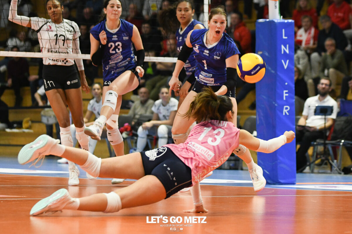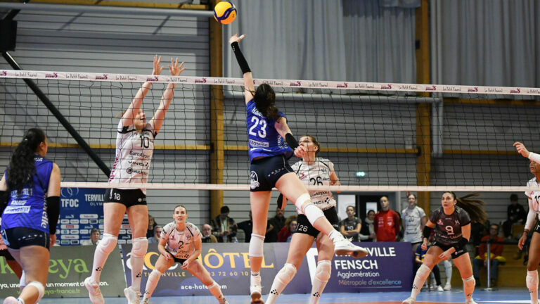 133 Le TFOC s’est défendu comme il pouvait face à Mulhouse. Pas loin de prendre un set, Terville Florange perd en trois manches et peut-être aussi Winderlys Medina. Pas de miracle pour les Bleues. C’est ce qu’il fallait au TFOC pour mettre un terme à l’invincibilité de Mulhouse depuis le début de saison. Malgré une belle bataille, notamment dans la première et dernière manche, les joueuses de Romain Pitou se sont inclinées logiquement en trois sets. Difficile de rivaliser face à l’armada offensive adverse, surtout pour Terville Florange, toujours diminué par les blessures. Ce match peut même remplir encore un peu plus l’infirmerie avec la sortie sur blessure de Winderlys Medina, touchée au niveau du pied. Avec cette troisième défaite en trois rencontres, les Mosellanes voient Chamalières passer devant au classement. Un bon début de match Le TFOC mettait la pression d’entrée (4-0). Une surprise pour Mulhouse qui avait encore la tête à la Coupe d’Europe. Sans rythme, les Alsaciennes multipliaient les fautes. Les Bleues en profitaient pour maintenir leur avance. Izzi Strand montrait son retour comme titulaire par une deuxième main bien sentie (9-5). Contre toute attente, l’Américaine et ses coéquipières dominaient la partie jusqu’à compter six points d’avance. Mais tout basculait avec l’entrée de Valeriia Gamanovich. Aidée par Alondra Vázquez, la Grecque martyrisait la réception mosellane. En un rien de temps, le VMA revenait et passait devant (18-21). Un retard impossible à rattraper (19-25). L’histoire se répète Malgré la série noire de la fin du set, Terville Florange ne se laissait pas abattre. Megan Wilson lâchait le bras pour marquer avec autorité (7-3). Comme au début de la rencontre, les Mosellanes menaient la danse. Mais, à la différence de la première fois, la réaction mulhousienne se faisait plus pressante. Elle passait par Uliana Kotar. L’Ukrainienne étalait de tout son talent pour offrir quatre points à son équipe (10-14). Pourtant, les joueuses de Romain Pitou tentaient un retour. Une tentative vite balayée. L’entrée express d’Isabella Noble, vite ressortie, ne changeait rien. Comme un symbole, c’était Lexi Hadrych, l’ex-Mosellane, qui concluait la manche (16-25). Medina sort blessée À défaut d’avoir bien entamé les sets jusqu’à présent, Mulhouse résistait davantage (6-7). Les Alsaciennes semblaient définitivement parties vers la victoire. C’était sans compter sur le TFOC. Les Bleues jetaient leur dernière force dans la bataille. Avec du caractère, les Tervillo-florangeoises faisaient désormais largement la course en tête (20-13). Mais là encore, la machine se grippait. Lexi Hadrych avait décidément une envie de l’emporter face à son ancienne équipe. Après une série magistrale au service, la numéro 2 remettait tout le monde à égalité (20-20). Un retour qui mettait un sacré coup derrière la tête des Mosellanes. D’autant plus avec la sortie sur blessure de Winderlys Medina touchée au niveau du pied. Uliana Kota, MVP de la rencontre, donnait la victoire au VMA (26-28). TFOC 0 – 3 Mulhouse Sets : 19-25, 16-25, 26-28. Composition TFOC : Strand, Wilson, Medina, Taofifenua, Haggerty, Chillingworth et Erman (L). Entrées en jeu : Noble, Louessard, Gerard. Composition Mulhouse : Moreno, Kotar, Vasquez, Rutherford, Strong, Evans et Soldner (L). Entrées en jeu : Gamanovich, Olinga-Andela, Hadrych. Crédit photo : Mikaël Frank – Let’s Go Metz.