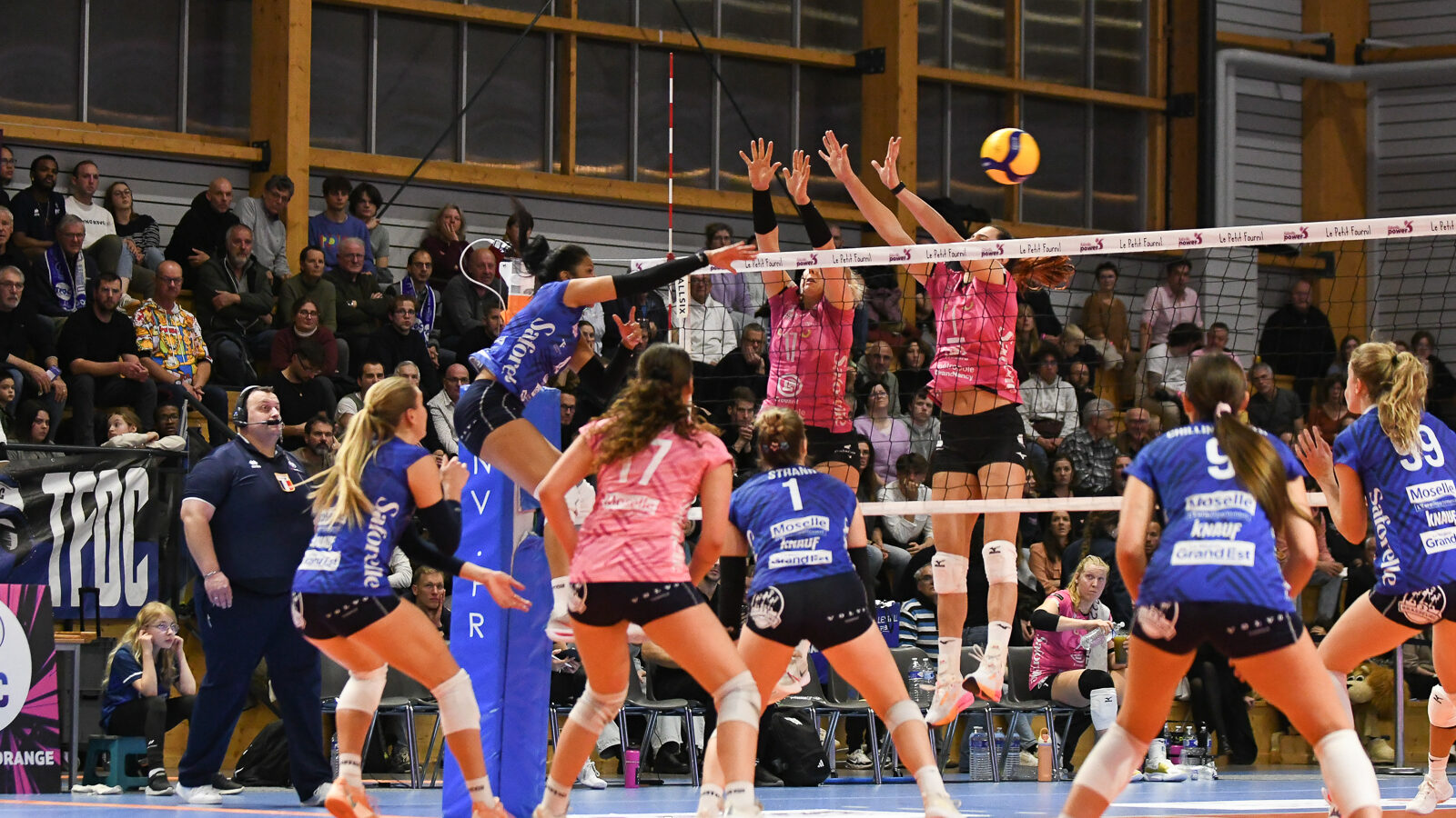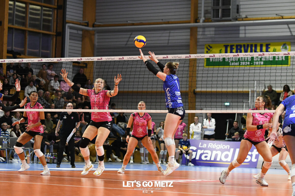 187 Le TFOC s’impose face à Vandœuvre au bout du suspense. Après un duel acharné, Terville Florange engrange un troisième succès de suite toutes compétitions confondues. C’est le deuxième exploit de la semaine. Après une qualification décrochée à Cannes, le TFOC signe un deuxième gros coup en prenant le meilleur sur Vandœuvre. Les joueuses de Romain Pitou ont bataillé pendant cinq sets pour s’offrir ce derby. Une victoire logique au regard de la supériorité des Mosellanes sur l’ensemble de la rencontre. Avec les deux points, Terville Florange confirme sa place dans le top 8. Une entame parfaite pour le TFOC L’ambiance chauffait à bloc. D’un côté, les supporters de Terville Florange, de l’autre ceux de Vandœuvre. Les deux bataillaient pour prendre l’avantage des tribunes. Sur le terrain, c’était le TFOC qui prenait rapidement les devants (10-5). Les coéquipières de Winderlys Medina récitaient leur volley à la perfection. Un service tranchant, un bloc impeccable et une attaque redoutable, tout fonctionnait. Le score gonflait (19-13). Même les deux centrales y participaient. Megan Wilson et Julia Haggerty montraient toute leur efficacité. Plombé par sa réception, le VNVB constatait les dégâts (25-20). Le deuxième set irrespirable Après avoir été dominé pendant un set, Vandœuvre se reprenait. Madelyn Robinson sonnait la révolte (7-10). D’abord par une attaque autoritaire, puis par un ace, l’Américaine mettait son équipe devant au tableau d’affichage. Les joueuses de Nicola Vettori semblaient définitivement lancées (13-18). Mais c’était sans compter sur des Mosellanes accrocheuses. Elles retrouvaient leur capacité à faire mal à leur adversaire. Grace Chillingworth signait un service gagnant salvateur pour revenir à égalité (23-23). Une fois dos à dos, les deux équipes se rendaient coup pour coup. Chaque point valait de l’or. Malgré deux balles de deuxième manche, Terville Florange cédait sur le fil (27-29). Jusqu’au bout de l’effort Le TFOC poursuivait pourtant sur son rythme. Dès le début de la troisième manche, Romain Pitou et ses joueuses dégageaient une nouvelle fois une force redoutable. Julia Haggerty pulvérisait par deux fois la réception adverse, la grande faiblesse du VNVB sur ce match. Avec ses deux points, la numéro 23 offrait un premier matelas à son équipe (8-3). Un écart qui grandissait sur les attaques de Megan Wilson, Camille Hendrickson ou encore Winderlys Medina. Les échecs répétés et la sortie de Pimpichaya Kokram en disaient long sur les difficultés des Meurthe-et-Mosellanes. La Thaïlandaise voyait, impuissante, sa formation lâcher pour la deuxième fois (25-18). Les Bleues maintenaient la pression sur Vandœuvre. Grâce à Hendrickson et Wilson, elles prenaient une option dans ce quatrième set (10-7). Mais le VNVB résistait jusqu’à revenir au score. Une fois à égalité, Aniah Philo lâchait le bras. L’Américaine était inarrêtable. Accompagnée par Kokram de retour sur le terrain, elle changeait tout (22-25). Une fois au tie-break, les problèmes revenaient inlassablement pour la formation de Nicola Vettori. Le TFOC en profitait (9-4). Il ne restait plus qu’à conclure, ce qui fut fait sur une énième faute de l’adversaire (15-9). TFOC 3 – 2 Vandœuvre Sets : 25-20, 27-29, 25-18, 22-25, 15-9. Composition TFOC : Strand, Haggerty, Medina, Chillingworth, Wilson, Hendrickson et Coulet (L). Entrée en jeu : Louessard. Composition Vandœuvre : Karakasi, Paradzik, Philo, Kokram, Wolowicz, Robinson et Agnese (L). Entrées en jeu : Ratahiry, Lehto, Bennour, De Zwart, Topete Pardo. Crédit photo : Mikaël Frank – Let’s Go Metz.