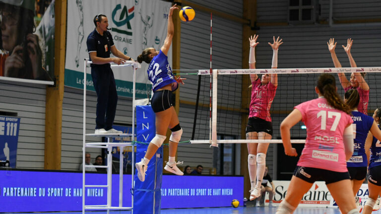 984 Le TFOC perd le derby contre Vandœuvre. Terville Florange a tout donné sans pour autant réussir à décrocher une dernière victoire. C’était une soirée si particulière. D’abord parce qu’elle concluait la saison des Bleues, ensuite parce qu’elle offrait un derby au public, et puis parce qu’elle voyait Daniel Mroczkowski dire adieu aux supporters. Comme annoncé en début de saison à notre micro, le président historique du club tire sa révérence après près de 30 ans à la tête de Terville Florange. Sur le terrain, la bataille a fait rage entre les deux formations à la hauteur du moment. Le TFOC s’incline au terme de la cinquième manche face à Vandœuvre après avoir tout donné. La surprise bleue Le TFOC bien dans le coup en ce début de partie. C’était l’une des craintes à l’entame de la dernière journée de championnat pour les Bleues : avaient-elles encore envie de tout donner alors qu’elles ne pouvaient espérer mieux qu’une 9e place. Les protégées de Romain Pitou répondaient par l’affirmative. Elles étaient prêtes à bousculer Vandœuvre (11-10). Malgré quelques points de retard, elles étaient portées par leur agressivité au service. La réception adverse se prenait les pieds dans le tapis. L’une des raisons de cette difficulté porte un nom : Aliyah Carter. L’Américaine faisait mal aux Nancéiennes. La numéro 22 jouait les trouble-fêtes avec son équipe (25-23). Un combat de tous les instants Après la perte du premier set, Vandœuvre se lançait dans un véritable combat. Objectif : prendre les trois points pour conserver sa quatrième place au classement. Mais les joueuses d’André Sa restaient bousculées par un adversaire parfaitement en place. Terville Florange maintenait son rythme (11-9). Les Mosellanes défendaient, bloquaient et agressaient sur chaque ballon. Tout leur réussissait, ou presque. Malgré leurs trois points d’avance, elles voyaient les Nancéiennes prendre le pas dans le sprint final. C’était l’un des points noirs de cette saison, l’incapacité de confirmer leur avantage au score (22-25). L’égalisation donnait des ailes à Vandœuvre (2-6). Les coéquipières de Lucie Dekeukelaire haussaient clairement le ton. Une série qui laissait présager une manche à sens unique. Il n’en était rien. Le TFOC restait en course et passait même devant au tableau d’affichage (10-9). Mais les Bleues fonctionnaient surtout en réaction. Elles laissaient leur adversaire s’échapper avant de revenir à hauteur. Les partenaires de Saana Lindgren commençaient à manquer de précision et cumuler les fautes. Avec légèrement moins de constance, elles se faisaient tout de suite punir (22-25). Dernières forces dans la bataille Terville Florange jetait ses dernières forces dans la rencontre (9-6). Une volonté de prolonger au maximum le spectacle. Vandœuvre ne l’entendait pas de cette oreille. Après les deux premiers sets, les Nancéiennes ne se laissaient pas avoir (9-12). Elles montraient tout ce qui a fait leur réussite cette saison. Pourtant, elles devaient encore se faire violence pour décrocher la victoire. Les Mosellanes les poussaient dans leurs retranchements. Elles se libéraient encore un peu plus, ce qui faisait toute la différence. Revenues à égalité, Romain Pitou et ses joueuses se lâchaient complètement (25-23). Un relâchement qui ne se ressentait plus dans le tie-break. C’était à présent la fatigue qui gagnait peu à peu le TFOC (2-8). Tout le contraire de Vandœuvre qui restait focus sur le résultat. Pourtant, les Bleues s’accrochaient comme elles le pouvaient. Par deux fois, elles se retrouvaient à seulement un point de leur adversaire. Malgré l’espoir d’un exploit et d’une victoire, il n’en était rien. Les Nancéiennes mettaient officiellement un terme à la saison de Terville Florange (11-15). TFOC 2 – 3 Vandœuvre Sets : 25-23, 22-25, 22-25, 25-23, Composition TFOC : Carter, Glaab, Wilson, Fricova, Lindgren, Bacon et Coulet (L). Entrées en jeu : Louessard, Chereau, Taofifenua. Composition Vandœuvre : Gamanovich, Bergmark, Vásquez, Moreno, Carabili, Runnels et Dekeukelaire (L). Entrées en jeu : Camino, Gustafsson, Foucher, Starostenko. Crédit photo : Mikaël Frank – Let’s Go Metz.