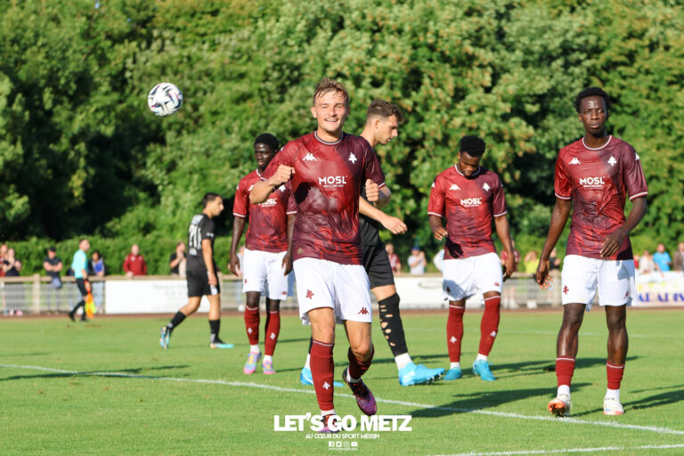 4,6K Le FC Metz a démarré sa préparation estivale pour la saison 2025-2026 par une victoire contre l’US Mondorf (1-0). Les Grenats l’ont emporté grâce à un but du jeune Cléo Mélières. Retour sur ce premier match de la pré-saison des Messins.Démarrage en douceur pour le FC Metz dans cette préparation d’avant-saison. Les Grenats se sont imposés sur la plus petite des marges, grâce à un but inscrit à la 72e minute de jeu par Cléo Mélières, jeune latéral de 20 ans récemment passé professionnel. En face, l’US Mondorf, club évoluant en BGL Ligue (l’élite du football luxembourgeois), constituait un adversaire idéal pour tester deux aspects : le développement d’un jeu offensif construit depuis la défense, mais aussi la solidité du bloc messin face à une équipe compacte, prête à jaillir en contre. Le tout s’est fait dans un contexte de remaniement d’effectif, entre joueurs hors de position, nouveaux arrivants ou éléments encore incertains pour une place de titulaire. 1⃣ – 0⃣ | #FCMUSM 🔚 C'est terminé. Nos Grenats débutent leur campagne estivale par un succès face à @US_Mondorf (1-0) ! pic.twitter.com/NPA9bvNQLC— FC Metz ☨ (@FCMetz) July 16, 2025 Une équipe par mi-temps Dès le coup d’envoi, Stéphane Le Mignan optait pour une revue d’effectif stratégique en alignant deux formations différentes par mi-temps. La première période voyait évoluer une majorité de joueurs titulaires, ayant terminé la saison passée dans les matchs de barrages et de play-offs. Certains absents notables étaient toutefois à relever, notamment Michel Mboula ou Cheikh Sabaly de retour tardif de vacances. Pape Sy était présent dans les buts. La défense était articulée autour de Koffi Kouao à droite, de la première recrue messine Yannis Lawson à gauche, et d’une charnière centrale Sadibou Sané – Joseph Nduquidi. Au milieu, on retrouvait un trio bien connu : Jessy Deminguet, Benjamin Stambouli et Gauthier Hein. En attaque, Morgan Bokele et le nouveau venu Giorgi Tsitaishvili occupaient les ailes, tandis que Brian Madjo, tout juste professionnel, était aligné en pointe. Équipe du FC Metz alignée lors de la 1ère mi-temps (demivolee.com) En seconde période, une équipe plus expérimentale a pris le relais, avec davantage de joueurs de rotation – à l’exception notable de Idrissa Gueye, potentiellement titulaire en attaque cette saison. La surprise venait du poste de gardien : Ousmane Ba, pourtant libre, était présent, mis à l’essai selon le club : « Il pourrait arriver dans un rôle de numéro 3, mais c’est une réflexion à avoir au niveau du club. », a indiqué Le Mignan. En défense, Cléo Mélières et Nathan Mbala occupaient les couloirs, alors que la paire Maxime Colin – Alpha Touré prenait place dans l’axe. Le milieu était très offensif sur le papier avec Ismaël Guerti, Ibou Sané et Joël Asoro. Devant, Malick Mbaye, Papa Amadou Diallo et Idrissa Gueye complétaient le trio. Équipe du FC Metz alignée lors de la 2ème mi-temps (demivolee.com) Rassuré sur les intentions, mais des fragilités toujours présentes Crédit photos : Stephan Weyrath / Let’s Go Metz Parmi les aspects positifs, il faut noter la volonté de Le Mignan de s’appuyer sur des latéraux très offensifs. Les quatre utilisés pendant le match ont apporté un vrai danger sur les côtés. L’objectif était de chercher à créer régulièrement le surnombre face à un bloc luxembourgeois bien regroupé. Un apport souligné par Le Mignan : « Les latéraux avaient beaucoup d’activité sur le jeu proposé cet après-midi […] la preuve, le but est arrivé sur un débordement de Nathan Mbala ». De manière générale, les jeunes éléments, comme Nduquidi, Guerti, Mélières ou Mbala, ont montré de l’envie et un vrai potentiel. Autre point satisfaisant : des automatismes intéressants se dessinent déjà, notamment à droite entre Tsitaishvili, Hein et Kouao. Ces trois joueurs pourraient bien démarrer la prochaine saison ensemble.Cependant, des fragilités subsistent. Le FC Metz a parfois souffert dans la construction au milieu face à une équipe bien regroupée : « On s’attendait à un match plus ouvert. Je ne m’attendais pas à ce que Mondorf joue à cinq derrière », a reconnu Jessy Deminguet. Les Grenats se sont heurtés à maintes reprises au mur luxembourgeois. Cela a entraîné des pertes de balle et des contres dangereux. Le duel physique a également été un défi, avec une exposition parfois risquée. Heureusement, la vigilance défensive, notamment d’un Joseph Nduquidi convaincant dans un poste inhabituel, a permis d’éviter des conséquences plus graves. Enfin, les attaquants de pointe, Madjo et Gueye, ont eu peu d’occasions franches, souvent cantonnés à un rôle de pivot. Une situation où ils ne peuvent pas facilement s’exprimer. Quelques performances individuelles à retenir Crédit photos : Stephan Weyrath / Let’s Go Metz La première apparition de Tsitaishvili avec les Grenats est plutôt prometteuse. Très actif à droite avec Hein et Kouao, il s’est offert plusieurs frappes dangereuses en repiquant dans l’axe. L’une d’entre elles a failli faire mouche, obligeant le gardien de l’équipe luxembourgeoise à s’employer. Le Mignan a en tout cas apprécié la performance du Géorgien et son implication collective : « On a vu de bonnes relations, je pense notamment avec Gauthier (Hein) sur leur zone droite. Donc c’est plutôt intéressant ». Sur le flanc gauche, Mbala a impressionné par son impact et sa qualité de projection. Il est d’ailleurs impliqué sur l’unique but du match. Rappelons que ce dernier n’a pas encore signé de contrat professionnel. Enfin, Mélières, buteur du jour, a convaincu au poste de latéral droit. Une bonne nouvelle pour Le Mignan, qui semble vouloir continuer à utiliser un latéral très offensif à ce poste, comme c’est le cas avec Kouao.Da