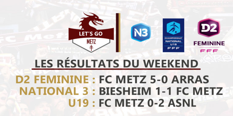 348 Au programme, Biesheim – FC Metz en National3, le derby FC Metz – Nancy en U19 et FC Metz – Arras en D2 féminine : EN NATIONAL 3 : Biesheim : 1-1 : FC Metz. But de Metz par Youssef Maziz sur pénalty. [event_performance id= »1283″ align= »none »] Le classement provisoire : [team_standings id= »380″ title= » » number= »5″ columns= »pts,p,w,d,l,f,a,gd » show_team_logo= »1″ show_full_table_link= »1″ align= »none »] Le prochain match : [countdown id= »1414″ show_venue= »0″ show_league= »0″ align= »none »] EN U19 : FC Metz : 0-2 : ASNL http://letsgometz.com/wp-content/uploads/2017/09/IMG_2405.mp4 Le pénalty non sifflé par l’arbitre ? Le classement provisoire : [team_standings id= »560″ title= » » number= »5″ columns= »pts,p,w,d,l,f,a,gd » show_team_logo= »1″ show_full_table_link= »1″ align= »none »] Le prochain match : [countdown id= »1415″ show_venue= »0″ show_league= »0″ align= »none »] EN D2 FEMININE : FC Metz : 5-0 : Arras [event_performance id= »594″ align= »none »] Le classement provisoire : [team_standings id= »431″ title= » » number= »5″ columns= »pts,p,w,d,l,f,a,gd » show_team_logo= »1″ show_full_table_link= »1″ align= »none »] Le prochain match : [countdown id= »595″ show_venue= »0″ show_league= »0″ align= »none »]