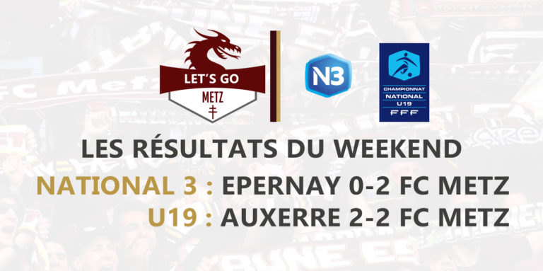 304 1ère journée en national 3 et chez les U19, voici les résultats et les classements : En national 3 : Victoire des messins à Epernay avec un but de Ibrahima Niane et d’un CSC. [event_performance id= »439″ align= »none »] Le classement provisoire : [team_standings id= »380″ title= » » number= »5″ columns= »pts,p,w,d,l,f,a,gd » show_team_logo= »1″ show_full_table_link= »1″ align= »none »] Le prochain match : [countdown id= »564″ show_venue= »0″ show_league= »0″ align= »none »] Chez les U-19 : Match nul des grenats à Auxerre 2-2. Buts de Rémy Cabral et Seroj Titizian Le Classement provisoire : [team_standings id= »560″ title= » » number= »5″ columns= »pts,p,w,d,l,f,a,gd » show_team_logo= »1″ show_full_table_link= »1″ align= »none »] Le prochain match : [countdown id= »585″ show_venue= »0″ show_league= »0″ align= »none »]