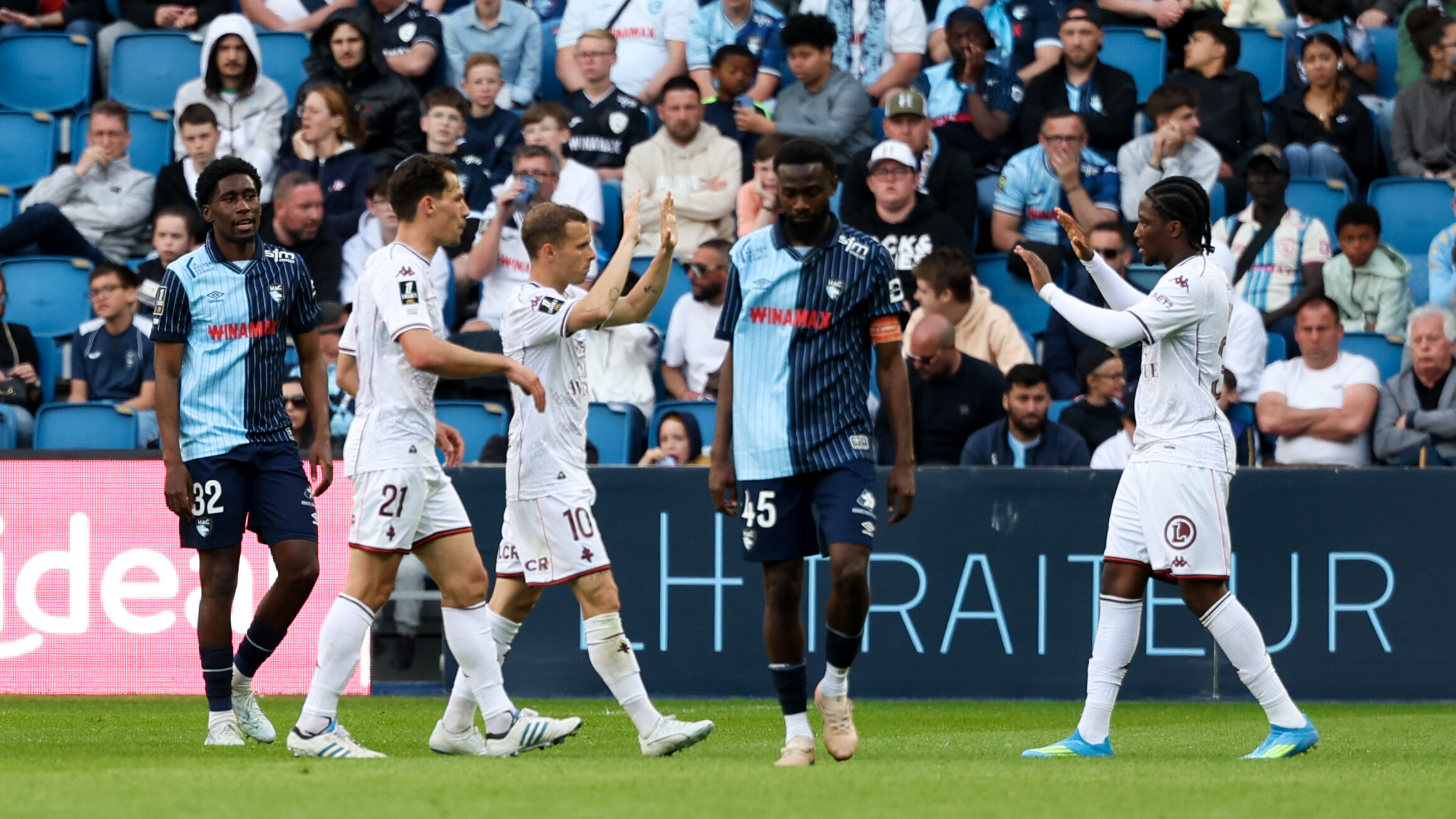 112 Au terme d’un match plaisant où il est revenu quatre fois au score, le FC Metz a ramené un point du Havre. Un résultat loin d’être suffisant pour croire à un barrage, mais qui lui permet de reporter sa relégation. Terminer la saison honorablement. Ce crédo n’a eu cesse d’être répété depuis un mois au sein du club à la Croix de Lorraine, que ce soit par l’état-major, le staff ou les joueurs eux-mêmes. Et contrairement à leur dernière sortie face au Paris FC, les Grenats ont montré ce caractère sur la pelouse du Havre. Parce qu’ils ont livré un match courageux malgré des lacunes défensives, et qu’ils sont surtout revenus au score quatre fois ! Ce qui n’était pas arrivé depuis 1960, selon le statisticien « Opta ». Les choses avaient pourtant mal commencé pour le FC Metz, organisé dans un système hybride censé permettre une meilleure couverture défensive. Raté : dès la cinquième minute de jeu, Samatta délivrait le Stade Océane, en partie grâce à une passe… d’Alpha Touré. Quelques minutes plus tard, Giorgi Kvilitaia, bien servi par un centre de Gauthier Hein, permettait aux Grenats de recoller sur leur première véritable occasion (9e), avant que Kechta ne remette les Havrais devant d’une superbe frappe (13e). Pandore et Mbala, une jeunesse talentueuse « Sur les situations défensives, on est trop fébriles, regrettait Benoît Tavenot à l’issue du match. Ç’a été comme ça toute la saison. On fait rarement les mêmes erreurs, mais on en fait toujours une. Individuellement, il y a trop de défaillances. » Malgré le statu quo à la mi-temps grâce au penalty inscrit par Gauthier Hein (45e+5), ce sont ces mêmes défaillances qui ont permis aux Havrais d’inscrire quatre buts, dimanche, et qui ont contraint le FC Metz à faire la course au score alors que sa bonne fin de match lui aurait sans doute permis d’espérer davantage. En témoigne le premier but en Ligue 1 de Jahyann Pandore – pour sa deuxième apparition avec les pros -, magnifiquement bien servi par Nathan Mbala (54e). Ou le deuxième de Gauthier Hein (85e), sur un centre à nouveau initié par Mbala, qui est venu conclure le chassé-croisé au score. « Le positif, c’est la force de caractère de ces joueurs qui sont dans la difficulté depuis longtemps. On a vraiment fait de bonnes choses avec le ballon », notait toutefois Tavenot « Il reste trois matchs, on va tous puiser dans les réserves pour essayer de finir au mieux »Jessy Deminguet Jahyann Pandore a inscrit son premier but avec les pros. Car malgré ces belles séquences aperçues – qui poussent encore à se demander pourquoi les Grenats n’ont pas montré ce visage plus souvent -, le FC Metz (18e, 16 points) reste bien trop loin d’Auxerre (16e, 25 points) pour espérer ne serait-ce qu’un barrage. « On n’a pas eu la réussite pour gagner un match qui aurait donné un peu d’énergie et d’espoir, a regretté l’entraîneur messin. On n’y arrive pas. Dès mes premières discussions au club, il y avait cette croyance par rapport à la descente qui était terrible. Mais on va faire face, et répondre présent jusqu’à la dernière minute du match à Nice. » Il reste désormais trois rencontres aux Grenats pour tenter d’arracher ce succès pour l’honneur. En attendant, la relégation pourrait être officielle dès samedi prochain face à l’AS Monaco (19 heures). « Notre leitmotiv, c’est de ne pas lâcher et de reprendre du plaisir sur le terrain. On l’a montré aujourd’hui (dimanche), relevait Jessy Deminguet. Il reste trois matchs, on va tous puiser dans les réserves pour essayer de finir au mieux. » au Stade Océane (Le Havre), Mehdi Abirez et Valentin Lachaux Les réactions de Jean-Philippe Gbamin et de Jessy Deminguet Havre AC – FC Metz : 4 – 4Havre AC : Diaw – Nego, Seko, Lloris, Zouaoui (Pembélé, 78e) – Ebonog (Mosengo, 90e), Ndiaye (Gourna-Douath, 46e) – Doucouré (Kyeremeh, 69e), Kechta (Boufal, 79e), Soumaré (cap.) – Samatta.FC Metz : Sy – Sarr (cap.), Sané, Yegbe, Mboula (Pandore, 46e), Tsitashvili – Touré (Stambouli, 46e), Gbamin (Mbala, 18e), Deminguet (Abuashvili, 82e) – Hein – Kvilitaia (Michal, 83e).Buts pour le Havre : Samatta (5e), Kechta (13e), Zouaoui (s.p., 52e), Doucouré (61e).Buts pour Metz : Kvilitaia (9e), Hein (s.p., 45e+5), Pandore (54e), Hein (85e).Avertissements au Havre : Gourna-Douath (80e), Pembélé (90e), Ebonog (90e).Avertissement à Metz : Kvilitaia (47e).Arbitre : M. Letexier. Crédit photo : Johnny Fidelin / Icon Sport