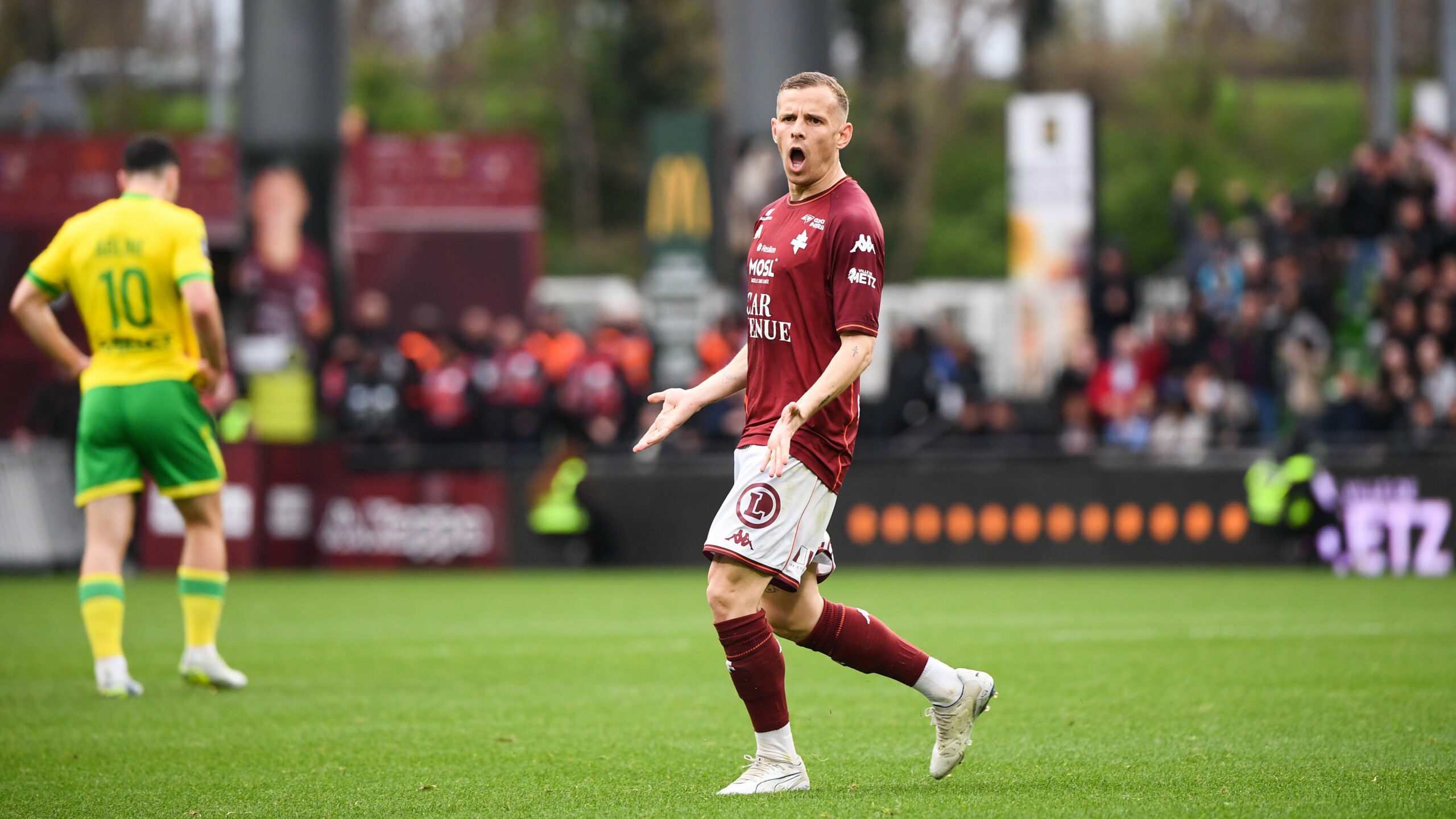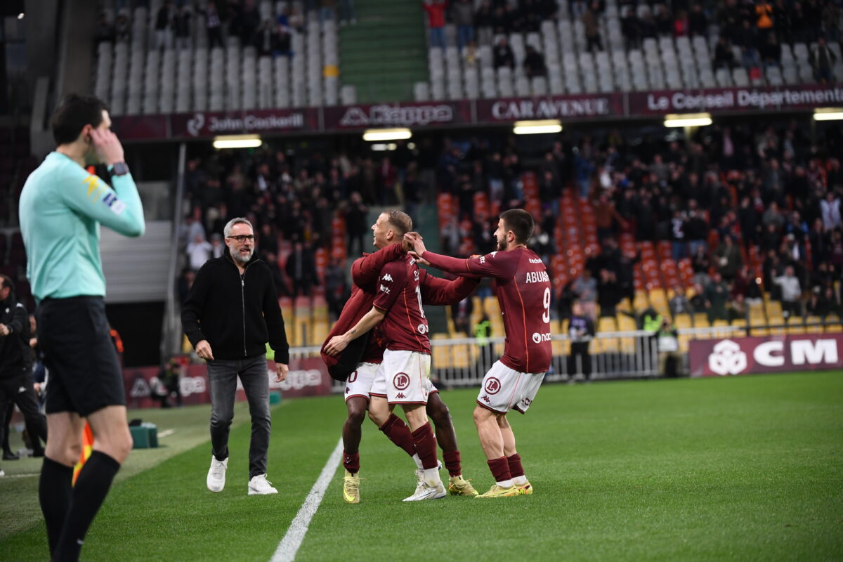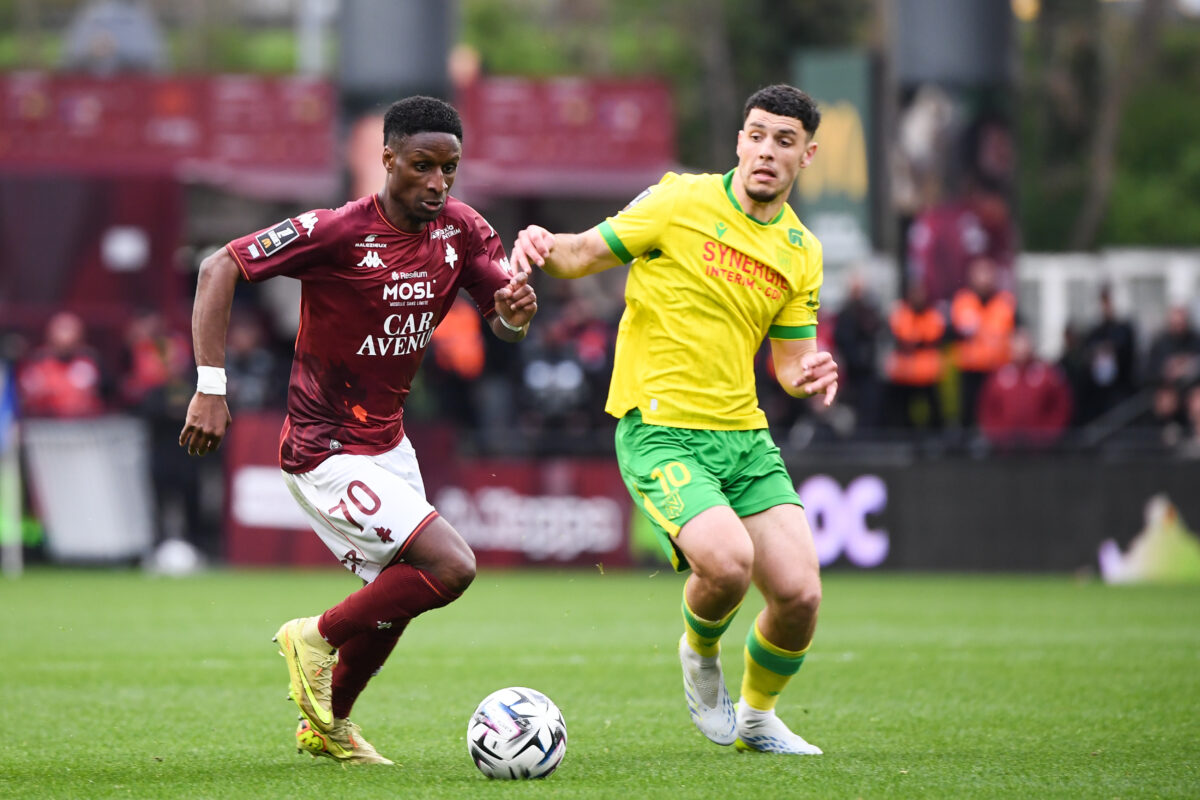 91 Tenu en échec sur sa pelouse par le FC Nantes (0-0) malgré toute une mi-temps en supériorité numérique, le FC Metz a été mal payé ce dimanche à Saint-Symphorien. Et il a désormais un orteil de plus en Ligue 2. C’est un match nul qui n’arrange personne. L’expression est toute faite, mais demeure un reflet parfait de la situation comptable des Messins et des Nantais. Au soir de la 28e journée de Ligue 1, les Grenats n’ont que quinze points et restent à trois unités de Nantes, 17e, mais surtout à huit de l’AJ Auxerre, qui a une nouvelle fois pris un point au Havre. Tavenot: « Il n’y a rien qui tourne en notre faveur » Il y a deux semaines, après le point obtenu sur la pelouse du Roazhon Park de Rennes (0-0), le président du club à la Croix de Lorraine, Bernard Serin, avait déploré que la saison soit « pénible », les choses ayant « mal tourné ». Le scénario de la rencontre face à Nantes lui donne raison, car les Grenats ont essayé, mais n’ont pas eu les faveurs du scénario. À l’image de ce but à l’allure d’une délivrance de Gauthier Hein (90e+4), finalement refusé pour un hors-jeu d’un… talon. Ainsi sont les lois du jeu. « Pour l’instant, il n’y a rien qui tourne en notre faveur, mais peut-être qu’on n’en fait pas assez aussi. On doit essayer de mettre le feu dans le stade, a noté Koffi Kouao au micro de Ligue 1+. Ça se joue à presque rien, il faut continuer et ne pas lâcher. » Une joie de courte durée pour Gauthier Hein, qui avait pensé délivrer Saint-Symphorien. Metz aurait dû être mieux payé… Durant cette saison aux airs de calvaire, le FC Metz n’a pas tout bien fait, comme l’a reconnu une fois de plus Benoît Tavenot à l’issue de la rencontre, au micro de Ligue 1+. Mais dimanche, il a sans doute un peu mieux fait, et il aurait mérité d’être mieux payé. Parce qu’il a montré un visage combatif dès l’entame, au contraire des Nantais, en cherchant à se procurer de nombreuses occasions, et à tenir le ballon (1ère, 2e, 12e). Derrière, le FC Metz a fait le dos rond durant les incursions des Canaris dans la surface, mais n’a pas rompu. Dimanche, Tavenot avait d’ailleurs reconduit Pape Sy dans les cages et n’avait changé que Yegbe pour Mboula en défense centrale. Alors quand Tati a été expulsé pour une vilaine faute sur Koffi Kouao, les Grenats se sont sûrement dits que les choses allaient, peut-être, enfin tourner un peu de leur côté. Ils ont ainsi poussé jusqu’à la mi-temps (42e, 44e), sans succès. Même chose en seconde période, où Metz a tenté, bien aidé par un Bouna Sarr percutant sur son côté droit où il a beaucoup tenté avec Koffi Kouao. Bouna Sarr (ici au duel avec Matthis Abline) a beaucoup tenté sur son côté droit. … mais a pêché dans le dernier geste Mais si les Grenats ont une nouvelle fois réglé le problème de la défense en n’encaissant pas de but pour le deuxième match consécutif, ils ont été trop imprécis devant. Dans un système différent d’il y a deux semaines (4-2-3-1), Gauthier Hein, de retour dans le XI, a beaucoup bougé en relais de Deminguet et Gbamin, mais les attaquants, Diallo en tête, ont pêché dans le dernier geste. Le Sénégalais n’a, certes, pas eu beaucoup de bons ballons à exploiter, mais ils n’a pas créé beaucoup de danger. Le FC Metz, en manque de confiance comme toute équipe jouant le maintien, s’est créé beaucoup de situations (19 tirs, 5 cadrés), mais ne les a jamais vraiment exploitées jusqu’au bout. La faute à du déchet technique et a de la maladresse. Et quand il a réussi à conclure, le VAR est intervenu pour annuler le but (67e, 90e+4). « Je suis très déçu encore une fois pour les joueurs, a concédé Tavenot. On a corrigé le match de Brest en faisant attention à ne pas se faire punir. Les types, ils s’accrochent, on essaie. À la mi-temps, on doit être devant, et on n’y arrive pas. » L'ascenseur émotionnel horrible pour les Messins 😨Leur but de l'espoir à la 95e minute est finalement refusé pour un hors jeu de quelques millimètres… #FCMFCN pic.twitter.com/voWXAmfx73— L1+ (@ligue1plus) April 5, 2026 « Il faudra encore une fois digérer », a avoué Tavenot. Car c’est un gros morceau qui attend les Grenats, qui ouvriront le bal dès vendredi (20h45) sur la pelouse du Stade Vélodrome de Marseille. Mathématiquement, ce n’est pas encore fait. L’espoir est loin après ce match qu’il fallait à tout prix gagner. Mais ce FC Metz a prouvé, au moins, qu’il tentera jusqu’au bout de terminer cette saison convenablement, même si cela arrive un peu tard. Crédit photo : Philippe Lecoeur/FEP/Icon Sport FC Metz 0 – 0 FC NantesFC Metz : Sy – Kouao, Sané, Mboula (Munongo, 63e), Colin (Mbala, 63e) – Gbamin, Deminguet (Abuashvili, 87e) – Sarr (Michal, 80e), Hein, Tsitaishvili – Diallo (cap.)FC Nantes : Lopes (cap.) – Guilbert, Awaziem, Tati, Cozza – Kaba (Amian, 90e), Coquelin (Sissoko, 84e), Lepenant – Centonze (Yousuf, 46e), Ganago (Machado, 46e), Abline (Guirassy, 73e).Avertissement à Metz : Sarr (38e) et Munongo (72e).Avertissement à Nantes : Coquelin (63e).Exclusion pour Nantes : Tati (39e).Arbitre : M. Brisard.