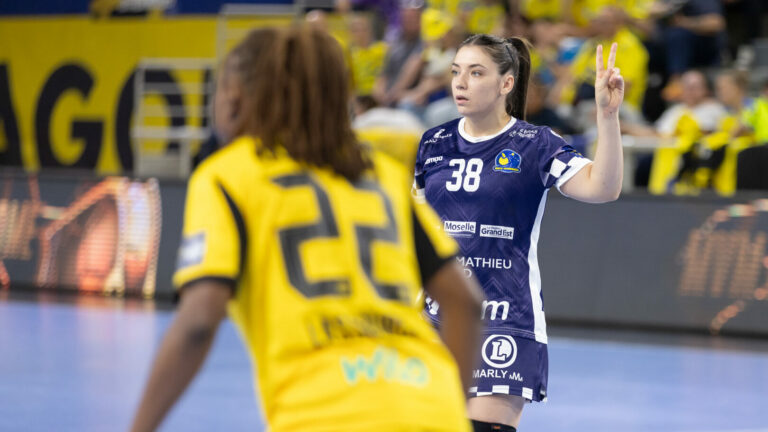1,9K Quatre jours après sa démonstration à Saint-Amand, Metz Handball a dû s’employer pour venir à bout du Gloria Bistrita (24-31). Les Messines demeurent invaincues et restent en tête du classement avec Györ. Ce dimanche, Metz Handball se rendait dans la salle du Gloria Bistrita pour un match clé contre une équipe encore invaincue. En Roumanie, les Messines avaient à cœur de confirmer leur bonne forme de ce début de saison face à un collectif accrocheur à influence espagnole. Si certains déplacements en Roumanie sont réputés pour l’hostilité du public, l’équipe d’Emmanuel Mayonnade a su déjouer le piège de Bistrita. Dès les premiers instants, les Dragonnes imposaient leur rythme pour mener rapidement de cinq buts étouffant totalement une équipe roumaine dépassée par l’intensité adverse. Dans cette entame de match, la défense messine, guidée par le duo Xenia Smits-Sarah Bouktit dans l’axe central, se montrait robuste. L’intensité défensive contraignait les Roumaines à forcer leurs tirs facilitant le travail de Johanna Bundsen sur sa ligne. La gardienne suédoise lançait parfaitement son match avec plusieurs parades. Il a fallu un jet de 7m transformé par Asuka Fujita à la sixième minute pour que Bistrița débloque enfin son compteur. Mais cela ne suffisait pas pour autant à renverser la dynamique. Metz contrôlait totalement les débats (2-6, 10′). Paula Arcos réveille le Gloria Bistrita Mais dès le 7e minute, des erreurs défensives venaient pénaliser les Dragonnes en provoquant deux exclusions temporaires coup sur coup. De légers errements s’installaient ensuite. Des pertes de balle, des échecs sur montées de balle rapides inhabituels en ce début de saison et deux jets de 7m ratés permettaient à Bistrița de rester au contact. Pourtant Metz ne cédait pas et l’équilibre collectif restait intact. Côté roumain, Paula Arcos poussait les Messines dans leurs retranchements tant l’arrière droit espagnole anticipait les premières intentions messines et multipliait les interceptions en étant incisive en défense. La fin de première période devenait ensuite plus décousue de part et d’autre du terrain. Les mauvais choix offensifs s’enchainaient. La défense des Françaises résistait mais le score restait figé pendant six longues minutes. Aucune des deux équipes ne trouvait de solutions jusqu’à ce Larissa Nüsser, suivie de Léna Grandveau, ne vienne débloquer cette période muette. Après cette période de fluctuations, Metz Handball maintenait le Gloria Bistrita à distance avec trois buts d’écart avant de rejoindre le vestiaire. (11-14, 30′). Une seconde période sous tension La seconde mi-temps démarrait sur les mêmes bases défensives que la première. Metz récupérait les ballons et se projettait rapidement vers l’avant. Petra Vámos inscrivait le premier but de la reprise sur une montée de balle rondement menée avec Tyra Axnér et Léna Grandveau. Mais en face, Paula Arcos, déjà précieuse en défense, continuait de réguler l’attaque roumaine. Très active dans les duels, elle maintenait son équipe à flot et ce même si Metz restait en tête grâce à Lylou Borg précieuse sur jet de 7 mètres pour redonner quatre buts d’avance à son équipe. Mais les Dragonnes connaissaient un nouveau passage à vide. La faute à une série de tirs approximatifs notamment sur contre-attaque. Bistrița en profitait et revenait à une petite longueur, mettant la pression sur les Messines. L’attaque de Bistrita obtenait même la possibilité d’égaliser mais Sabrina Novotná réalisait une parade décisive sur jet de 7m. Derrière, Petra Vámos se jouait de Renata de Arruda pour remettre Metz à +2, redonnant ainsi de l’air aux championnes de France (17-19, 40′). Metz Handball fait le break dans la money-time Le manque d’efficacité à quinze minutes de la fin offrait cependant une lueur d’espoir à Bistrita. Une fois n’est pas coutume, Renata de Arruda était en verve et repoussait toutes les tentatives. Les Messines échouaient même sur contre-attaque, le doute semblait s’installer face à des Roumaines parties pour renverser la rencontre. Mais dans les dix dernières minutes, Sarah Bouktit prenait les choses en main avec le duo Vámos/Grandveau permettant à Metz Handball de stabiliser son avance face au Gloria Bistrita. Les Françaises reprenaient le contrôle de leur jeu. Bistrița, de son côté, devenait de plus en plus prévisible. Les Messines lisaient les intentions roumaines, récupéraient de nouveau les ballons et géraient parfaitement les cinq dernières minutes. Dans une fin de match à sens unique, les Dragonnes déroulaient pour s’imposer finalement 31 à 24 après avoir été contrariées pendant la majeure partie de la rencontre. Statistiques Gloria BistritaRenata de Arruda (16 parades sur 47 tirs), Ana Maria Perseca. Yaroslava Burlachenko, Monika Kobylinska (1 buts en 7 tentatives), Larissa Nüsser (2/3), Danila So Delgado Pinta (2/6), Cristina Laslo (0/3), Bianca Bazaliu (1/1), Jennifer Gutiérrez (2/4), Kaba Gassama (1/1), Paula Arcos (4/4), Stefania Stoica (1/3), Asuka Fujita (6/12), Sonia Seraficeanu, Lorena Ostase (4/6). Metz HandballJohanna Bundsen (13 parades sur 36 tirs et 1 but/ 1 tentative), Sabrina Novotná (1/2). Laura Godard, Blandine Gros, Tyra Axnér (2/6), Suzanne Wajoka (4/5), Anna Albek, Anne-Emmanuelle Augustine, Xenia Smits (0/1), Betchaidelle Ngombele, Sarah Bouktit (7/8), Lucie Granier (3/6), Léna Grandveau (6/12), Petra Vámos (6/8), Lylou Borg (2/4). Crédit photo : Matthieu Henkinet/Let’s Go Metz