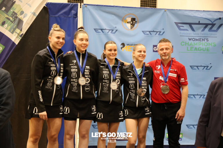 1,1K Cinq jours après avoir été sacrées championnes de France Pro A Dames 2025, les joueuses du Metz TT ont échoué à une marche du graal européen, malgré leur victoire en finale de Ligue des Champions retour (3-2), face à Berlin. La saison de Metz TT s’achève sur une médaille d’argent obtenue à la maison en finale de Ligue des Champions. Loin de posséder les plus grandes ressources du tennis de table européen, le club a encore réussi une belle saison, avec une nouvelle finale de Ligue des Champions et un sixième sacre de champion de France. Après la défaite 3-1 à l’aller, les Messins ont remporté la finale retour 3-2. Le trophée revient donc à Berlin, vainqueur au meilleur des deux matchs. Mariia Tailakova expédie Surjan (1-0) Mariia Tailakova. Crédit Photo : Nicolas Martino / Let’s Go Metz Dès l’entame, Mariia Tailakova poussait son adversaire serbe à la faute, pourtant en forme une semaine plus tôt (8-4). Les échanges fusaient et ne s’éternisaient pas. Après quatre minutes de jeu, Tailakova servait pour le gain du premier set, un coup droit suffisait pour prendre les commandes. Très active la Russe poursuivait sur le même rythme, Surjan passait à côté de cette première affiche (5-0). La cadence ne ralentissait par pour la joueuse russe de 24 ans (8-3). De nombreux espaces se libéraient, la Mosellane accélérait. La joueuse de Berlin revenait tout de même au contact. Au terme d’un échange musclé, Tailakova remportait le gain du set (11-9). Galvanisée, la locale réussissait le match parfait (3-0, dans le 3e set). Au mental, la Berlinoise prenait les commandes sans inquiéter son homologue (5-7 puis 7-7). Avec beaucoup de chance en sa faveur sur l’épilogue, l’ancienne 52e mondiale offrait le premier point de cette finale au Metz TT. Shan prend sa revanche et donne l’égalisation à Berlin (1-1) Dans un tout autre style, Adina Diaconu affrontait Xiaona Shan et son jeu atypique. D’entrée, la pongiste de Berlin laissait trop d’espaces à son adversaire (4-1). Ensuite plus agressive, la 62e mondiale obligeait Diaconu à tenir l’échange. Grâce à un service qui portait ses fruits, Shan filait vers le gain de la première manche (4-9). Poussée par plus d’un millier de personnes, Diaconu se relevait, mais c’était insuffisant. La joueuse du Berlin TT décrochait un coup droit saillant pour mener 2 set à rien (7-11). Plus solide lors d’échanges longs, Xiaona Shan restait en tête (11/7, 3/0). Après un nouveau temps mort, la Roumaine retrouvait des couleurs (4-4) mais cela ne suffisait pas, la pongiste de 42 ans tenait sa revanche après avoir été défaite à l’aller (3 sets à 2). Berlin n’était plus qu’à un succès d’un nouveau trophée européen avec la victoire conquérante de Shan (3 sets 0). Griesel offre le titre aux siennes (1-2) Dos au mur, Metz TT lançait Charlotte Lutz pour la troisième confrontation du soir. 120 places à l’échelon mondial séparaient la Française de l’Allemande, la différence se faisait ressentir dès les premières secondes. La Championne de France en double mixte 2025 prenait son envol (6-1). Après quelques points sous tension, la pongiste de 20 ans retrouvait son agressivité pour expédier l’échange (9-5). Griesel finissait par céder après s’être accrochée (11-8). La joueuse originaire d’Alsace ne relâchait pas ses coups (6-3). Plus adroite, Mia Griesel effectuait une remontée (6-7). Avec davantage de sang froid, l’Allemande égalisait à une manche partout. Charlotte Lutz. Crédit Photo : Nicolas Martino / Let’s Go Metz Les débats continuaient à être disputés (5-3). Le gain de cette rencontre allait se décider au mental. La locale serrait la vis en défense (9-4) et s’adjugeait la deuxième manche (11-5). Toujours aux coudes à coudes, les deux adversaires ne parvenaient pas à se départager dans un quatrième set disputé. À ce jeu-là, l’Allemande sortait les muscles et forçait les deux équipes à se départager au terme d’un ultime set en 6 points gagnants. Sous pression, Charlotte Lutz prenait les deux premiers points du 5e set. La suite ressemblait un bras de fer. La Berlinoise pouvait finalement exulter au terme d’une bataille spectaculaire. Après 1H48 de match, Berlin avait scellé sa sixième Ligue des Champions de son histoire. Sarah de Nutte offre une victoire symbolique au Metz TT (3-2) Sans pression, après le forfait logique – décision des entraîneurs pour écourter la rencontre, car Berlin était déjà assuré de remporter la Ligue des Champions – de Xiaona Shan face à Mariia Tailakova dans le match 4, Metz et Berlin allaient se départager pour la victoire symbolique du jour dans un dernier match. Ce fut l’occasion de voir les numéros 4, la Luxembourgeoise Sarah De Nutte (32 ans) face à Josephina Neumann (15 ans). C’est l’Allemande, davantage agressive, qui prenait des commandes (9-11). Le deuxième set, une nouvelle fois accroché (12-10) tournait à l’avantage de la Luxembourgeoise. Partie pour mener ensuite 2 manches à 1, la protégée de Loïc Belguise avait du mal (7/3 puis 9/11) face à la plus jeune joueuse de la compétition. Cette dernière finissait par s’incliner sur le gong (6-5), dans un ultime set. La déception était palpable au Metz Tennis de Table, passé si proche du graal européen. Ceci n’a pas empêché Loïc Belguise d’annoncer l’unique et seule recrue pour la saison prochaine à la fin de cette finale de Ligue des Champions : la pépite égyptienne, Hana Goda (25e joueuse mondiale). De quoi réussir à soulever le trophée dans le futur ? Metz TT 3-2 Berlin Tailakova – Surjan (11/6, 11/9, 11/9) Diaconu – Shan (7/11, 5/11, 5/11) Lutz – Griesel (11/8, 9/11, 11/5, 9/11, 4/6) Tailakova – Shan (victoire par forfait 3-0) De Nutte – Neumann (9/11, 12/10, 9/11, 11/6, 6/5) Crédit Photos : Nicolas Martino / Let’s Go Metz