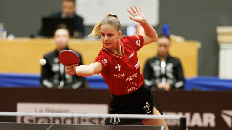 791 Si près, si loin… Le Metz TT s’est incliné (0-3) ce vendredi face à Berlin, et devra assurer sa qualification en quart de finale de Ligue des Champions à Hodonín. Le Metz TT boucle enfin sa semaine infernale. En l’espace de six jours, les joueuses de Loïc Belguise ont joué quatre rencontres. Les Messines ont d’abord chuté dimanche à la maison contre Poitiers (2-3), avant de battre le leader Nîmes-Montpellier mardi (3-2) et de gagner le lendemain à Schiltigheim (1-3). « On prend 10 points sur 12 possibles, on va s’en satisfaire même s’il y a encore pas mal de choses à améliorer », souffle Loïc Belguise. C’est Berlin, l’épouvantail de la poule en Ligue des Champions, qui se présentait vendredi au Complexe Saint-Symphorien. Sans Adina Diaconu, laissée au repos, « elle a une fragilité en ce moment avec son dos, c’est important de faire tourner et jouer la dynamique d’équipe », le Metz TT n’a pas su créer la sensation. Si Mariia Tailakova était logiquement battue en trois sets par Xianoa Shan, ses deux coéquipières auront poussé l’adversité berlinoise jusque dans ses derniers retranchements. Lutz et De Nutte battues au dernier point Charlotte Lutz et Sarah De Nutte, respectivement face à Nina Mittelham et Sabina Surjam, ont livré une énorme prestation avant de s’incliner… au dernier point de la cinquième manche, toutes les deux. « Charlotte fait un super match. Elle a eu une première balle de match et Mittelham fait un point extraordinaire. Sur le dernier point, il lui a peut-être manqué un peu d’opportunisme. Sarah s’est vraiment bien battue, elle a trouvé des solutions, ce n’est vraiment pas passé loin… On a fait une prestation honorable mais on a perdu 3-0 face à une équipe bien plus forte que nous, sans leur numéro une », estime Loïc Belguise.Le Metz TT devra maintenant gagner à Hodonín (13 décembre) pour s’assurer une place en quart de finale de Ligue des Champions, sans compter sur les résultats de ses adversaires. Metz TT 0-3 Berlin Tailakova – Shan : 8/11, 5/11, 1/11Lutz – Mittelham : 11/8, 2/11, 11/6, 8/11, 5/6De Nutte – Surjan : 10/12, 6/11, 11/9, 11/9, 5/6 Crédit photo : Nicolas Martino / Let’s Go Metz