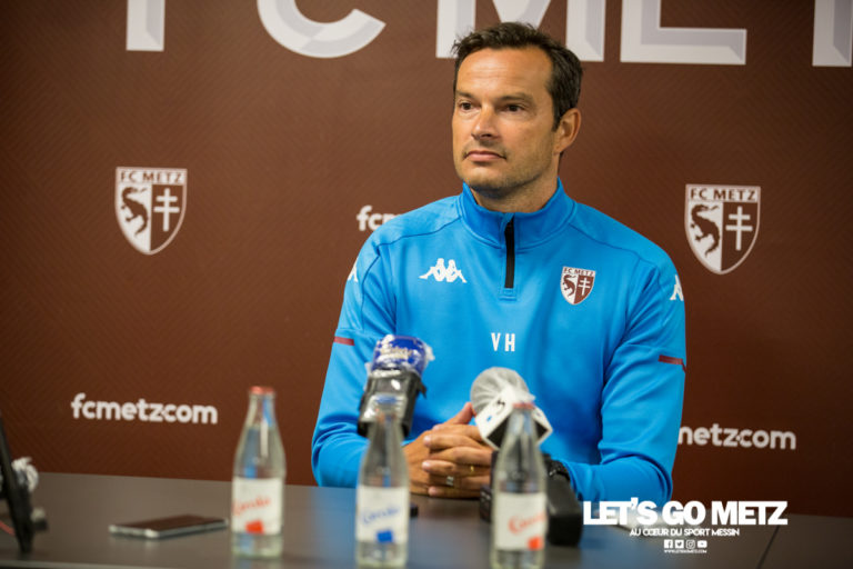 386 La tactique de Vincent Hognon à Lille a fait couler beaucoup d’encre… (Photo : Matthieu Henkinet) Qui dit nouvelle saison dit nouveau format sur Let’s Go Metz. Notre objectif, décrypter et aussi vulgariser l’analyse tactique du dernier match, face aux lillois. Pour une première, il est vrai que cette analyse ne fut pas une partie de plaisir, une composition assez défensive pour nos grenats et des lillois en manque de créativité, ce combo donne un match avec assez peu de saveur. Malgré cela, nous avons pu relever du bon lors de ce match, nous allons donc vous proposer ce que la partition messine a effectué de mieux et bien évidemment les failles du système proposé par Vincent Hognon. Le schéma proposé par le coach messin Tout d’abord, parlons de la composition : pas moins de 9 joueurs à vocation défensive pour contrecarrer les ambitions lilloises. Le technicien lorrain nous gratifie d’un schéma qui « évolue » entre phases défensives et offensives. Lorsque les grenats défendent, le système s’apparente à ce que nous pouvons appeler un 5-4-1. Bien évidemment, avec une défense centrale à 3 composée de Bronn, Fofana et Boye. Udol et Centonze sont respectivement piston gauche et droit. Nguette se positionne avec les milieux et s’occupe de défendre sur le couloir gauche, pour le couloir droit Maiga et Pajot se le partagent et Angban complètent le milieu, ce dernier restera la plupart du temps dans l’axe. Ibrahima Niane lui est positionné comme premier défenseur. Lors des phases offensives, le système évolue en 5-3-2, Opa rejoint Niane dans l’axe et Maiga (ou Pajot) revient dans l’axe pour laisser plus de place à nos pistons sur les côtés, pour qu’ils puissent se projeter plus facilement. Les espaces laissés à nos pistons lors des transitions. Une première mi-temps suffisante Il est clair que ce match n’était pas sexy, mais le plan des grenats fonctionne. Défensivement, avec un marquage individuel assez serré sur certains joueurs lillois comme Ikoné et Bamba. L’objectif étant qu’ils ne puissent pas se retourner facilement, qu’ils ne puissent pas se tourner face au jeu. Le marquage individuel de Fofana sur Ikoné Cette mission lors des 45 premières minutes fut une réussite. Bien sûr, il y a eu quelques moments où les deux maîtres du jeu lillois ont eu de l’espace. Par la qualité de leurs individualités, les nordistes ont pu se démarquer mais en général, le collectif messin a été fort et a su restreindre les offensives des Dogues. Même si ce schéma devait offrir un certain confort défensif, les grenats ont su se montrer dangereux devant le but de Mike Maignan. Le danger venait souvent des pistons, Udol dans un premier temps va même, lors d’une de ses premières montées, toucher la barre transversale à la suite d’un centre dévié. Quelques minutes plus tard, Centonze adresse une merveille de centre pour Niane qui rate le cadre. Ces occasions ne doivent pas cacher le manque de soutien lors des transitions, Niane se retrouvant assez souvent seul face aux défenseurs lillois. Les transitions sont ratées même si il y a des espaces sur les côtés. Ibrahima Niane seul face aux Lillois Pour résumer, le schéma gêne les lillois offensivement et les messins bousculent de temps à autres les Dogues malgré une certaine timidité lors des transitions offensives là où Metz devrait être clinique. Une seconde mi-temps dans l’ombre du LOSC Pour ce qui est de la seconde mi-temps les intentions sont les mêmes, mais très rapidement les lillois, plus précis et plus en jambes, vont faire reculer le bloc messin petit à petit, les efforts sont plus compliqués pour remonter le ballon puis pour défendre par la suite. Les changements qui viennent trop tard ne vont pas aider nos messins non plus. L’heure de jeu se passe et les grenats qui subissaient déjà vont commencer à sombrer, les efforts de Dylan Bronn pour faire remonter nos lignes seront vains, les lillois reviennent assez rapidement à l’offensive et les quelques incursions messines dans l’autre camp seront finalement assez rares et timides. Les grenats enchaînent les erreurs de placement, Jérémy Pied arrive lors de la 64′ à être lâché seul dans notre surface, sans aucune réaction des défenseurs. La défense apathique devant les combinaisons Lilloises Trois minutes plus tard, à la suite d’un beau mouvement collectif, les nordistes obtiennent un penalty pour une main de Mamadou Fofana. Après 1 minute 39 de VAR (ce qui est honteux puisqu’en deux ralentis on voit que le ballon est touché par la poitrine du malien), le penalty est annulé. Bref, nous avons eu plusieurs avertissements mais rien ne change. Une floraison de longs ballons sont balancés vers Niane puis Diallo après son entrée, les joueurs carbonisés mais rien ne change. Metz attendra la 87ème minute pour prendre un but où le placement défensif est à la limite de la faute professionnelle. Les derniers errements défensifs qui donnent le but de la victoire au LOSC. Compliqué d’analyser réellement cette seconde période tant le FC Metz était absent des débats, offensivement inexistant et souvent sauvé défensivement par Alexandre Oukidja, qui a encore sorti un très grand match. Dimanche dernier, nous n’avons pas vu un très grand football c’est sûr, on était tous frustrés par ce match où il était possible de faire quelque chose. Le système assez frileux et assez loin de ce qu’on avait vu en fin de saison dernière et la communication les jours précédents n’a pas aidé à nous faire avaler cette pilule. En espérant que les grenats soient plus inspirés cette semaine à Paris et face à Reims…