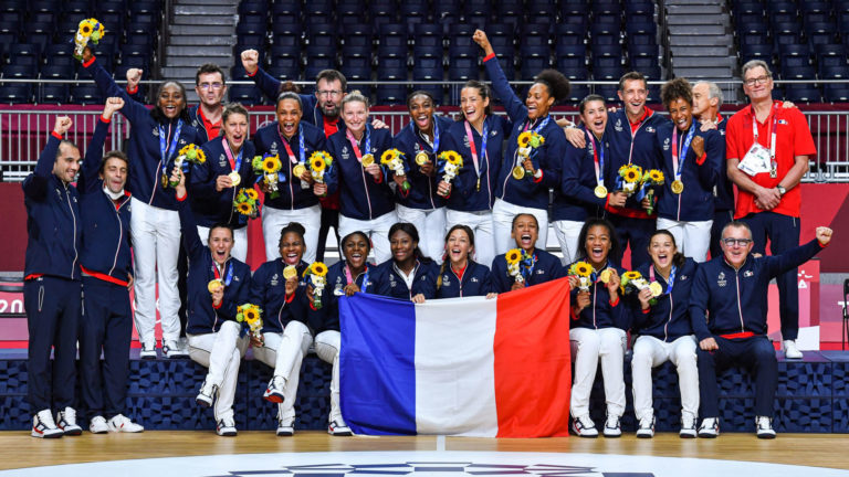 506 C’est un match pas comme les autres qui attendait les handballeuses Françaises ce Dimanche matin : un match pour l’or Olympique face au comité Russe. Quel parcours pour l’équipe de France féminine de handball. Après une préparation réussie, il y avait fallu batailler en phase de poules pour se qualifier par la petite porte, avant de dominer en quart, puis en demie et se permettre de disputer à nouveau l’or Olympique, comme à Rio. Avec pour adversaire en finale le « Russian Olympic Committee », une dénomination qui cache maladroitement la Russie pénalisée jusqu’en 2022 en raison d’un dopage organisé d’état, c’est une revanche de la finale des JO de Rio en 2016 qui se profilait sous les yeux des handballeurs français médaillés d’or et supporters du jour. Avantage France Si l’équipe de France a démarré le match en obtenant deux jets de 7m, témoignant d’un manque de discipline Russe, elle a aussi signé deux pertes de balles dans les 5 premières minutes. Une certaine fébrilité, témoignage de l’enjeu de cette finale Olympique, mais sans conséquence dramatique. Rapidement, Laura Flippes obtenait la suspension de Kuznetsova pour deux minutes, la première supériorité numérique qui, à défaut de donner un avantage solide, permettait aux bleues de prendre les devants (3-4, 10′). Dans une phase de jeu plutôt favorable, les handballeuses Françaises prenaient le premier avantage de deux buts sur un jet de 7 mètres de Béatrice Edwige. Mais il ne fallait que quelques minutes aux Russes pour recoller via un jet de 7 mètre d’Ekaterina Ilina, puis un tir imparable de Daria Dmitrieva (6-6, 14′). Une interception de Méline Nocandy n’était pas récompensée avant que les deux équipes ne se neutralisent pendant plusieurs phases de jeu. Cependant, après quelques minutes, le nouvel avantage était créé et appuyé coup sur coup par le bras droit de Chloé Valentini (7-9, 18′). Anna Vyakhireva profitait d’une suspension de deux minutes pour placer sa spéciale et rester au contact. Pourtant c’est bien l’équipe de France qui continuait de faire le chemin en tête (9-12, 23′) alors que Grâce Zaadi sortait pour deux minutes après avoir terrassé Ana Sen. Pourtant, l’infériorité était une nouvelle fois sans conséquence puisque Poline Vedekhina sortait à son tour quelques secondes plus tard et laissait la place à un joli lob sur jet de 7 mètres de la part d’Alison Pineau avant que Pauletta Foppa signe le +3 (11-14, 26′), son cinquième but en cinq tentatives. Désormais solidement en tête à la mi temps, les handballeuses Françaises s’offraient l’avantage psychologique à 30 minutes du dénouement : 13-15 Une belle bataille A l’aube de la seconde mi temps, les Bleues se perdaient dans un jeu trop rapide, malgré leur avance au score, et signaient plusieurs attaques stériles. Seulement, Kuznetsova écopait de deux minutes après un plaquage sur Niakaté, sa deuxième suspension de la partie qui ne payait pas pour la France, au gré d’une attaque virulente de quasiment 2 minutes et d’une contre attaque Russe qui remettait le match à niveau (16-16, 38′). Cependant il n’en fallait pas plus pour réveiller les Bleues qui scoraient coup sur coup par l’intermédiaire d’Océane Sercien Ugolin (16-18, 39′). Au rythme des « davaï » venus de la touche, les Russes durcissaient leur défense mais Pauletta Foppa venait inscrire une nouvelle fois le +3. Par la suite, Chloé Valentini sortait de sa boite pour intercepter un précieux ballon et donner à Pauline Coatanea la passe décisive du +4 (16-20, 42′), suivi d’un but rageur de Grâce Zaadi après un « spin move » savoureux pour le +5, puis d’un nouveau but de l’inébranlable Pauletta Foppa pour le +6 (16-22, 45′) occasionnant un temps mort de panique du côté Russe. L’or au bout du chemin Bien aidées par une Cléopatre Darleux impeccable depuis le début de la mi temps (6 arrêts / 9 tirs), les handballeuses Françaises abordaient les 15 dernières minutes avec un bel avantage à gérer. Et si les débats se tendaient dans les minutes suivantes, avec notamment plusieurs interceptions Russes, le score restait solidement à l’avantage tricolore (26-21, 52′). Après un temps mort, Anna Vyakhireva trouvait la lucarne pour relancer les siennes et un marcher de Laura Flippes donnait l’occasion aux Russes de réitérer, mais Méline Nocandy chipait un ballon pour aller s’imposer seule face au but. (23-28, 55′). Et si le sursaut d’orgueil Russe leur permettait d’animer les débats, les bleues restaient redoutablement solides alors que la Marseillaise descendait des tribunes à l’initiative de l’équipe de France masculine. Chloé Valentini fermait la boutique (30-24, 29′) et assurait l’or Olympique pour la première fois de l’histoire de l’équipe de France de Handball : 30 – 25 Les statistiques FranceMéline Nocandy : 2 buts en 3 tirsPauline Coatanea : 3 buts en 5 tirsChloe Valentini: 4 buts en 5 tirsAllison Pineau : 7 buts en 10 tirsCoralie Lassource : 0 but en 1 tirGrâce Zaadi : 2 buts en 4 tirsOceane Sercien Ugolin : 2 buts en 2 tirsLaura Flippes : 2 buts en 3 tirsPauletta Foppa : 7 buts en 7 tirsEstelle Nze Minko : 1 but en 1 tir Amandine Leynaud : 3 arrêts sur 15 tirsCléopatre Darleux : 9 arrêts en 21 tirs ROCPolina Gorshkova : 3 buts en 4 tirsDaria Dmitrieva : 6 buts en 10 tirsAnna Sen : 0 but en 1 tirAnna Vyakhireva : 4 buts en 8 tirs Polina Vedekhina : 7 buts en 10 tirsVladlena Bobrovnikova : 1 but en 1 tirOlga Fomina : 0 but en 1 tirEkaterina Ilina : 2 buts en 4 tirsLuliia Managarova : 1 but en 1 tirAntonina Skorobogatchenko : 1 but en 4 tirs Anna Sedoykina : 4 arrêts sur 28 tirsViktoriia Kalinina : 1 arrêt sur 7 tirs Crédit photo : DR (réseaux sociaux de l’équipe de France de handball)