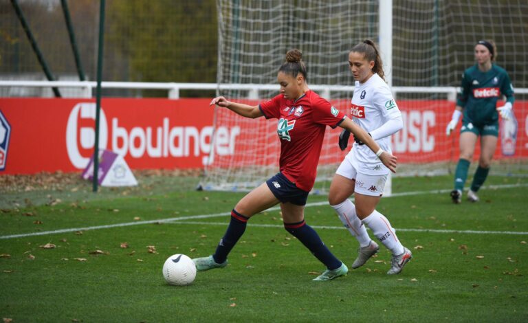 503 Le FC Metz a été éliminé par le LOSC et sort dès son entrée en lice en coupe de France. Au terme d’un match très disputé les Messines ont chuté dans la terrible séance de tirs au but. Après une édition 2020 annulée à cause de la crise sanitaire, la Coupe de France faisait son grand retour chez les féminines. Et pour son entrée en lice, le FC Metz se déplaçait sur la pelouse du LOSC. Un match qui sentait la poudre et la revanche. Les Messines remportaient six jours plus tôt leur duel à domicile face aux Lilloises en championnat. Une défaite au goût amer pour les Nordistes, prétendantes au titre… Et une réelle envie de se relever face à des Grenats en pleine bourre. Marjorie Boilesen découvre la Coupe de France – Crédit photo : Marc Van ceunebroeck/LOSC Officiel Un match très disputé Il aura fallu attendre la terrible séance de tirs au but pour se départager. Les joueuses du FC Metz ont tout donné face au LOSC et ont tenu en échec les protégées de Rachel Saidi jusqu’au coup de sifflet final. Et pour l’occasion, c’est Sabrina Locas qui avait été préférée à Justine Lerond pour tenir les cages messines. La gardienne numéro 2 des grenats a su répondre présente pour ce défi. A l’instar de Florie Saint-Cricq, Léonie Richard et Allison Blais également titulaires pour l’occasion. Mais malheureusement, ce sont les Lilloises qui ont remporté la fatidique séance de Tirs au but 3-0. Aujourd’hui on accepte la défaite. Demain on se remet au travail… Jessica Silva, pragmatique après cette élimination prématurée. Crédit photo : Julien Buret/LGM Beaucoup de déception. Les deux équipes ont eu des opportunités, c’était plutôt équilibré. Sabrina (Locas) a fait un très bon match avec quelques arrêts décisifs. Toutes les joueuses ont fait fait un bon match de football, les titulaires comme les remplaçantes. Perdre aux penaltys c’est jamais facile. Mais maintenant place au championnat. Cela va nous permettre de souffler lors des prochaines dates. On va travailler sur les points où on doit progresser. On a maintenant un dernier match cette année à Vendenheim qui s’annonce compliqué. Aujourd’hui on accepte la défaite. Demain on se remet au travail et on sera meilleures pour les prochaines échéances. Prochain RDV pour les grenats, le dimanche 05 décembre en championnat à Vendenheim pour le dernier match de l’année 2021. Propos recueillis par : Gérald RusselloCrédit photos : Marc Van ceunebroeck/LOSC Officiel et Julien Buret/LGM