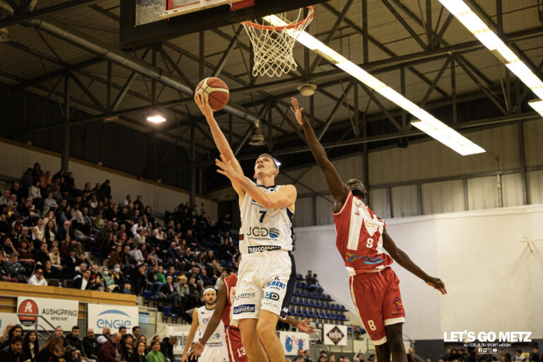 382 Les Metz Canonniers ont dû attendre la toute fin du quatrième quart-temps pour écarter définitivement la vaillante formation de Maubeuge, ce samedi au Complexe Saint-Symphorien. Succès 79-69 pour les hommes d’Anthony Tomba. Que ce fut dur pour les Metz Canonniers face à Maubeuge ! « On savait que ça allait être un match compliqué, c’est la meilleure défense de la poule. C’est une équipe très athlétique. Mais cette victoire est bonne à prendre ! », souligne Alexandre Karolak, dans tous les bons coups samedi soir. Ses 23 points n’ont pas été de trop pour mener Metz BC au succès. L’arrière a su faire la différence dans le money time, bien aidé par un autre K : Kévin Kaly. Le capitaine messin a définitivement enterré les espoirs des visiteurs grâce à un tir clutch à 3 points, à 1 minute et demie du terme (73-67, 39′). Il fallait au moins ça pour créer un écart définitif, contre une vaillante formation nordiste, qui aura été au contact tout le match. Les Canonniers ont mis du rythme Tout n’a pas été parfait pour les Canonniers. Anthony Tomba compte d’ailleurs bien « bosser sur les lacunes » de son équipe. Mais les Grenats ont tenté de mettre du rythme face à une formation réputée défensive. « On a essayé de mettre du rythme et on fait une bonne deuxième mi-temps défensivement. Je pense que c’est ça qui nous fait gagner. Mais en attaque, pour mettre du rythme, il faut aussi du banc et des rotations de qualité. On tire beaucoup sur les mecs », explique l’entraîneur messin, qui ne dispose pas de toutes ses forces vives depuis plusieurs matchs. Des rotations limitées Les Canonniers n’étaient que huit ce samedi. La faute aux absences de Guérandel, Ory et Mbaye. « On remercie Luc (Guerra, capitaine de la réserve) d’être là et de faire toutes les semaines avec nous. Les semaines sont difficiles en ce moment. Loïc (Akono) se reblesse et ne peut pas jouer en deuxième mi-temps. A l’entraînement, on a tendance à faire attention à ne pas en faire trop pour éviter d’autres blessures. On travaille dans l’incertitude », concède Anthony Tomba. Ce n’est d’ailleurs pas anodin si l’entraîneur messin espère attirer prochainement un joueur capable de jouer sur les postes 3, 4 et 5. « On a des gros matchs qui arrivent, y compris la semaine prochaine à Furdenheim où ce sera plus que compliqué », prévient le technicien. Metz Canonniers 79-69 Maubeuge Mi-temps : 37-37 (Quart-temps : 18-17, 19-20, 21-20, 21-12)Marqueurs Metz Canonniers : Akono 0, Bouvret 10, Guerra 0, Karolak 23, Dardaine 11, Kaly (c) 18, Pourchot 4, Florimont 13Marqueurs Maubeuge : Mouliom 16, Mavinga 7, Gassama 10, Gacko (c) 8, Raguette 12, Simms 10, Mathez 0, Stamatiades 0, Yanibada 0, Marx 6 Le classement de la poule D de Nationale 2 Crédit photo : Lilian Bordron/LGM