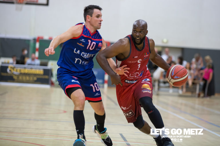334 Les Metz Canonniers et Beaujolais s’étaient donnés rendez-vous au complexe Saint Symphorien en match en retard de la 13e journée de Nationale 2. Après un match long et usant, ce sont les Grenats qui sont allés chercher leur 14e succès en championnat. Dès l’entame, Karolak servait Macouangou, d’une belle passe dans le dos. Après de bons efforts défensifs, Metz parvenait à prendre 4 unités d’avance. Le lituanien Valukonis ouvrait, quelques instants plus tard, le compteur du Beaujolais Basket. Ory, qui commettait sa deuxième faute était remplacé par Akono. Les Canonniers baissaient en intensité et Seyeh en profitait pour inscrire 3 paniers consécutifs. Les visiteurs passaient devant (6-8, 5′). Geoffrey Karolak, qui coachait en lieu et place de Stéphane Frentzel suspendu, prenait alors un temps mort. Florent Pietrus jouait des coudes face à Douillet et remettait Metz sur le bon chemin. Les locaux haussaient le ton en défense. Akono en profitait pour inscrire ses 3 premiers points du soir (ils seront nombreux). Metz reprenait alors l’avantage et virait en tête à la fin du 1er quart-temps (18-11). Jeu égal entre Messins et Beaujolais Kevin Kaly parvenait à creuser l’écart avec un magnifique panier à trois points. Akono imitait son coéquipier, +12 pour Metz. Dimetrov répondait avec un magnifique 3 points. Le rythme s’accélérait et Kaly inscrivait son deuxième tir primé. Beaujolais essoufflait les grenats, déjà à 10 fautes d’équipes avant la mi-temps. Loic Akono sortait son arc pour enfiler deux nouveaux tirs à 3 points. L’écart se maintenait autour des 10 points d’avance en faveur de Metz. Après 8 lancers francs pour le Beaujolais, Florimont concluait une belle action messine. Les visiteurs restaient néanmoins au contact. Soumahoro, discret jusqu’à présent, marquait un trois points au buzzer (Mi-temps : 43-38). Loïc Akono en patron Soumahoro redémarrait la seconde mi-temps comme il avait fini la première, avec un 3 points seul dans le corner. De la maladresse messine dans les transmissions permettait à Beaujolais de recoller, Douillet égalisait. Karolak sonnait la révolte en ajoutant trois points au compteur grenat. Akono, véritablement en feu ce soir, plantait déjà son cinquième trois points de la partie (54-47, 25’). Beaujolais parvenait à ralentir les ardeurs mosellanes et Seyeh, en contre attaque, inscrivait un joli shoot en suspension (54-51, 28’). Douillet, bien trouvé, donnait même l’avance au Beaujolais Basket. Macouangou et Pietrus, adroits derrière l’arc, permettaient cependant à leur équipe de repasser devant. Pietrus concluait ce 3e quart temps avec un gros tir à 3 points, au buzzer (60-57). Gary Florimont clutch, à l’expérience Beaujolais s’appuyait sur Seyeh et Dimitrov en ce début de 4ème quart. Paris permettait à son équipe de repasser devant. Akono surgissait encore et permettait à Metz de reprendre les commandes (62-61, 33′). Le match était toujours serré. Florent Pietrus commettait une faute antisportive qui permit à Douillet d’égaliser, à 4 minutes du terme. Mais les Grenats ont retenu la leçon apprise le week-end dernier face à Tremblay. Florimont, décisif au rebond, redonnait une bouffée d’air aux siens. Le pivot inscrivait un joli tir à mi-distance pour donner 4 points d’avance aux Canonniers. Après une bataille acharnée au rebond, Macouangou récupérait le précieux cuir et obtenait 2 lancers francs, qu’il inscrivait. Kaly concluait le bal messin.Victoire 75-67 pour les Metz Canonniers face à Beaujolais. Pas le temps de souffler cependant pour les Messins qui se déplaceront samedi prochain à Joeuf dans un derby capital ! Crédit photo : Matthieu Henkinet/LGM (archives)
